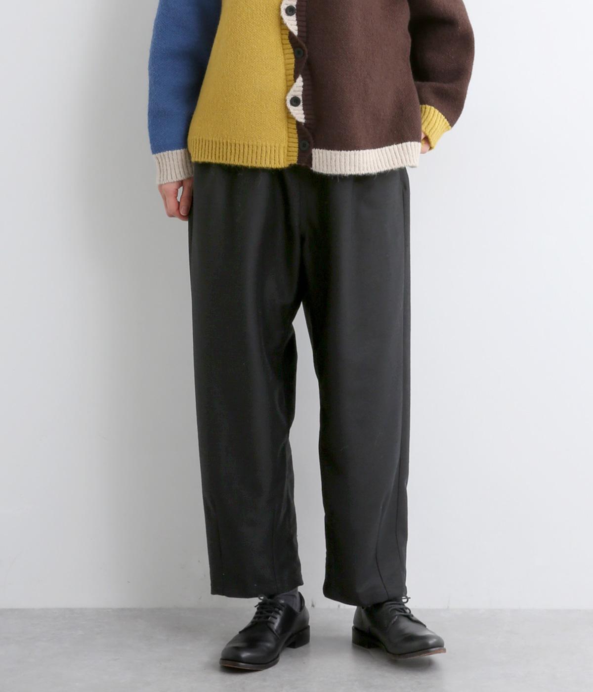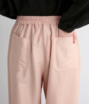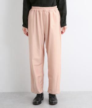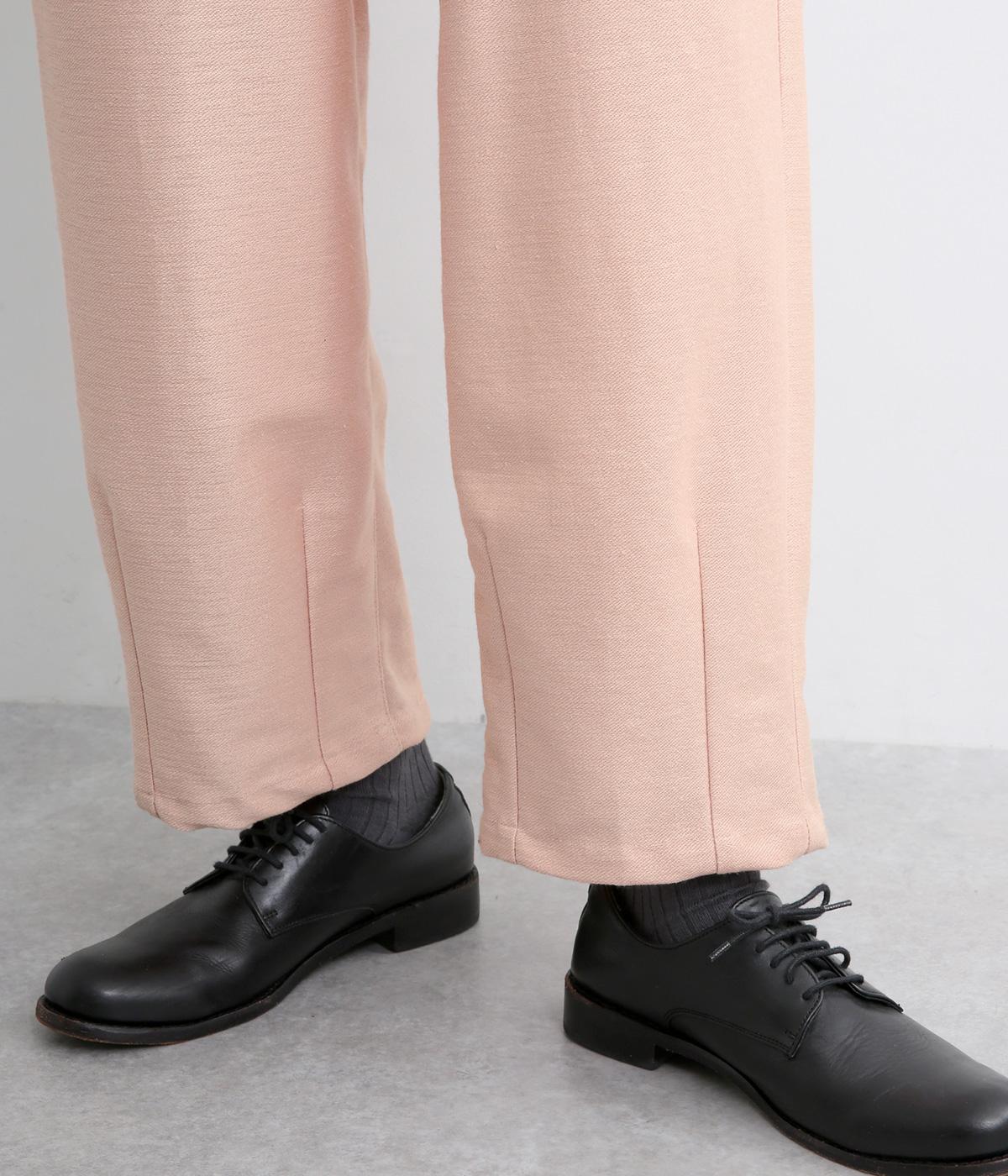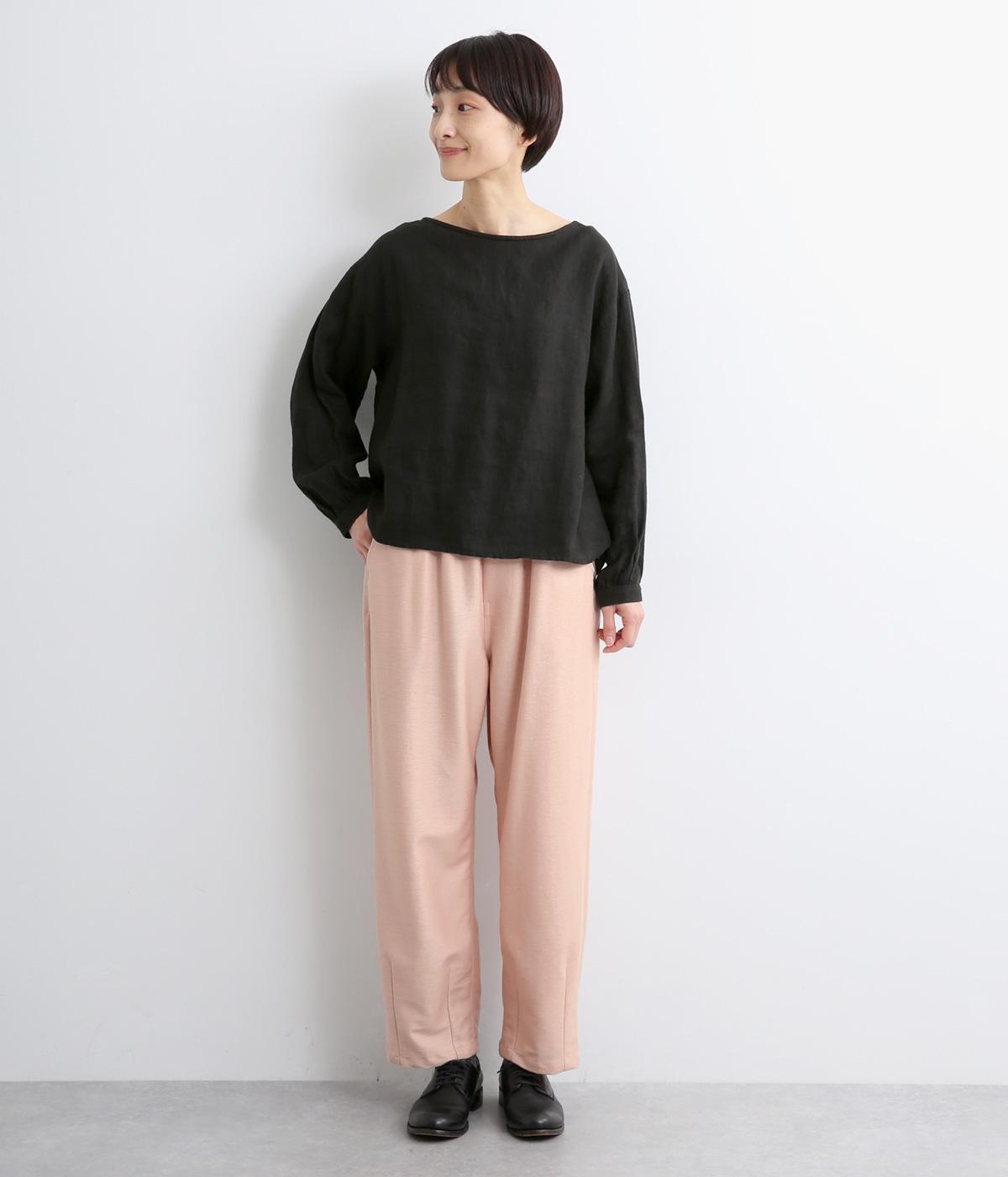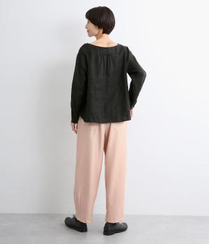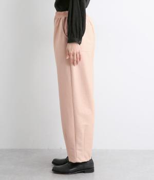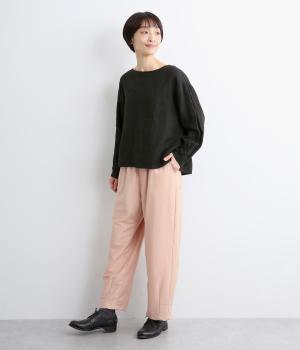 裾にダーツを入れてすっきりまとめたペグトップパンツ。表情のある素材でシンプルなのにこなれ感があります。ウエストはフィット感のいい総平ゴムに配色のきいた内紐入りで微調整も可能。フラットな革靴合わせでメンズライクな装いにも◎。