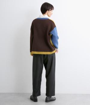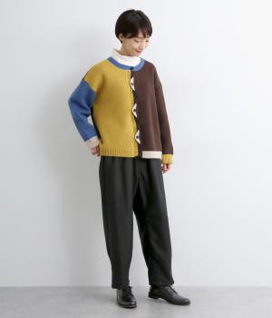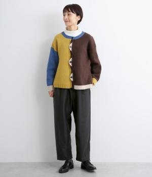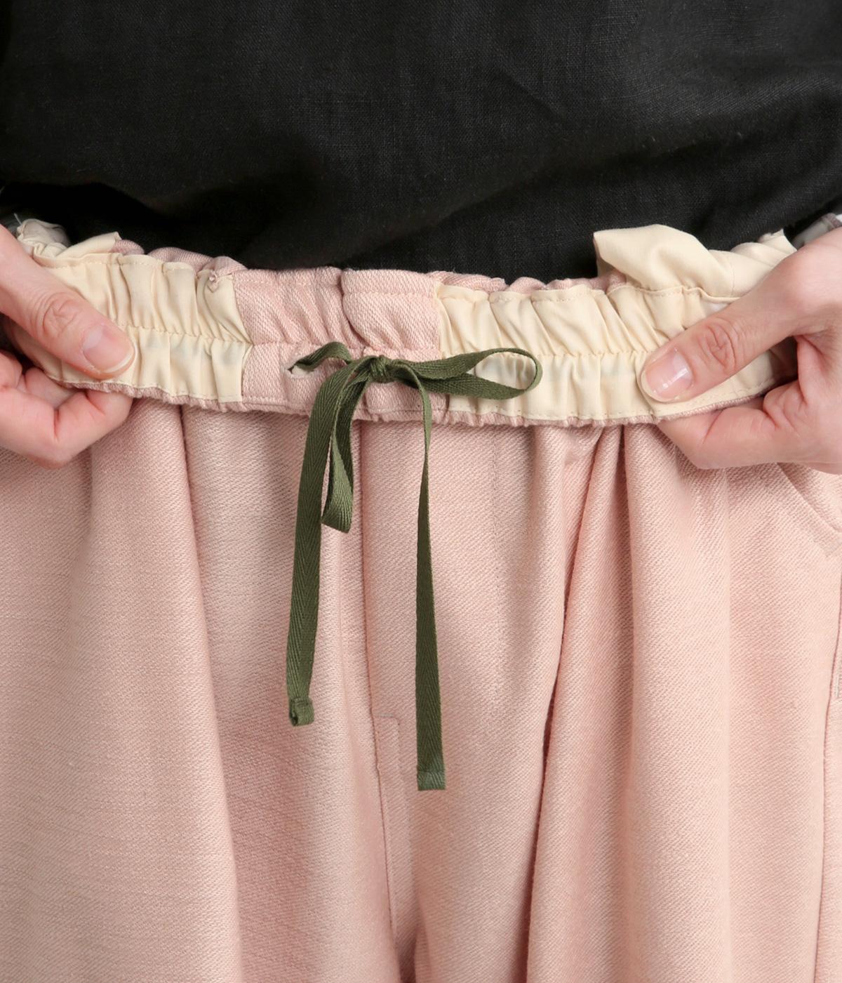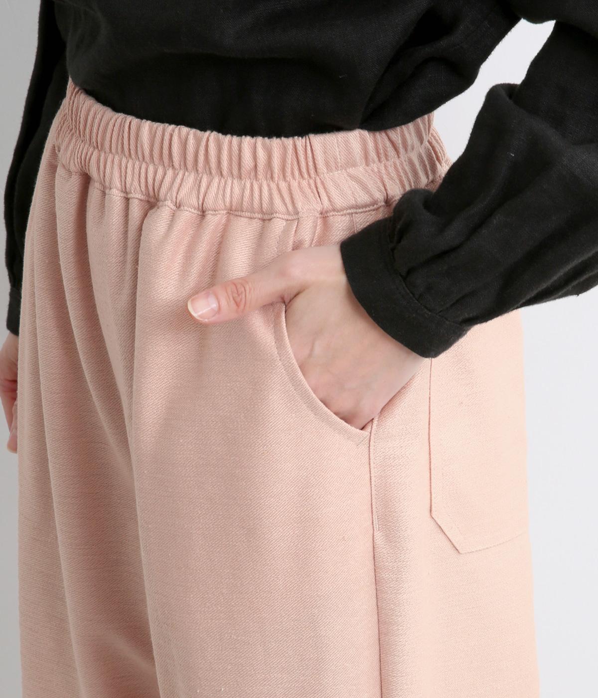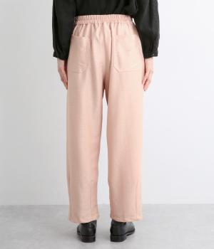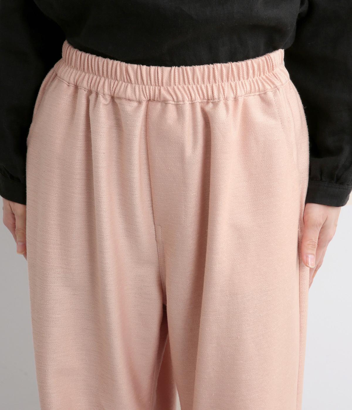 裾にダーツを入れてすっきりまとめたペグトップパンツ。表情のある素材でシンプルなのにこなれ感があります。ウエストはフィット感のいい総平ゴムに配色のきいた内紐入りで微調整も可能。フラットな革靴合わせでメンズライクな装いにも◎。