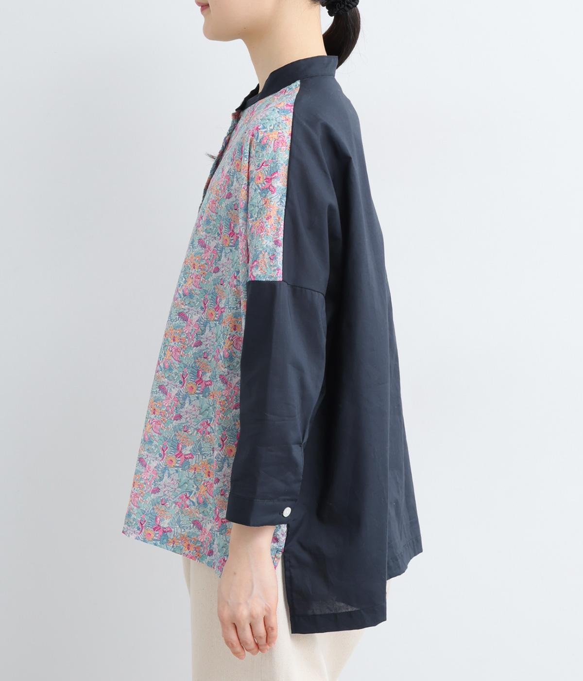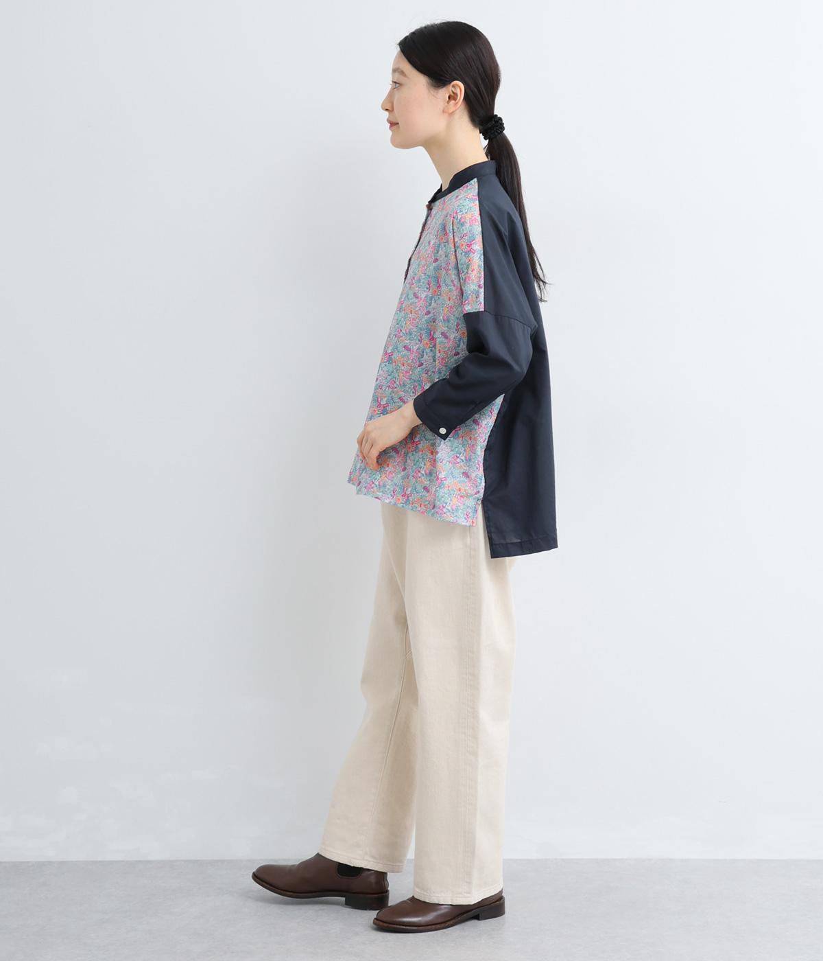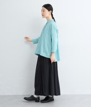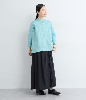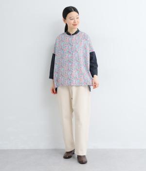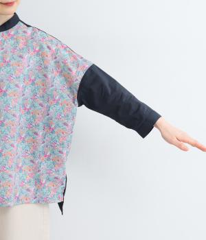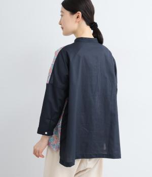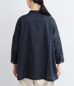 前身頃と後ろ身頃で表情の異なる切り替えデザインが魅力のローン切り替えブラウス。前後差のある裾丈とスリットが動きを演出し、バンドカラーが上品で洗練された印象を与えます。