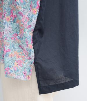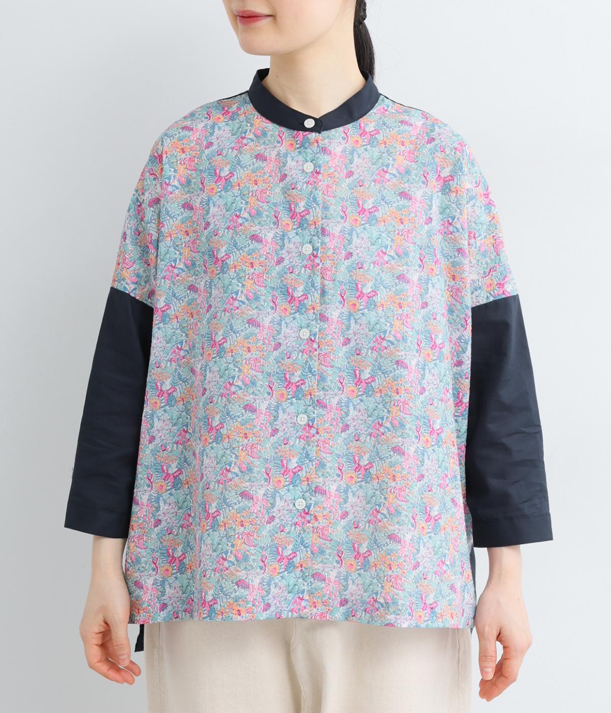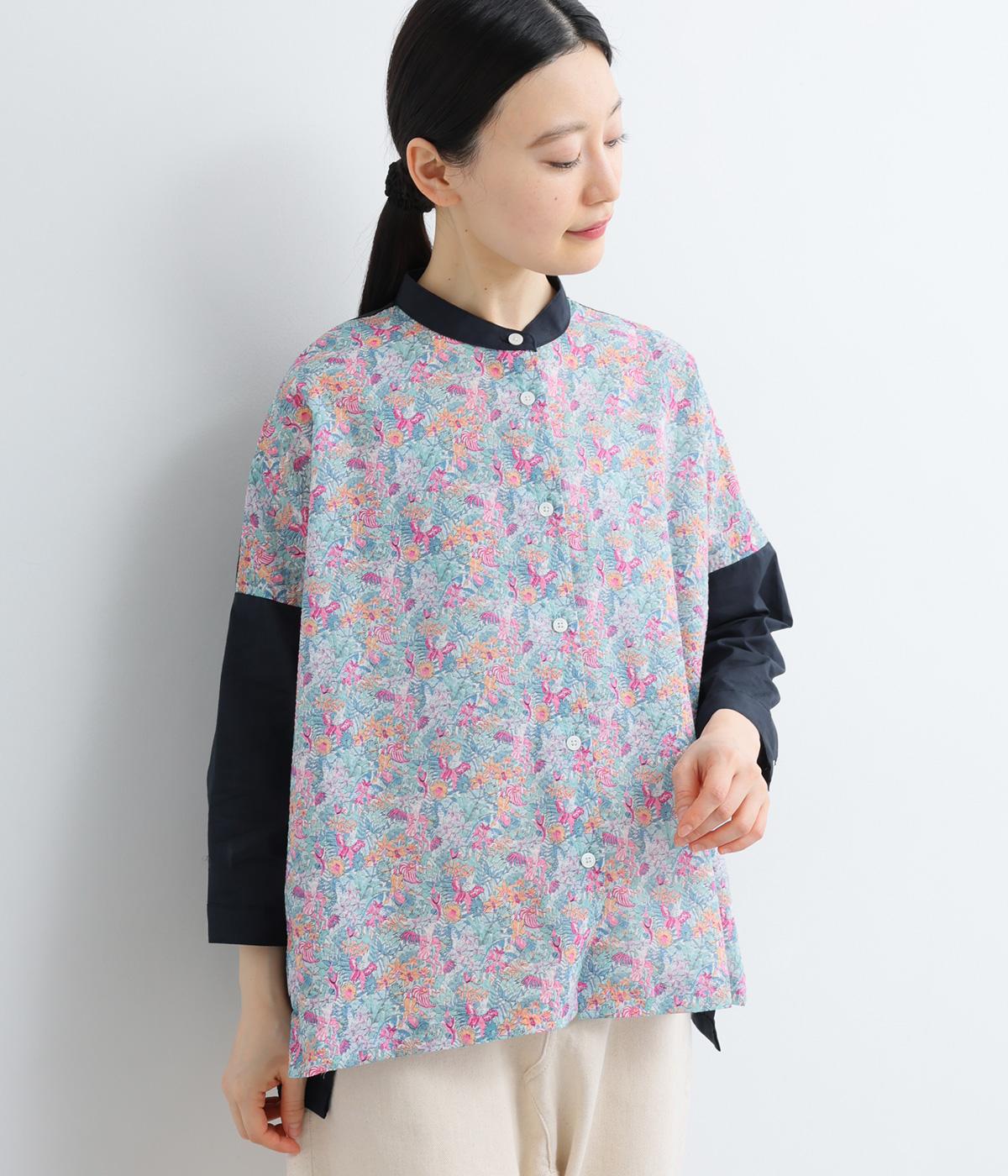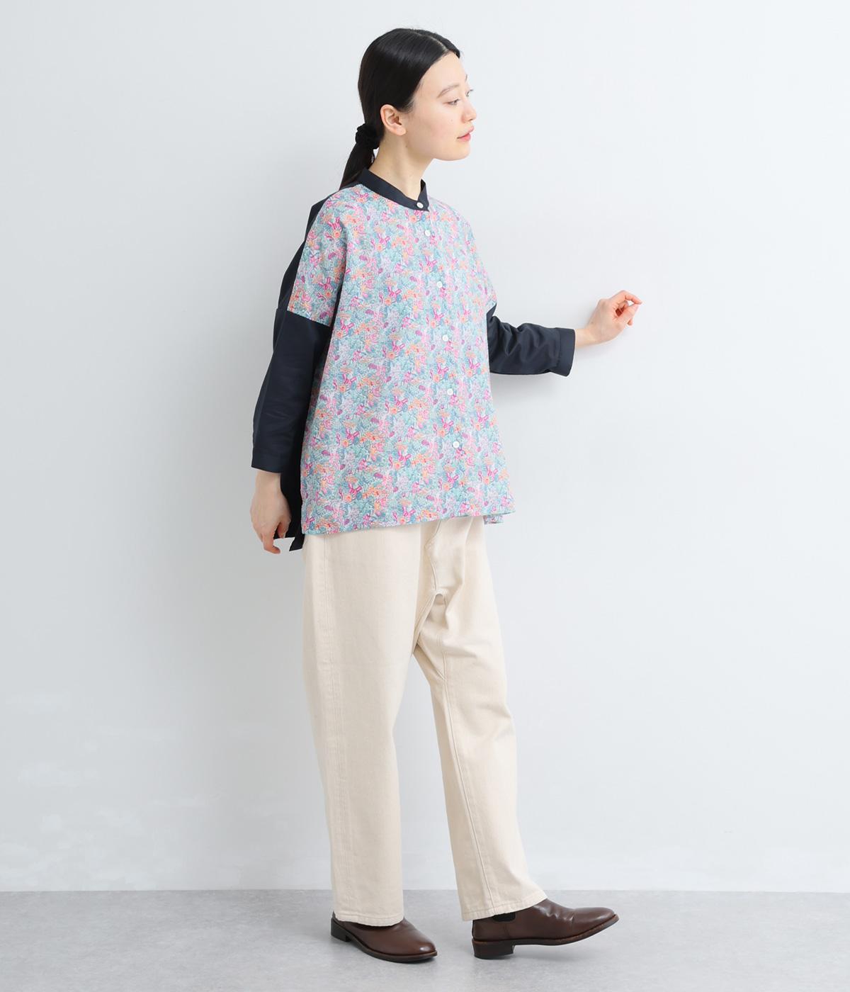 前身頃と後ろ身頃で表情の異なる切り替えデザインが魅力のローン切り替えブラウス。前後差のある裾丈とスリットが動きを演出し、バンドカラーが上品で洗練された印象を与えます。