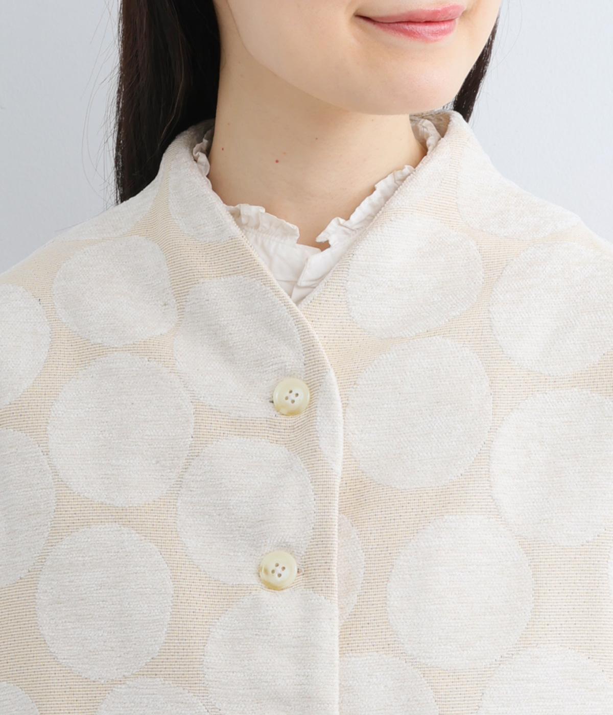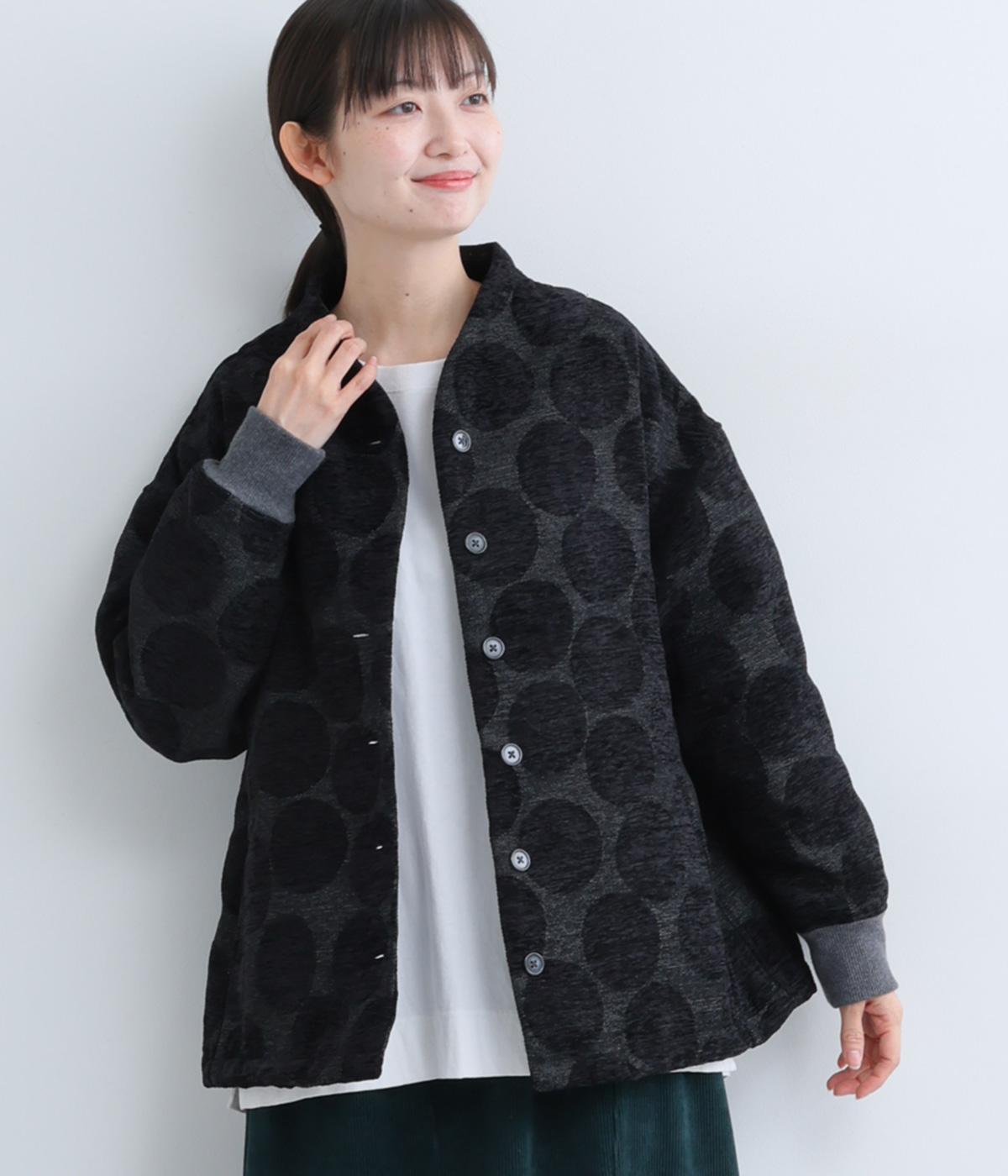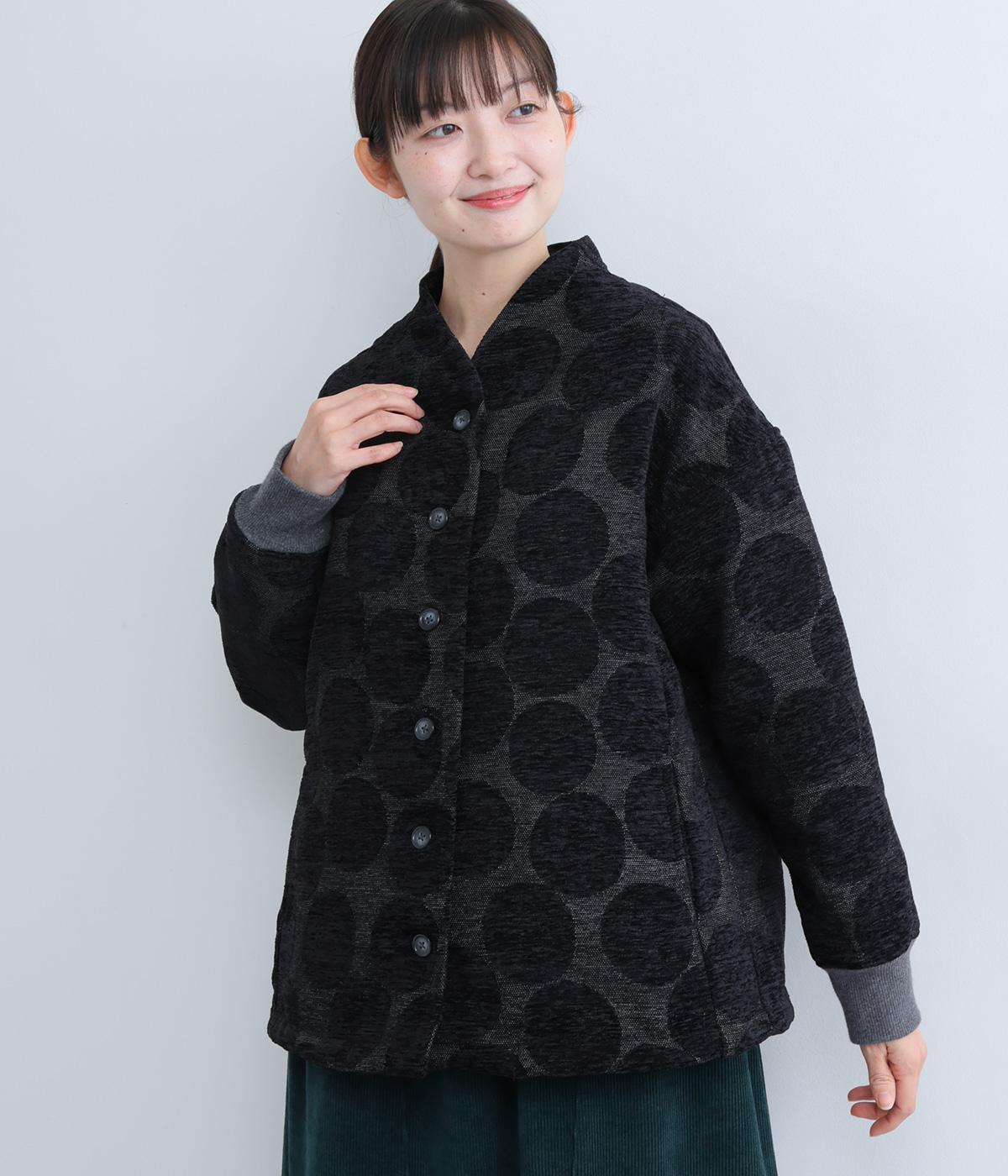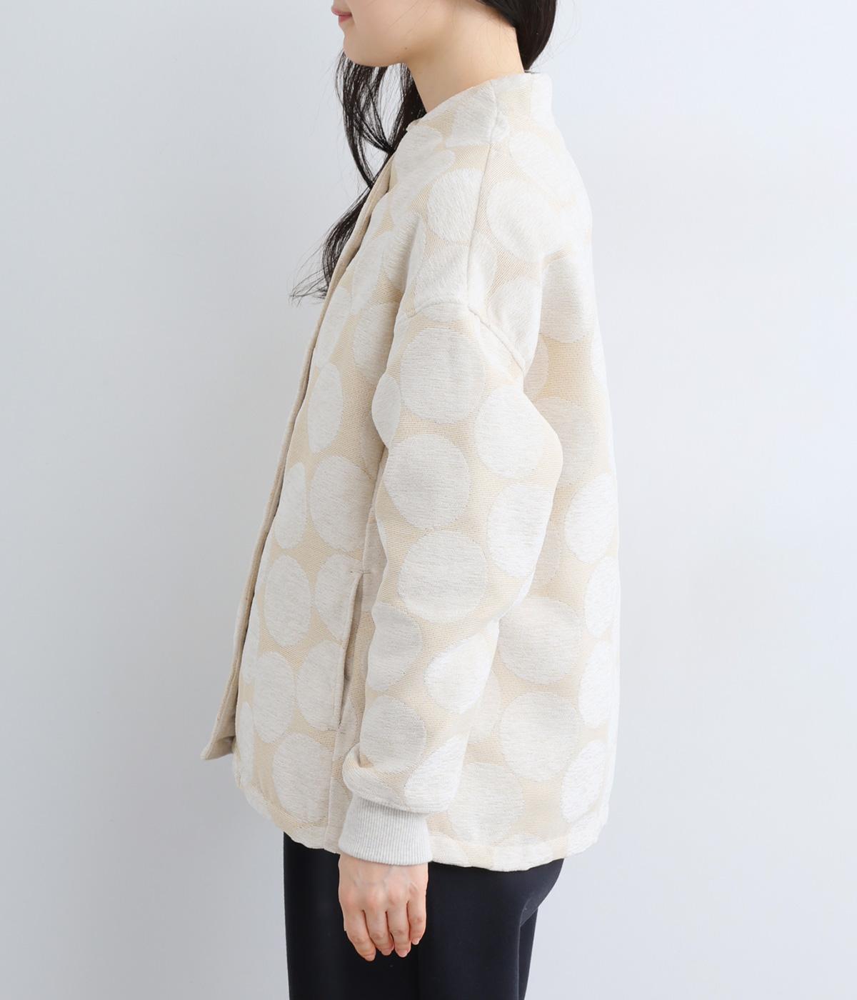 立体感のあるドット柄が目を引くジャケット。ベースと柄の色味が近いので、子どもっぽくならずに上品に着こなせます。きちんと感と女性らしさを両立させる、首元に沿うようにやや立ち上げた襟もポイント。カジュアルにもきれいめにも合わせられ、着こなしの主役になります。