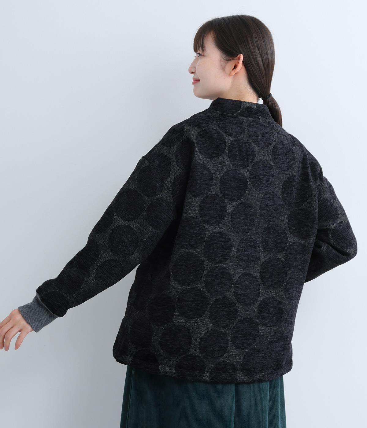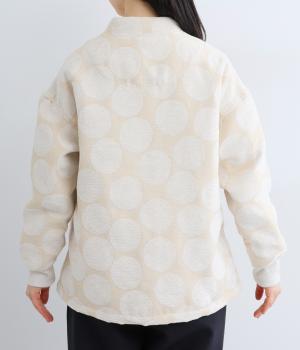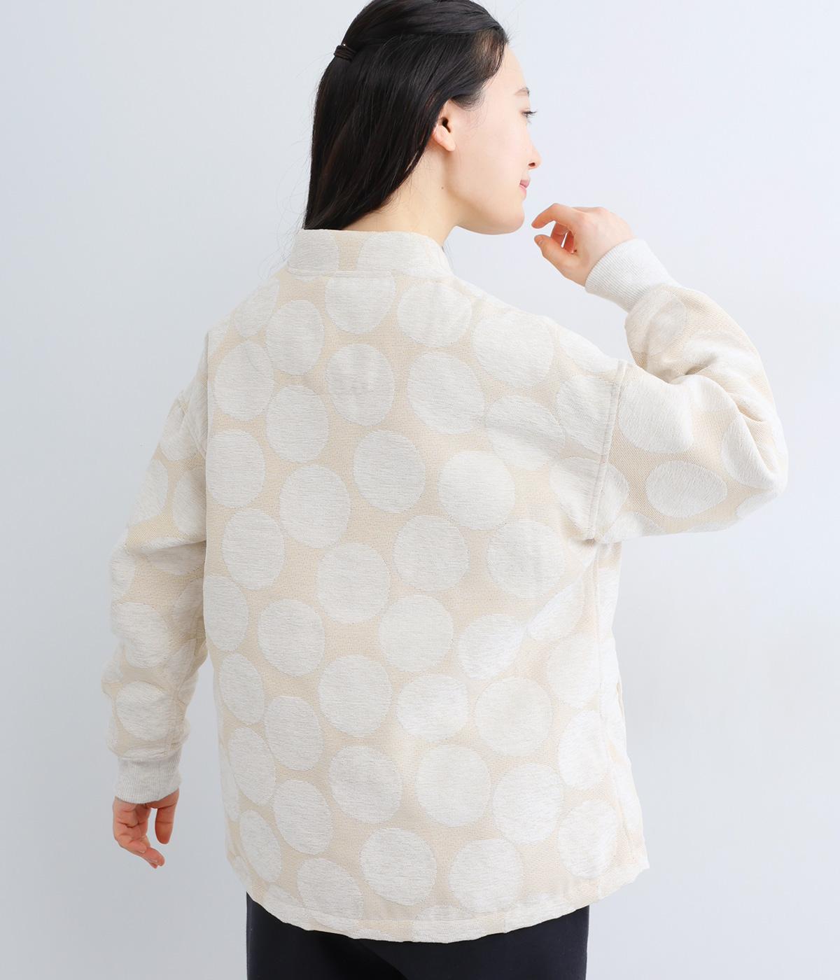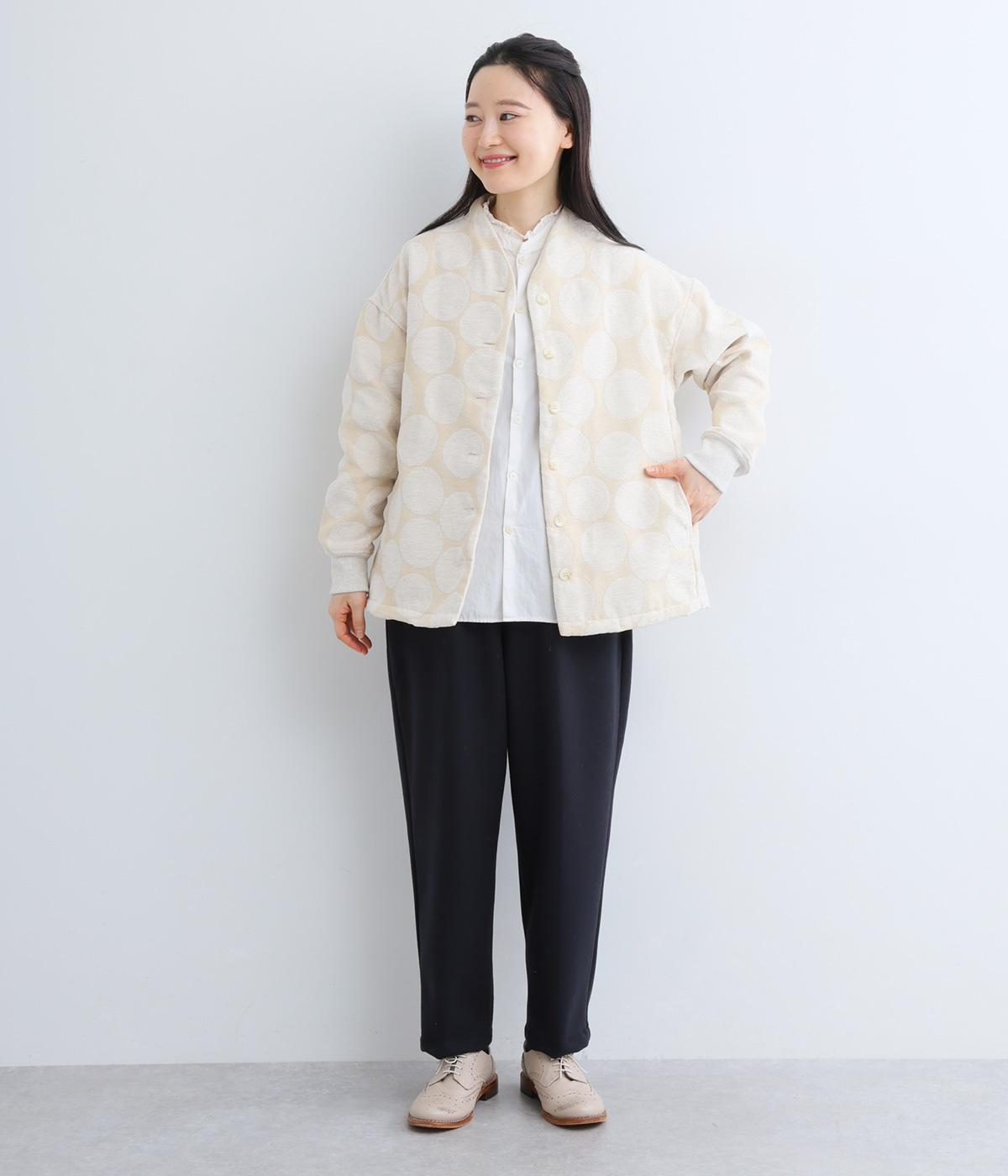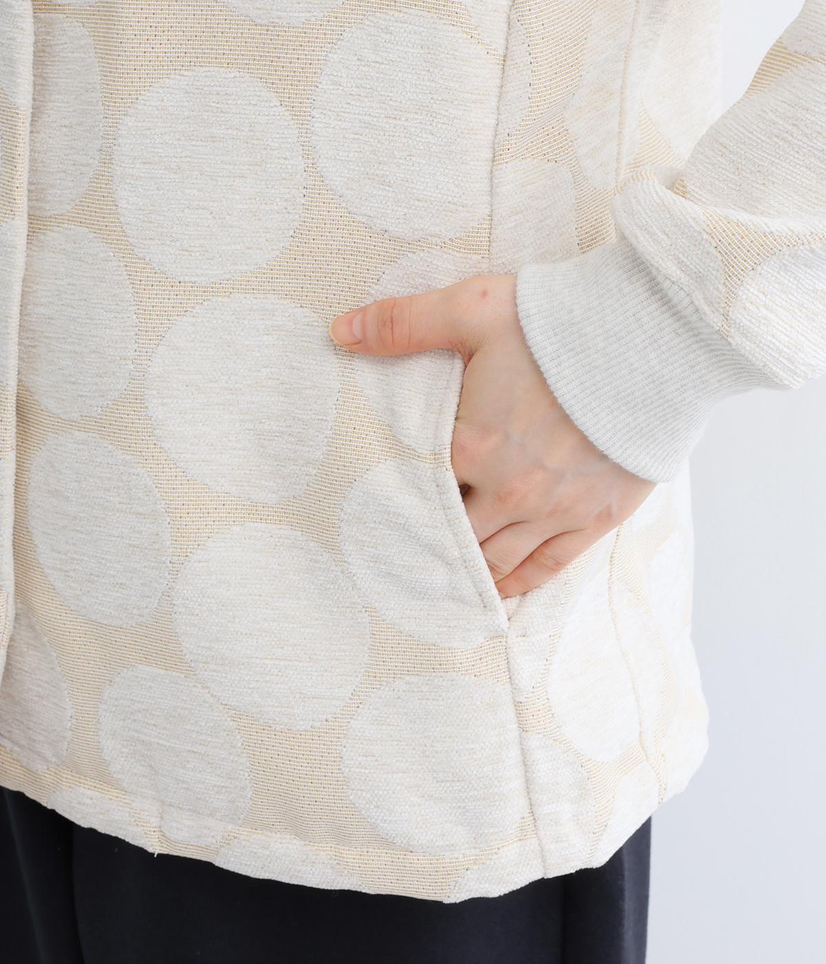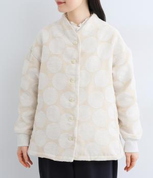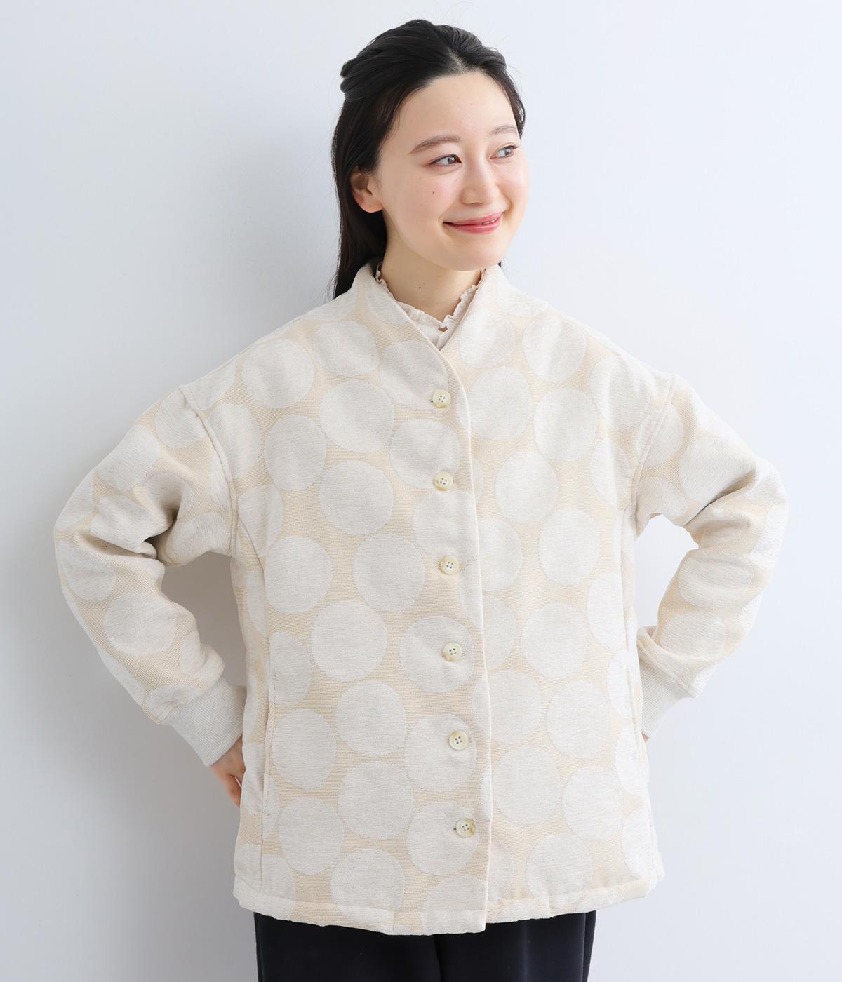 立体感のあるドット柄が目を引くジャケット。ベースと柄の色味が近いので、子どもっぽくならずに上品に着こなせます。きちんと感と女性らしさを両立させる、首元に沿うようにやや立ち上げた襟もポイント。カジュアルにもきれいめにも合わせられ、着こなしの主役になります。