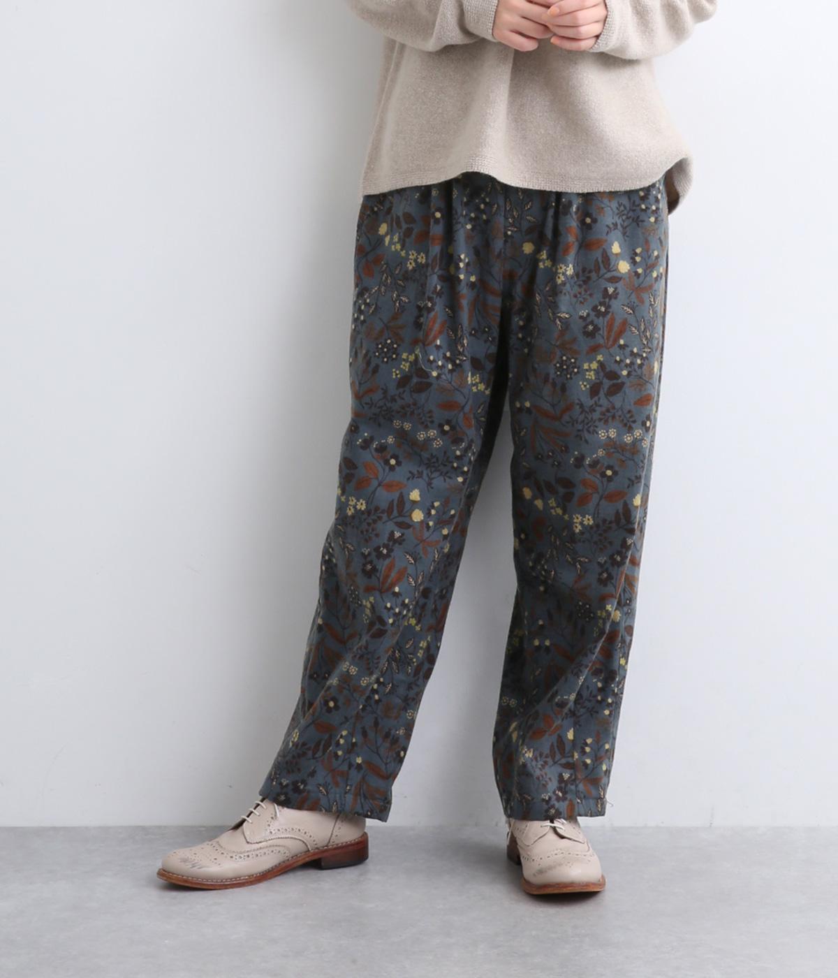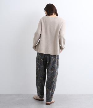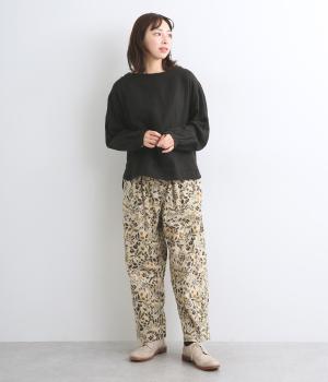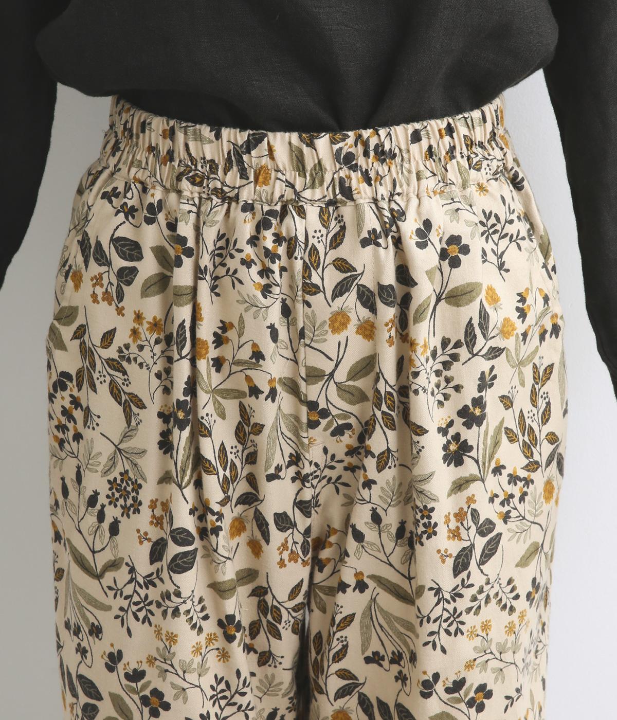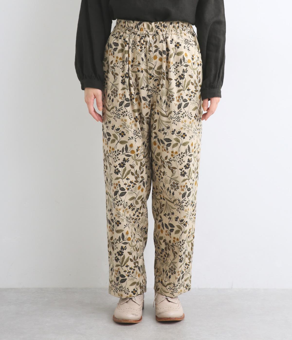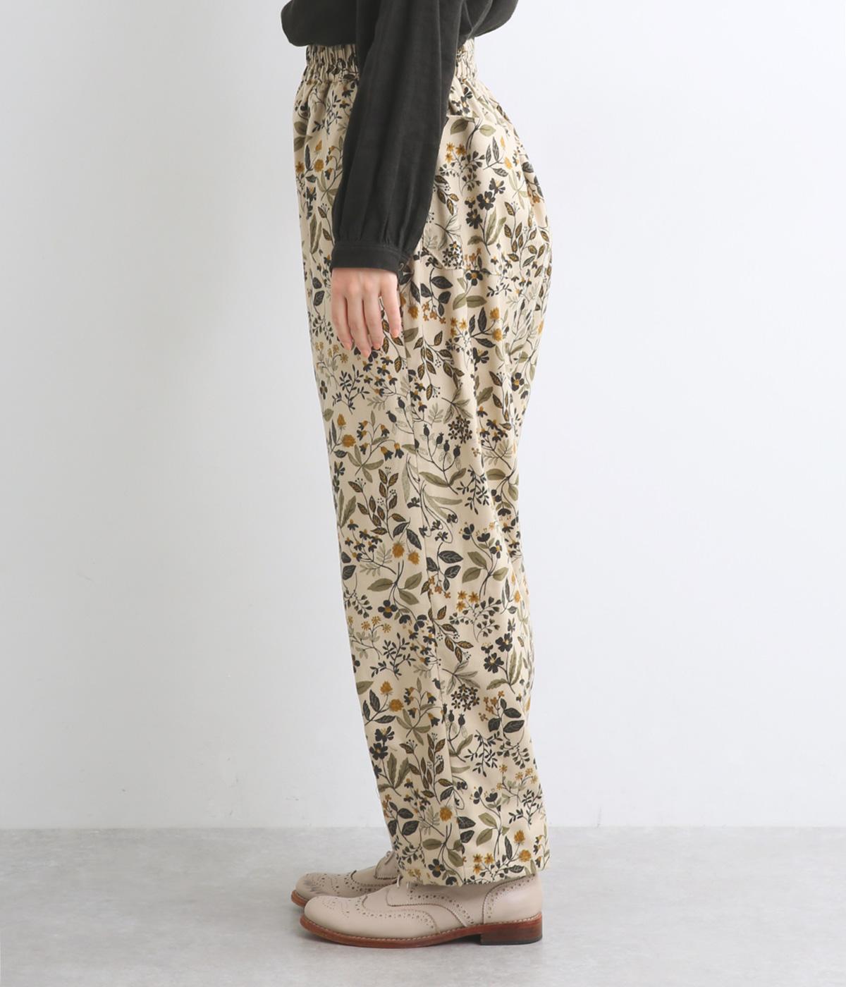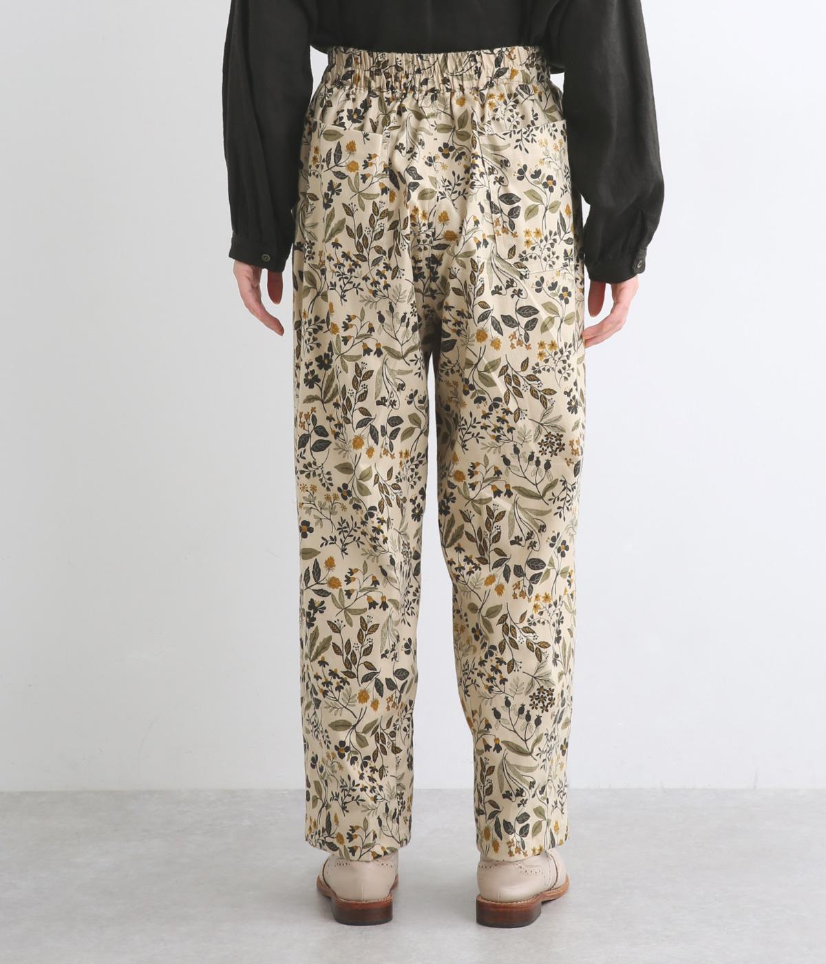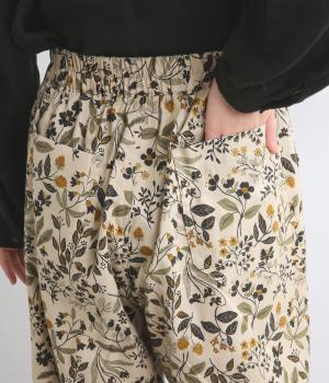 ゆとりのある腰まわりと裾に向かって細くなるペグトップパンツ。個性ある総柄をシックな雰囲気にまとめて、コーディネートに取り入れやすく仕上げました。ウエストは総ゴム使用で紐でサイズ調節が可能です。レイヤードアイテムとしてもおすすめです。