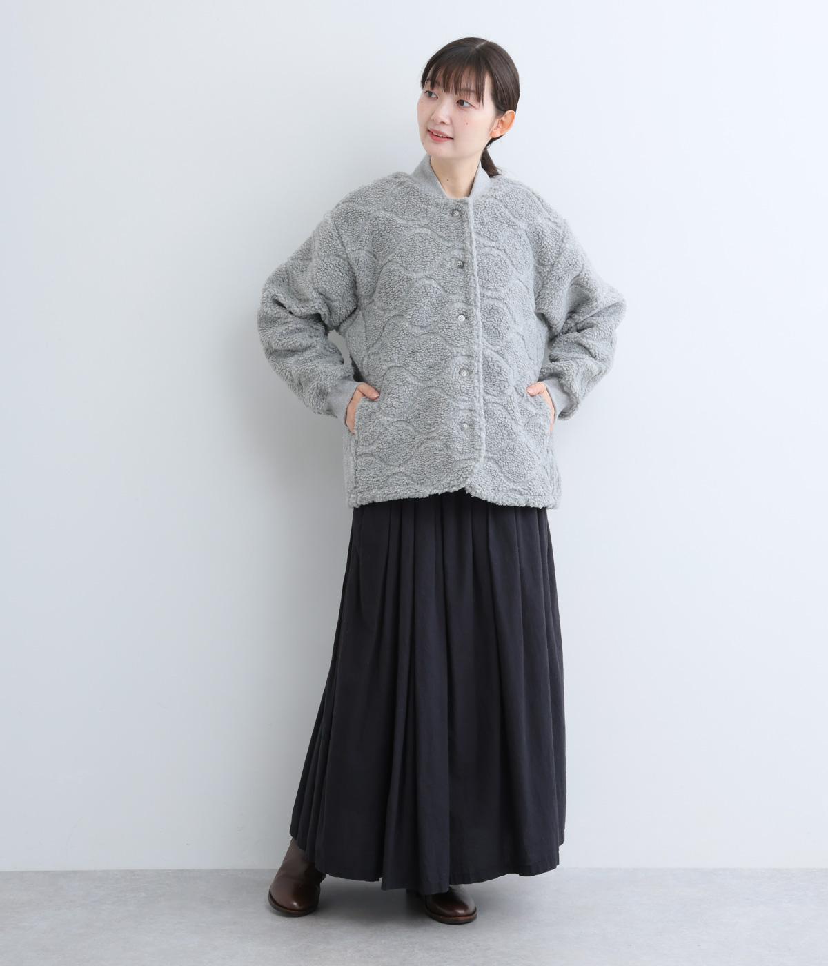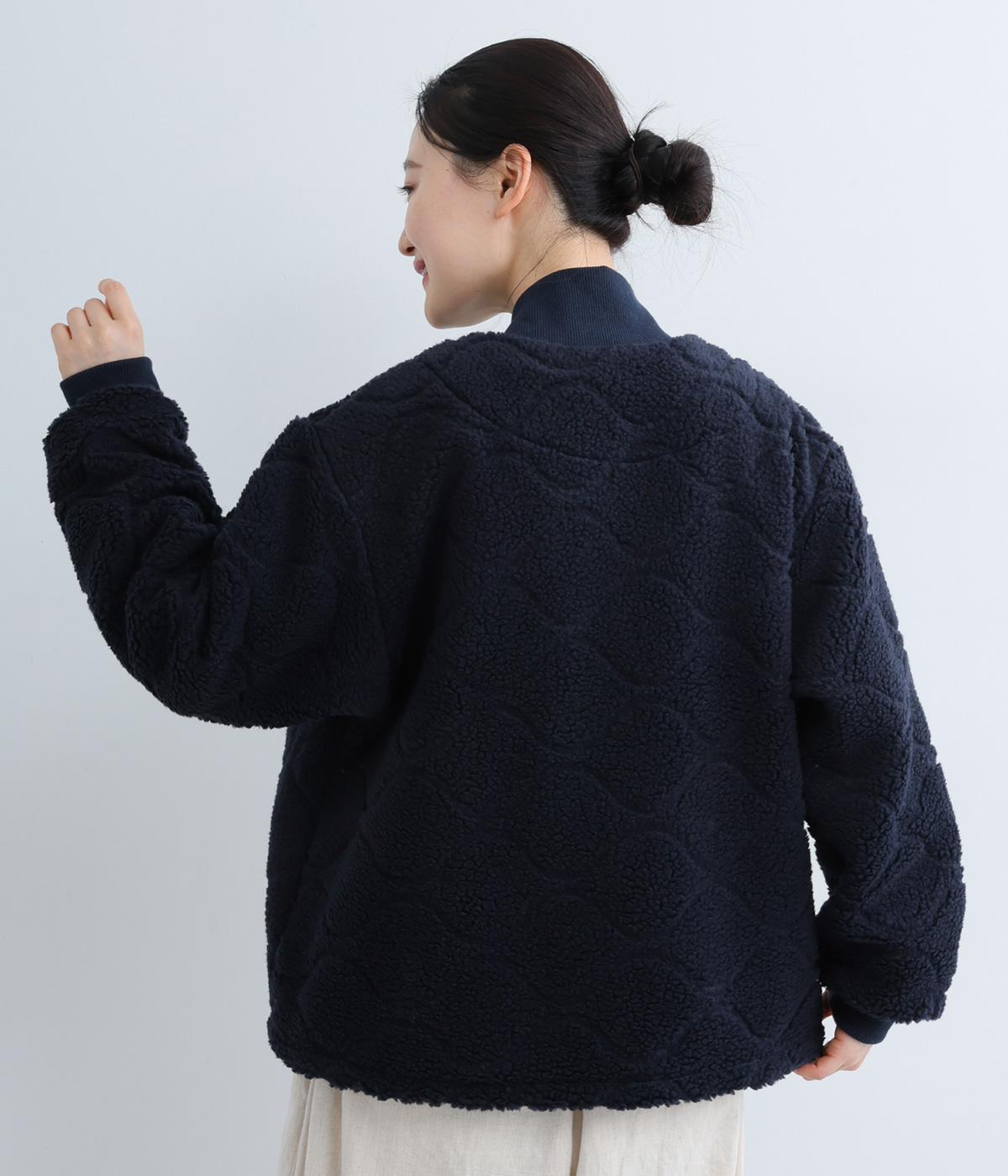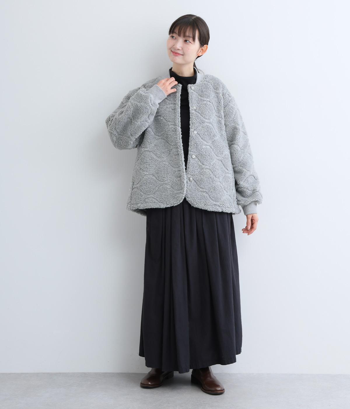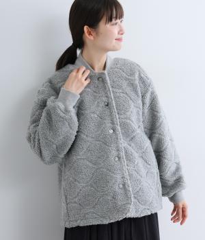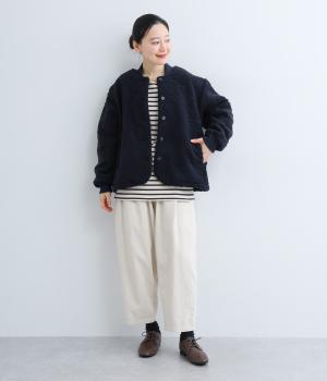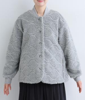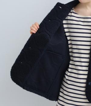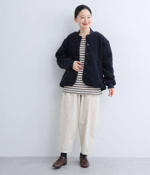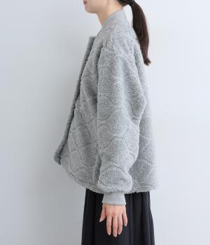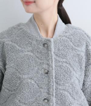 もこもこのボア素材がかわいらしいジャケット。後ろに高さを出した襟と袖口はリブ仕立てで、カジュアルな印象を添えました。前をラウンドさせたヘムラインが女性らしいやわらかな表情をプラス。着丈は長すぎず、合わせるボトムスを選びにくいのもグッドです。