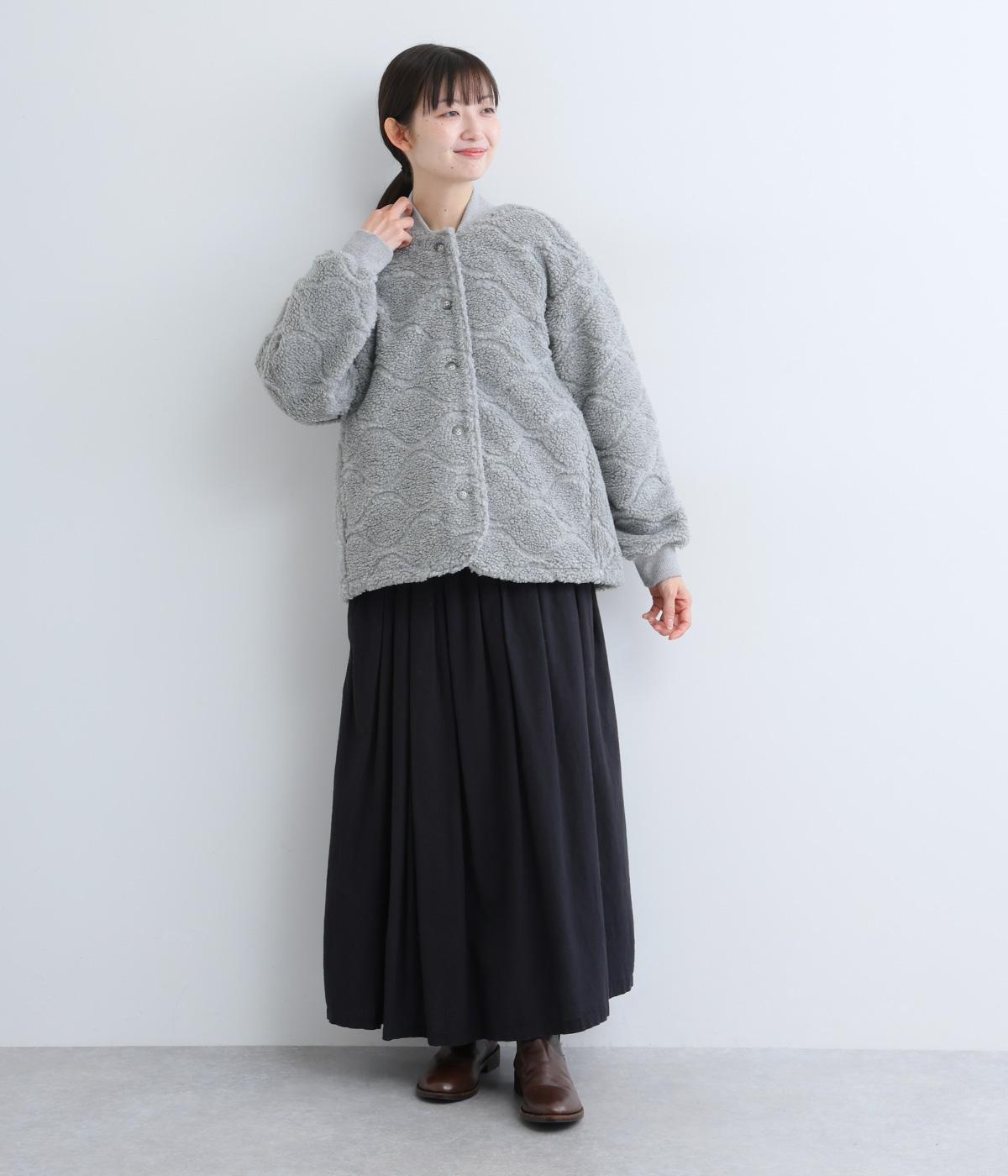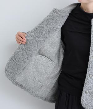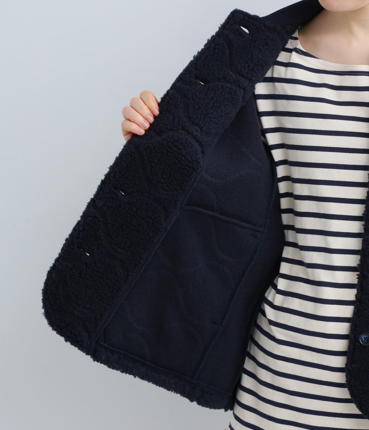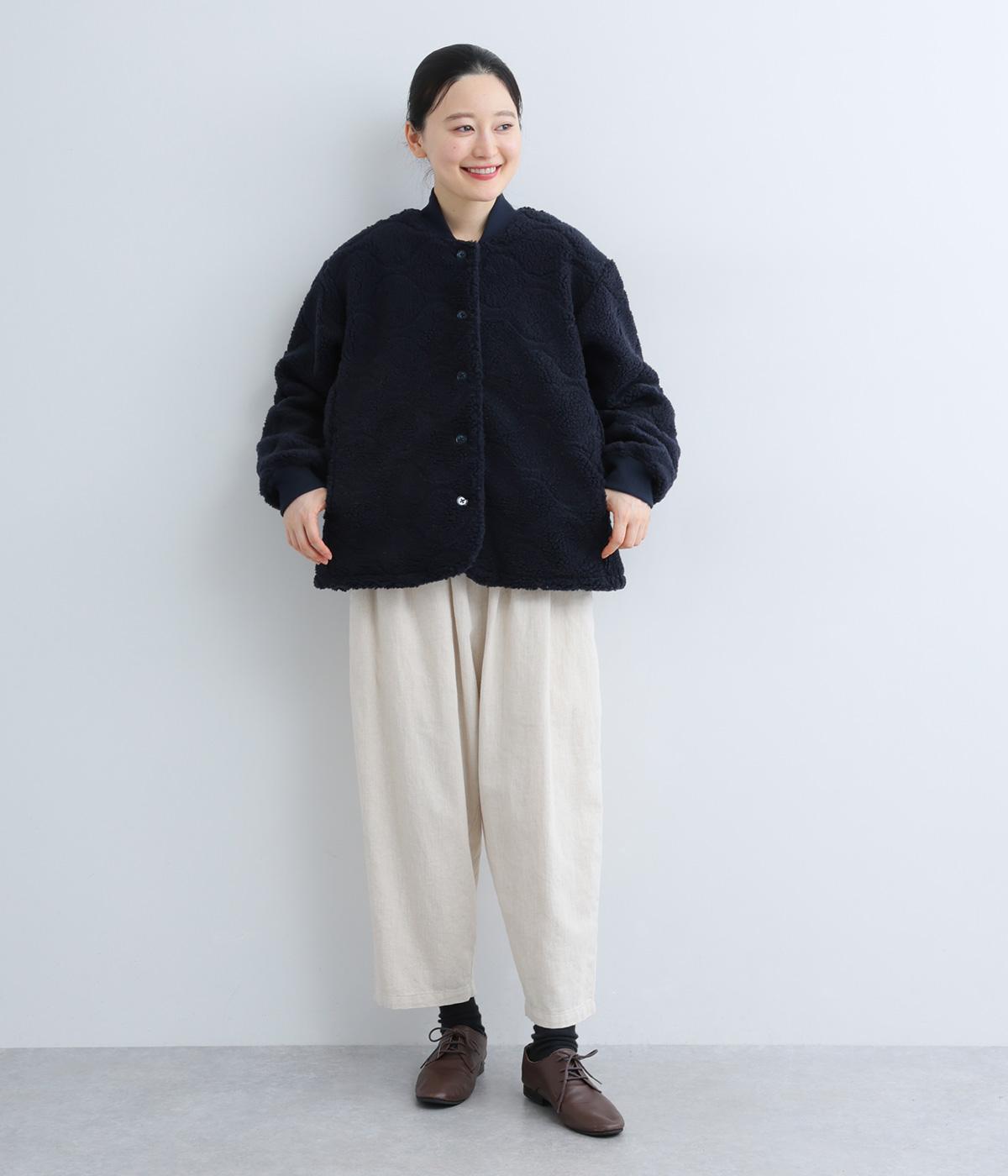 もこもこのボア素材がかわいらしいジャケット。後ろに高さを出した襟と袖口はリブ仕立てで、カジュアルな印象を添えました。前をラウンドさせたヘムラインが女性らしいやわらかな表情をプラス。着丈は長すぎず、合わせるボトムスを選びにくいのもグッドです。