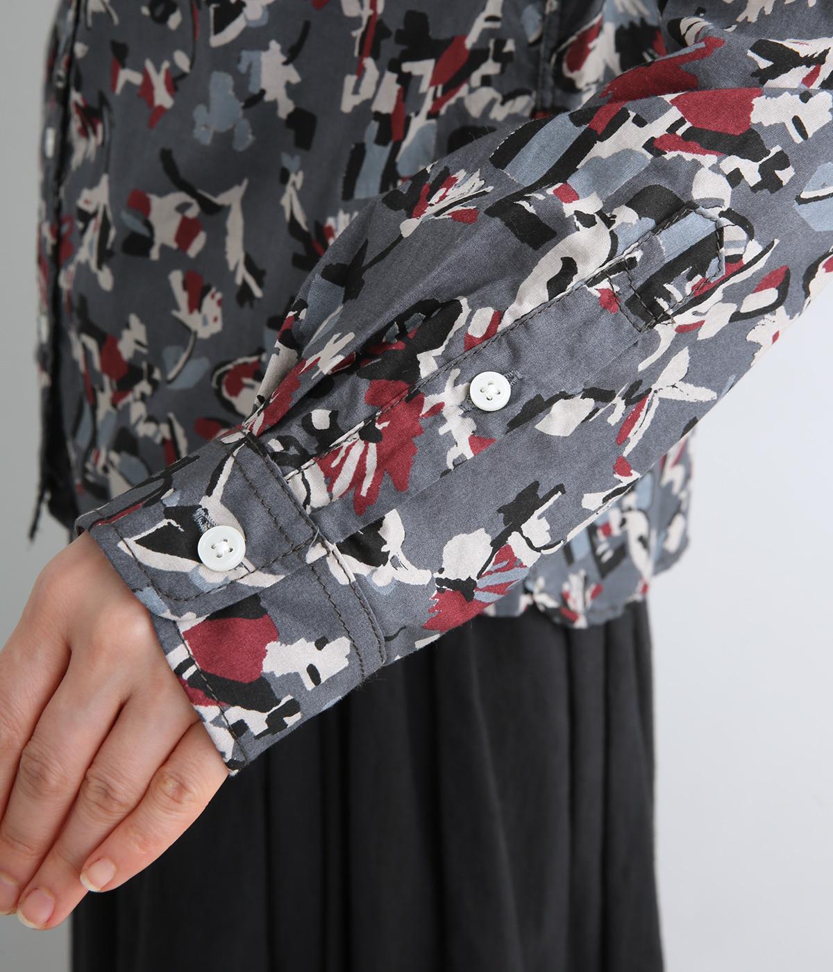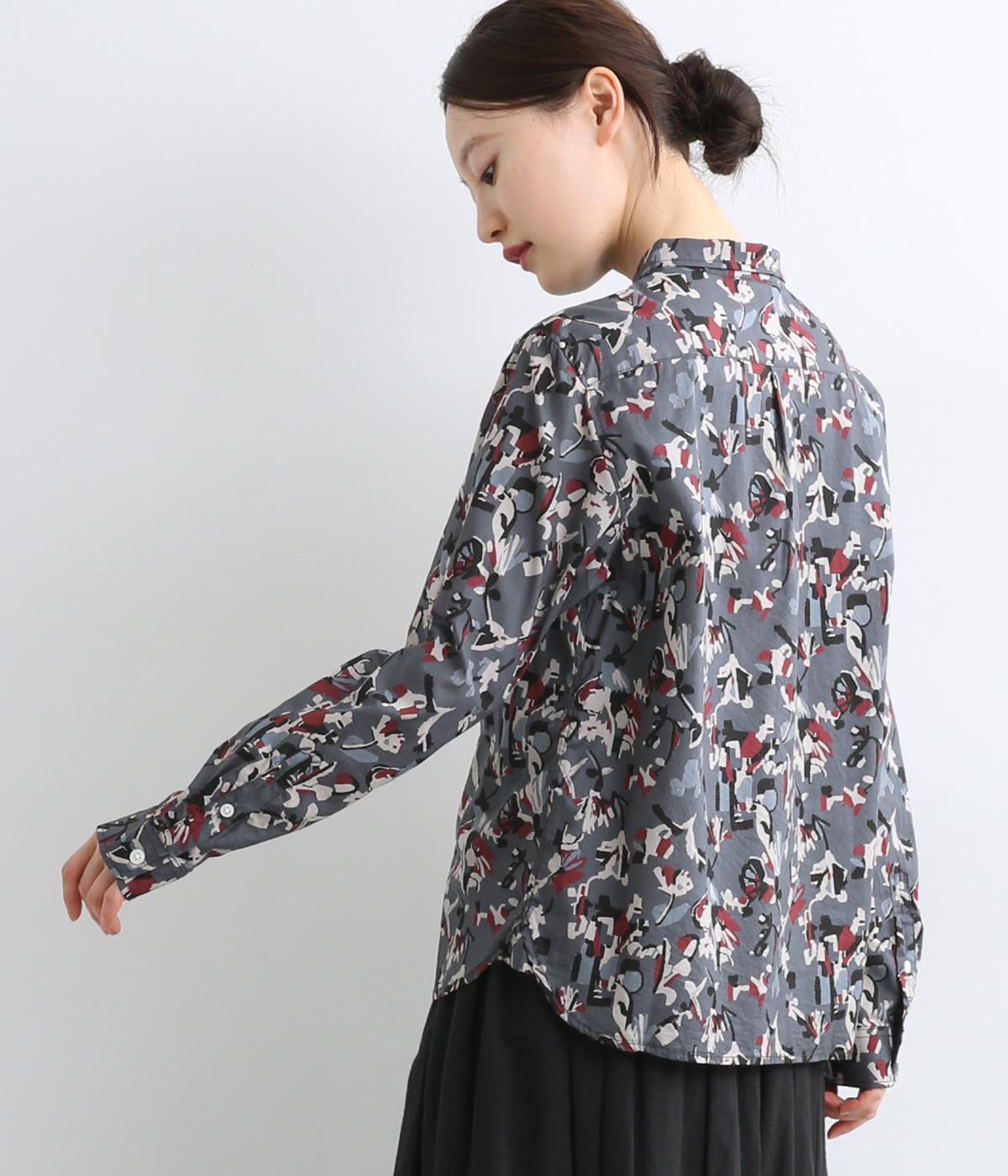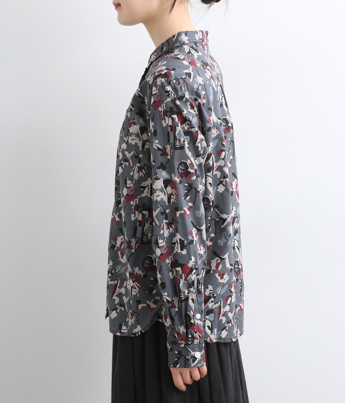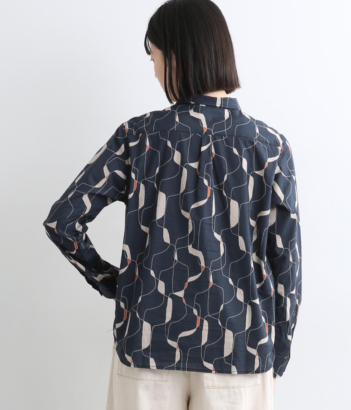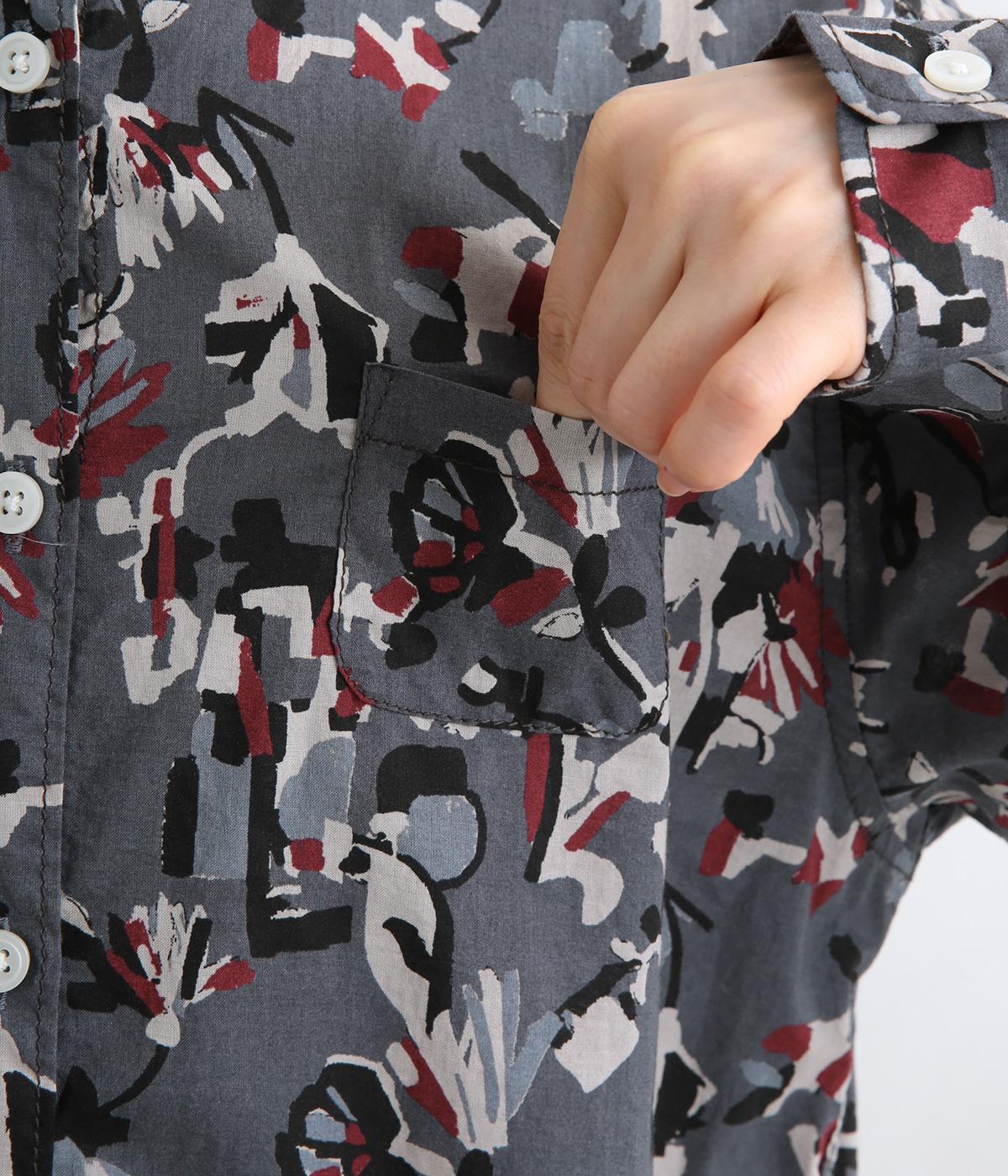 レトロな総柄プリントが着こなしのアクセントにぴったりなシャツです。柄をいかしたシンプルなシルエットは、ニットやスウェットのインナーとしても活躍します。胸元の小さなポケットもアクセントに。