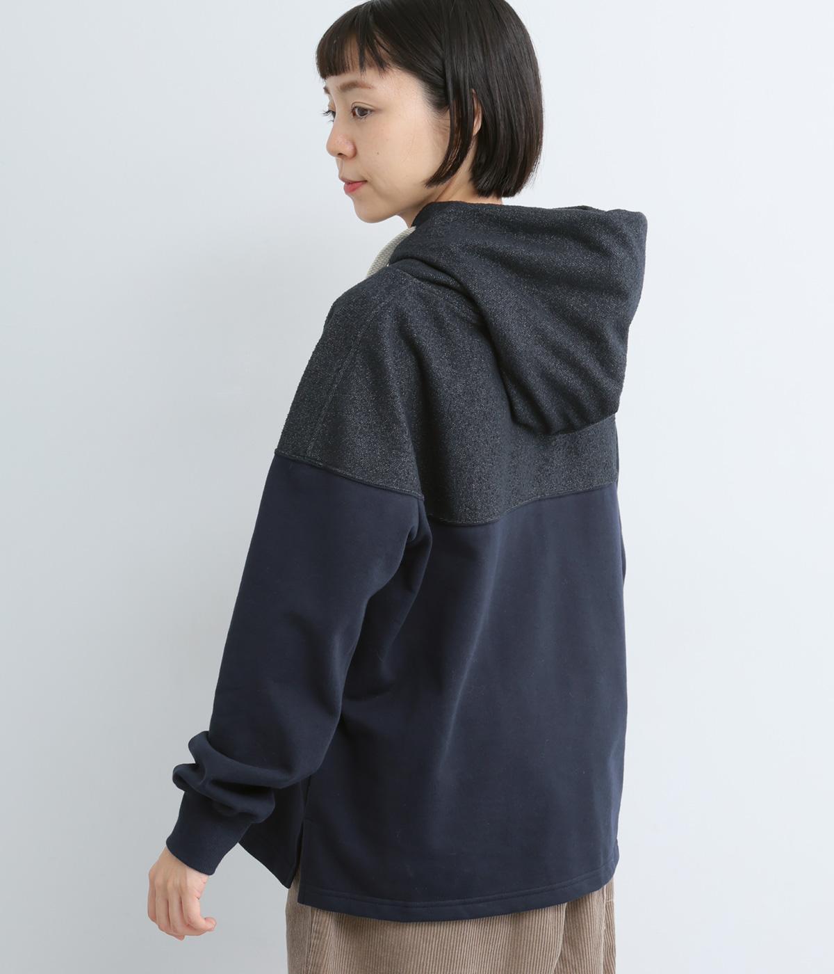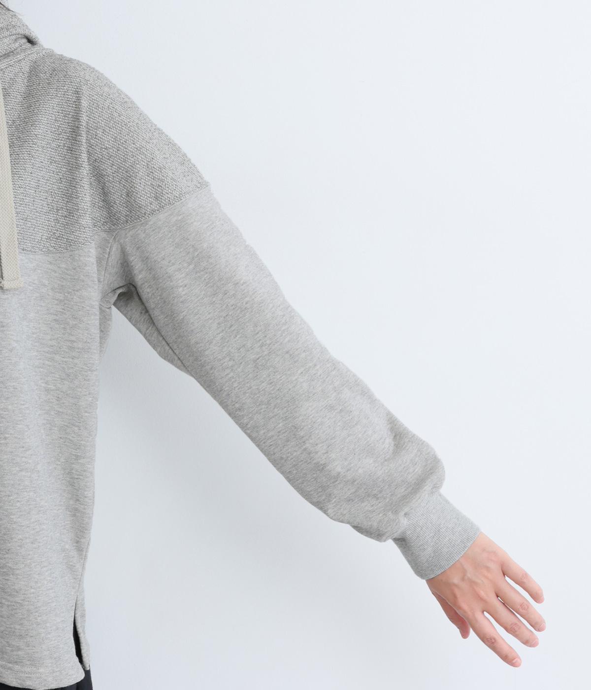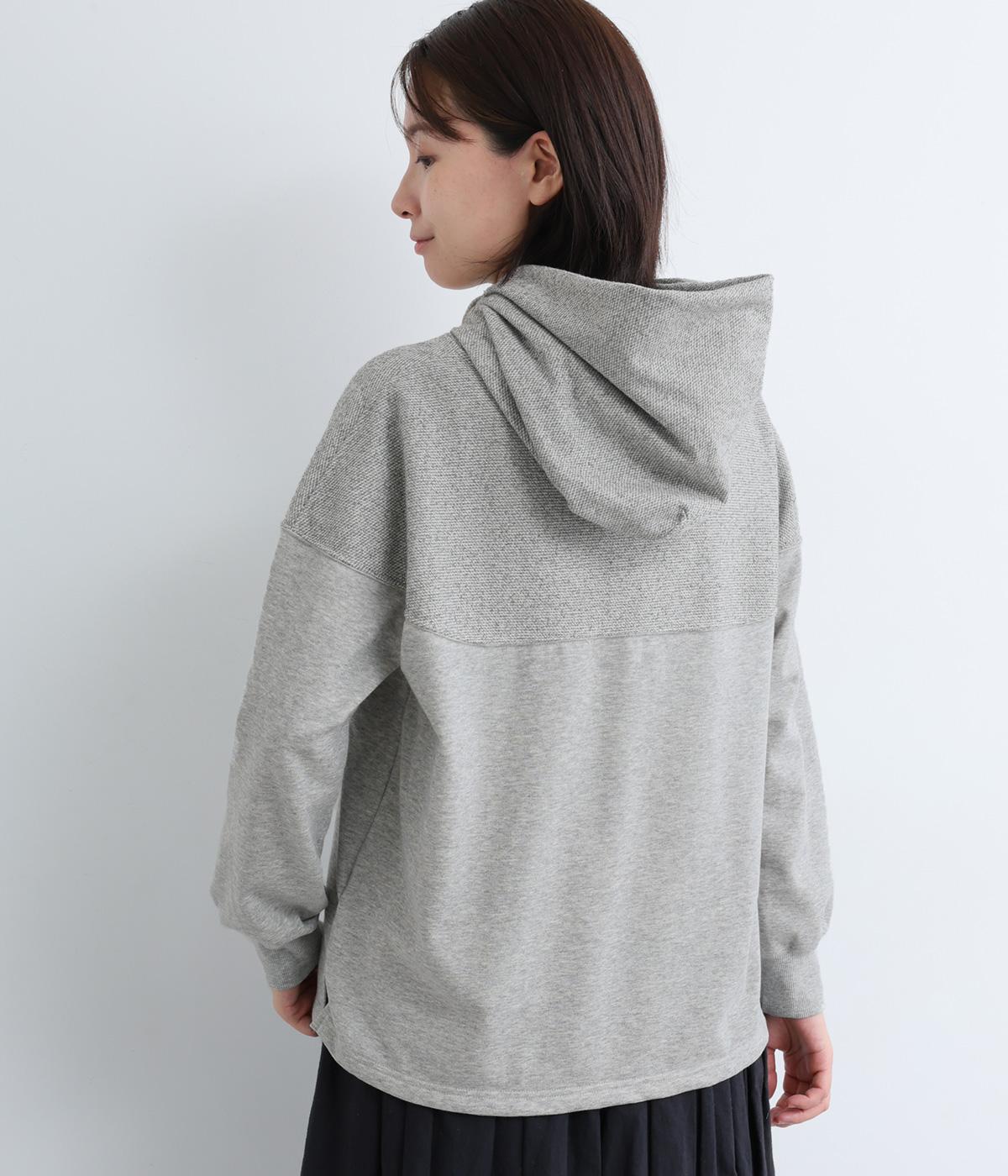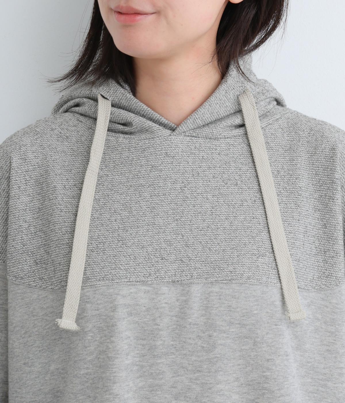表情の異なる素材を組み合わせた、顔まわりのデザインが特徴的なフードつきパーカー。カジュアル感を出しながらもどこか大人顔で、デイリースタイルに取り入れやすい一枚。フードの太紐もいいアクセントになっています。