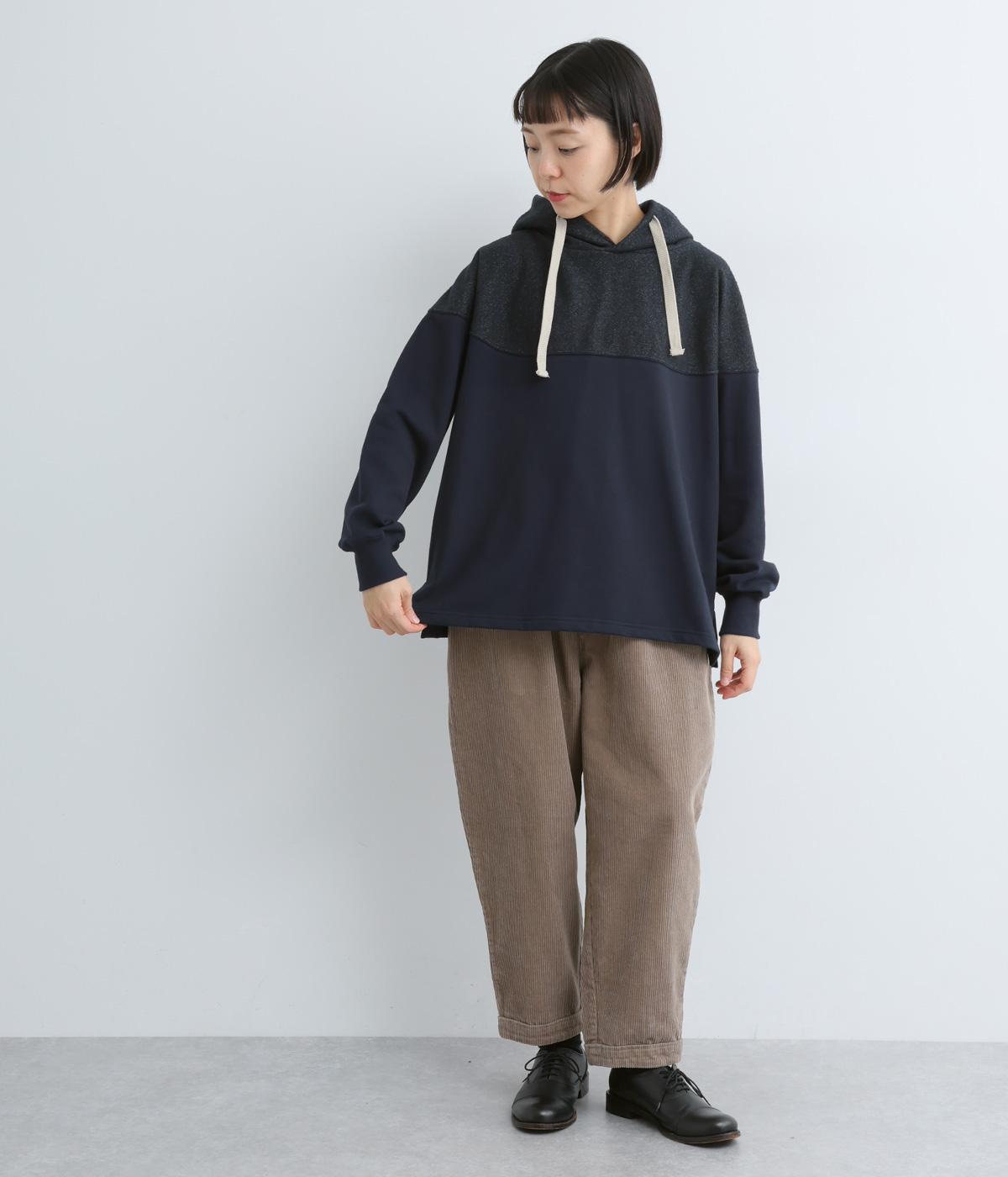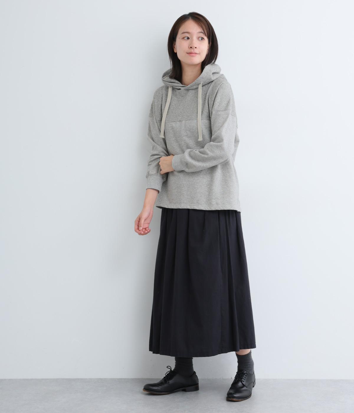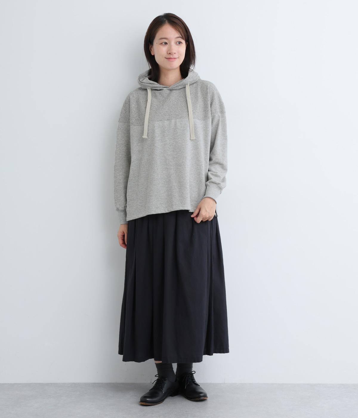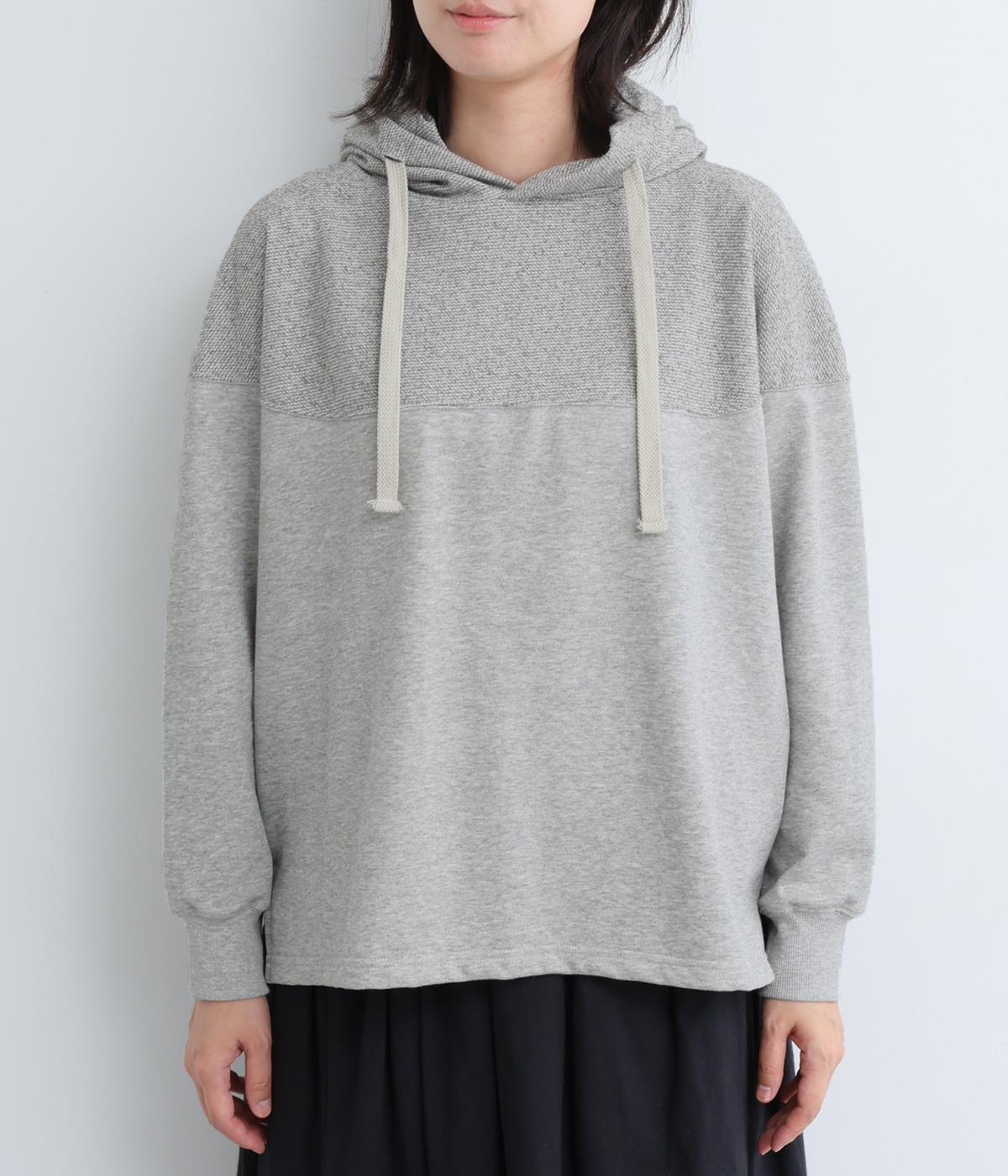 表情の異なる素材を組み合わせた、顔まわりのデザインが特徴的なフードつきパーカー。カジュアル感を出しながらもどこか大人顔で、デイリースタイルに取り入れやすい一枚。フードの太紐もいいアクセントになっています。