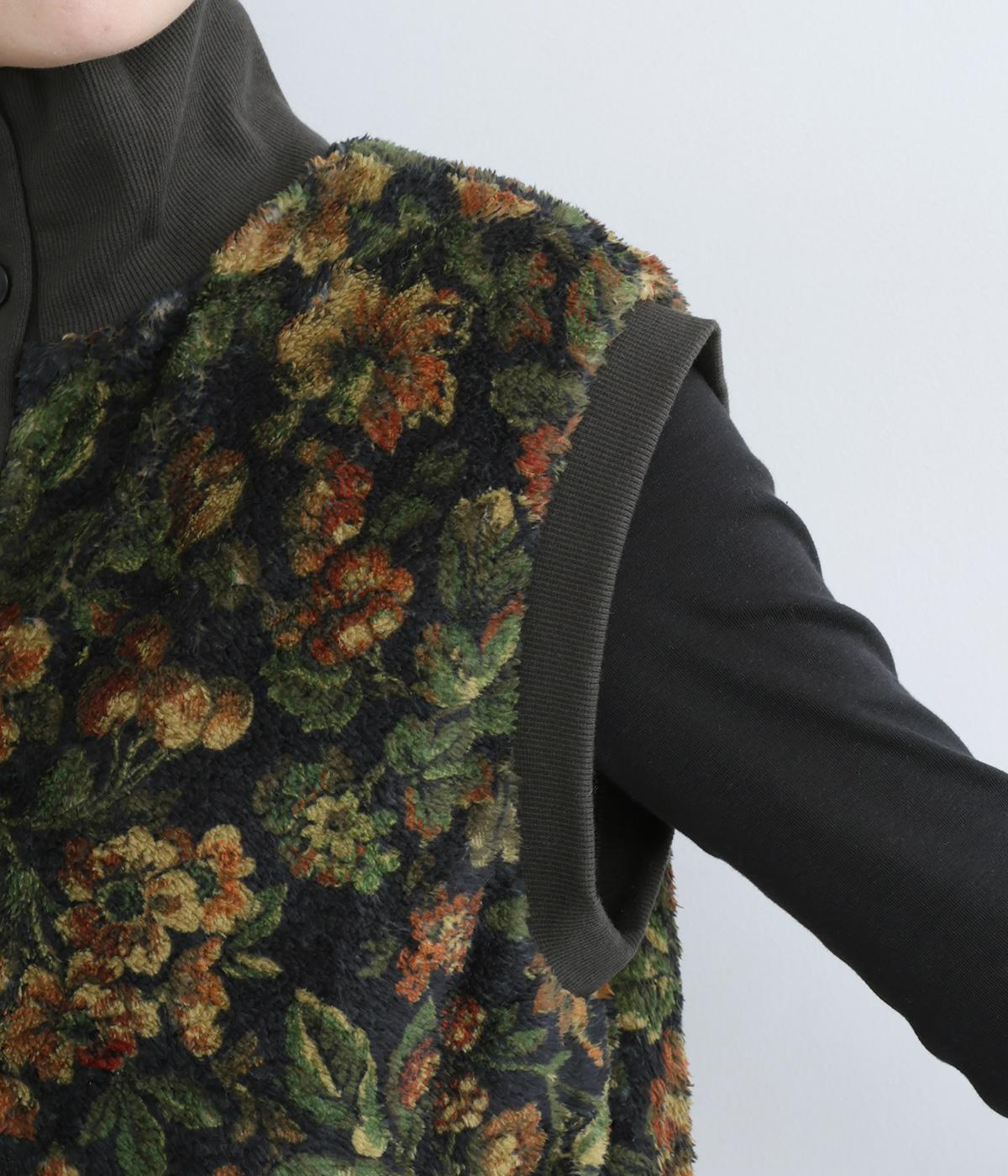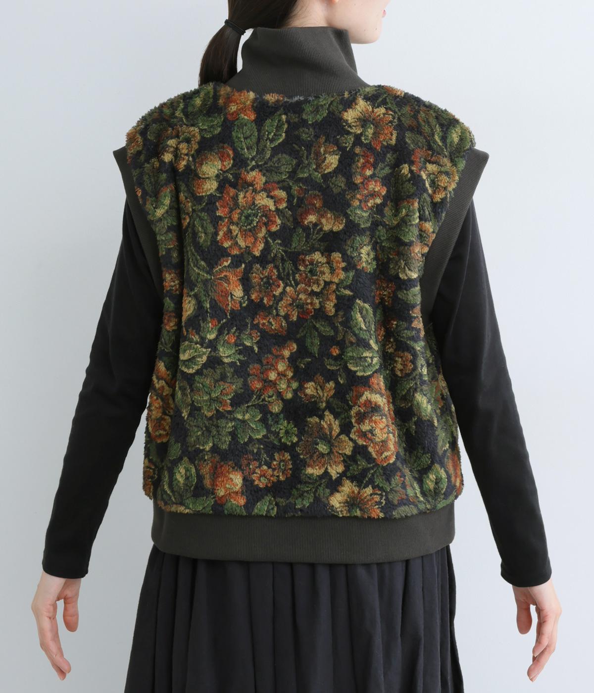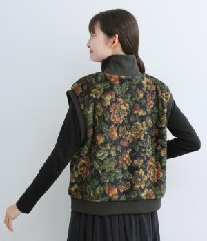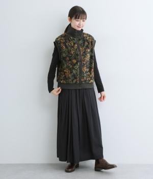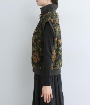 ヴィンテージライクな花柄プリントが目を引くベスト。高さを出したリブ仕様のネックが首元まであたたかく包み込んでくれます。ボリュームのあるシルエットが、腕まわりをすっきりと見せる効果も。イージーな着用感で、高級感のある見た目も叶えるうれしいアイテムです。