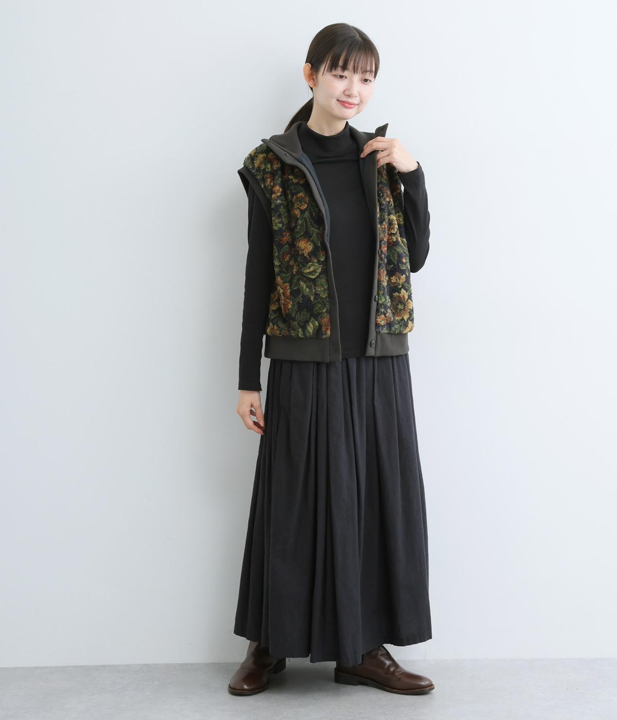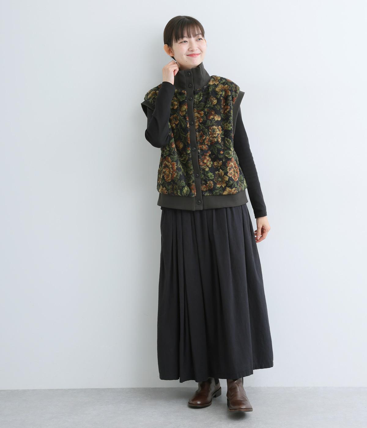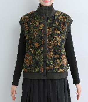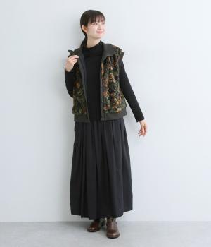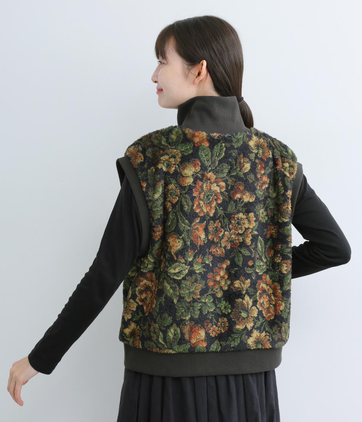 ヴィンテージライクな花柄プリントが目を引くベスト。高さを出したリブ仕様のネックが首元まであたたかく包み込んでくれます。ボリュームのあるシルエットが、腕まわりをすっきりと見せる効果も。イージーな着用感で、高級感のある見た目も叶えるうれしいアイテムです。