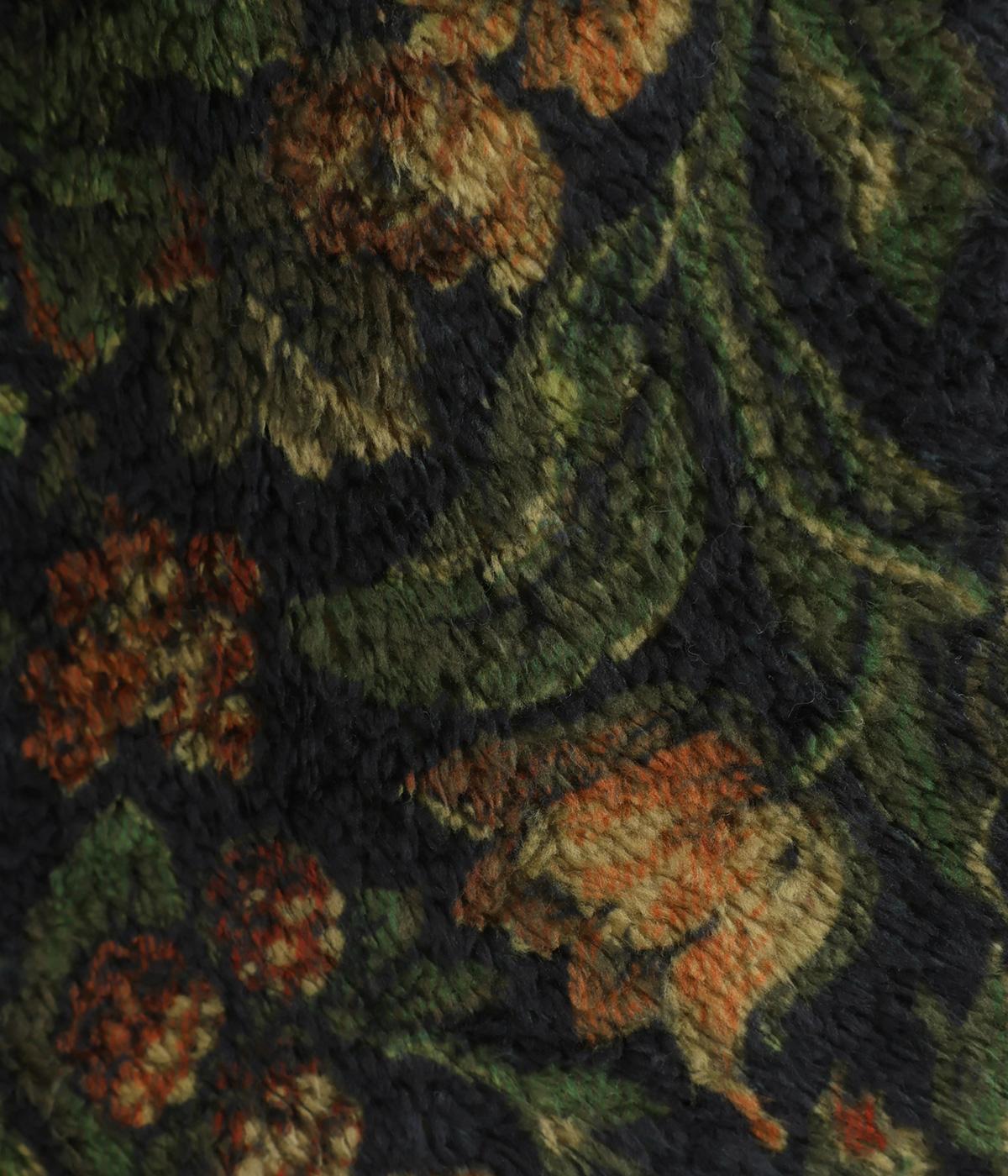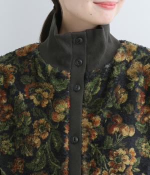 つい表面を撫でたくなるとてもやわらかな肌ざわりのフリース生地に、シックな花柄プリントをあしらいまいた。風の侵入を防ぐ裏地をつけて防寒性をアップさせています。