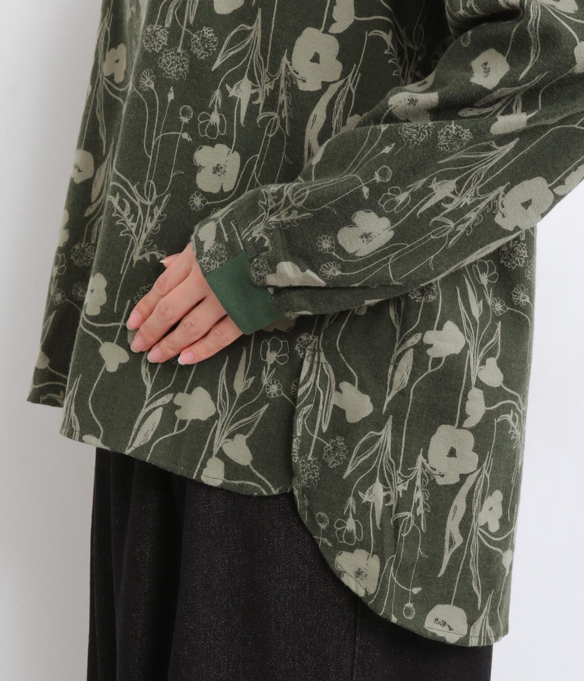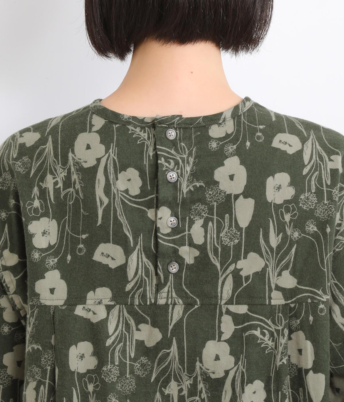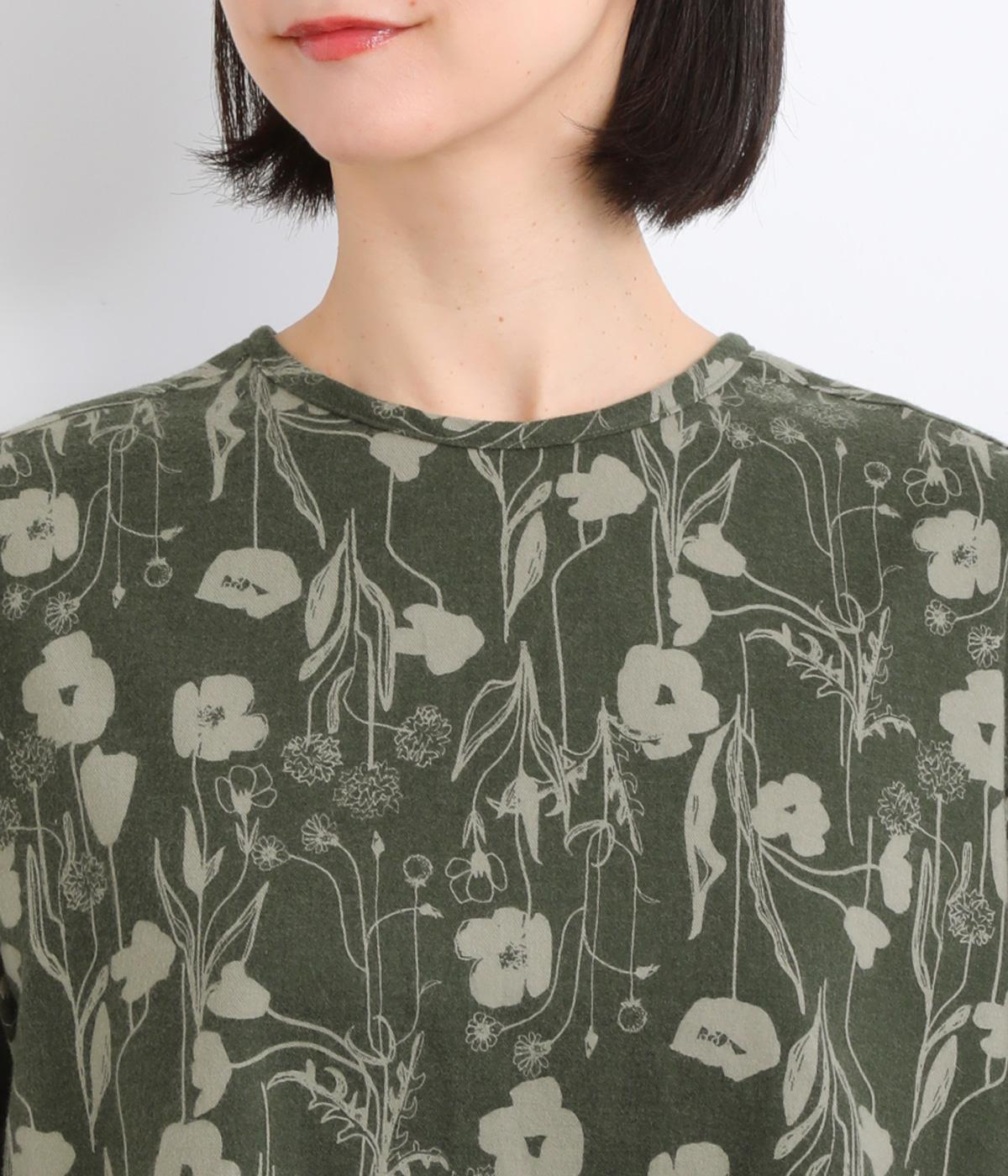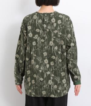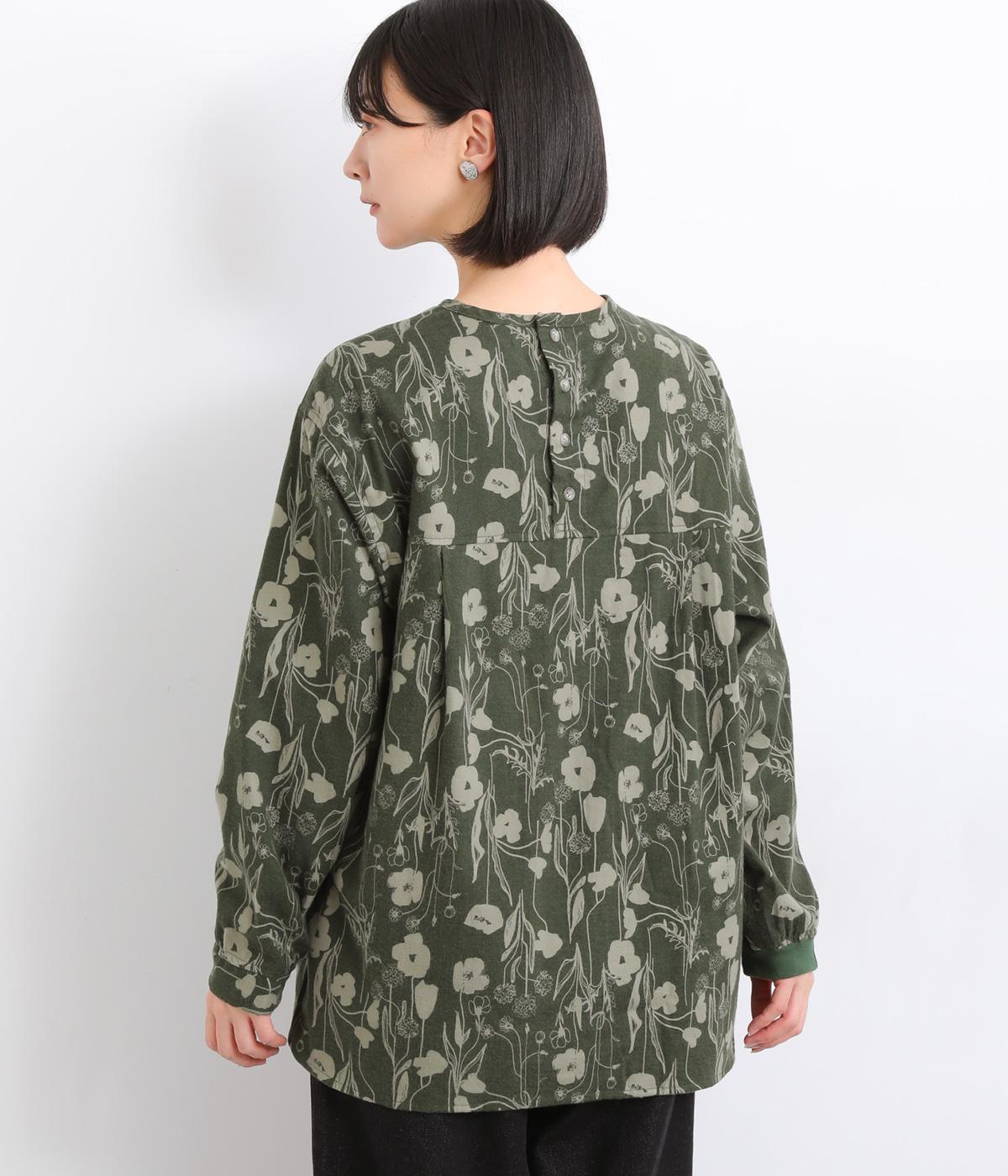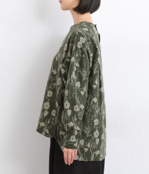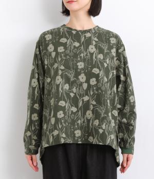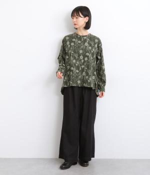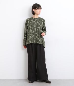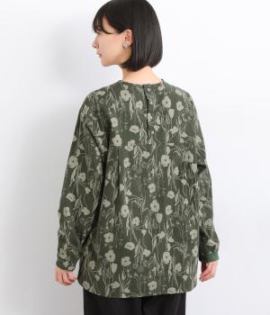 あたたかみのある花柄が全面にあしらわれ、ナチュラルな大人のかわいさを引き立てます。裾の前後差とスリットが抜け感を生み、さまざまなボトムスともバランスよくまとまります。袖口の一部に施したゴムが自然にフィットし、手元をすっきり見せながら実用性も◎。