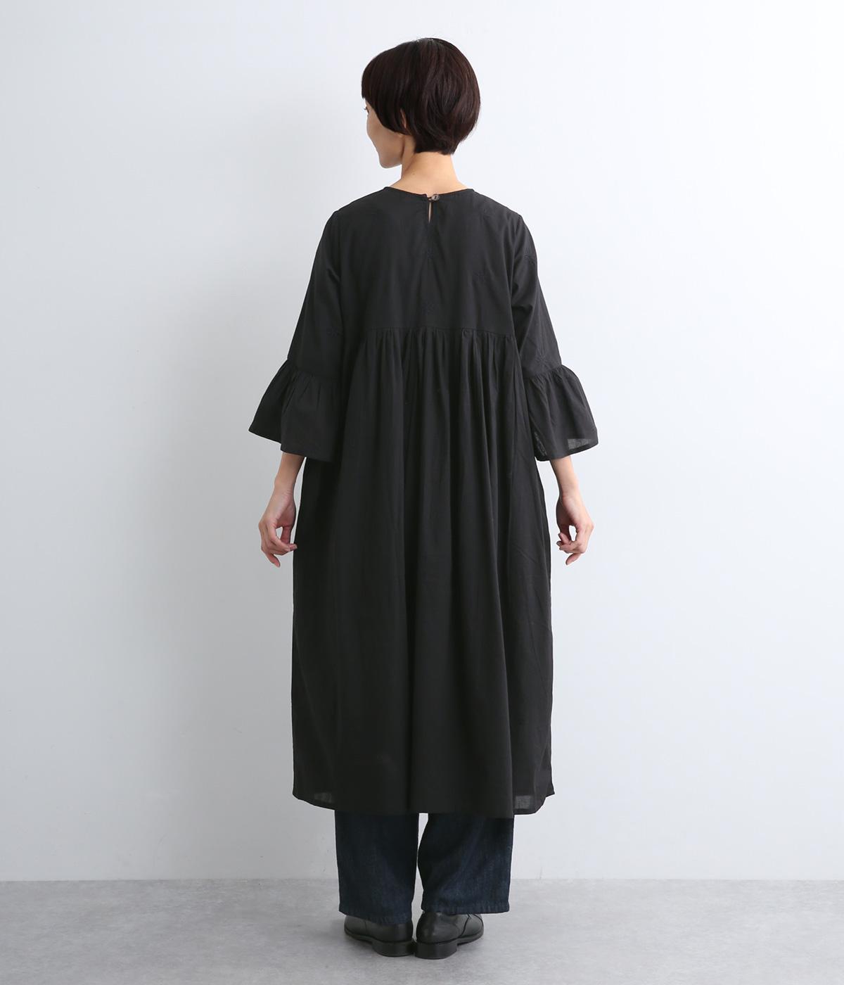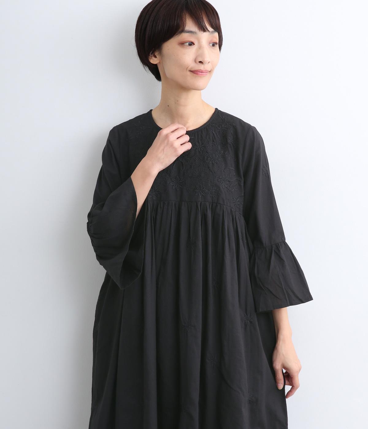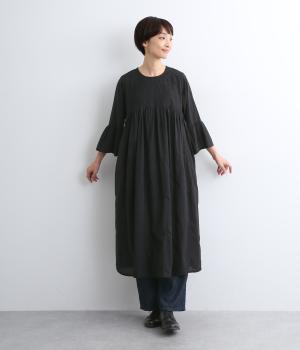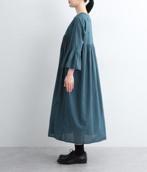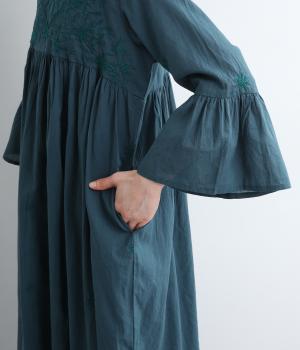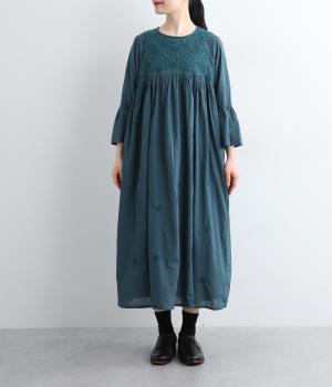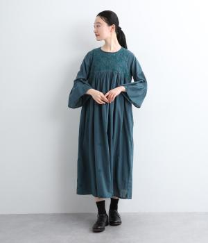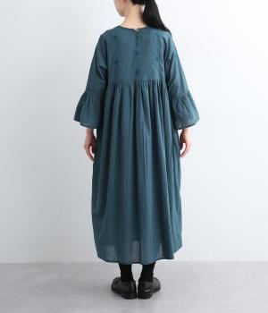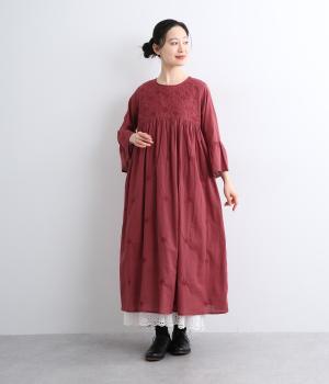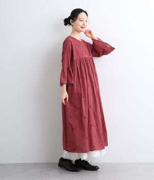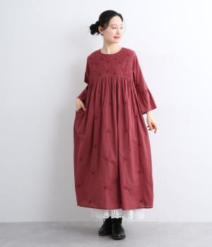 ヨーク下と袖に切り替えやギャザーを入れて、ふんわりとした女性らしいシルエットに仕上げたワンピース。刺しゅう色をベースと同色にすることで甘さをおさえ、着やすくしているのがポイントです。ネック後ろには着脱をアシストする涙開きをつけました。