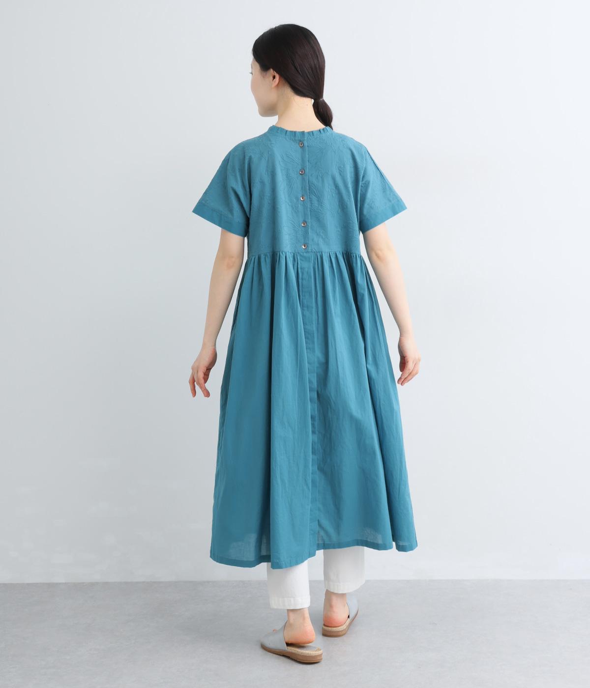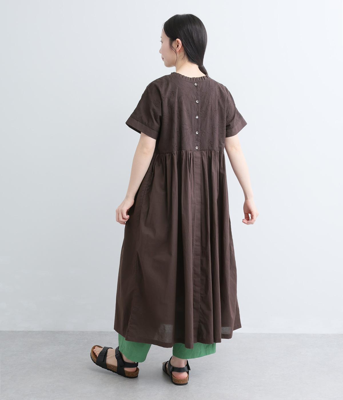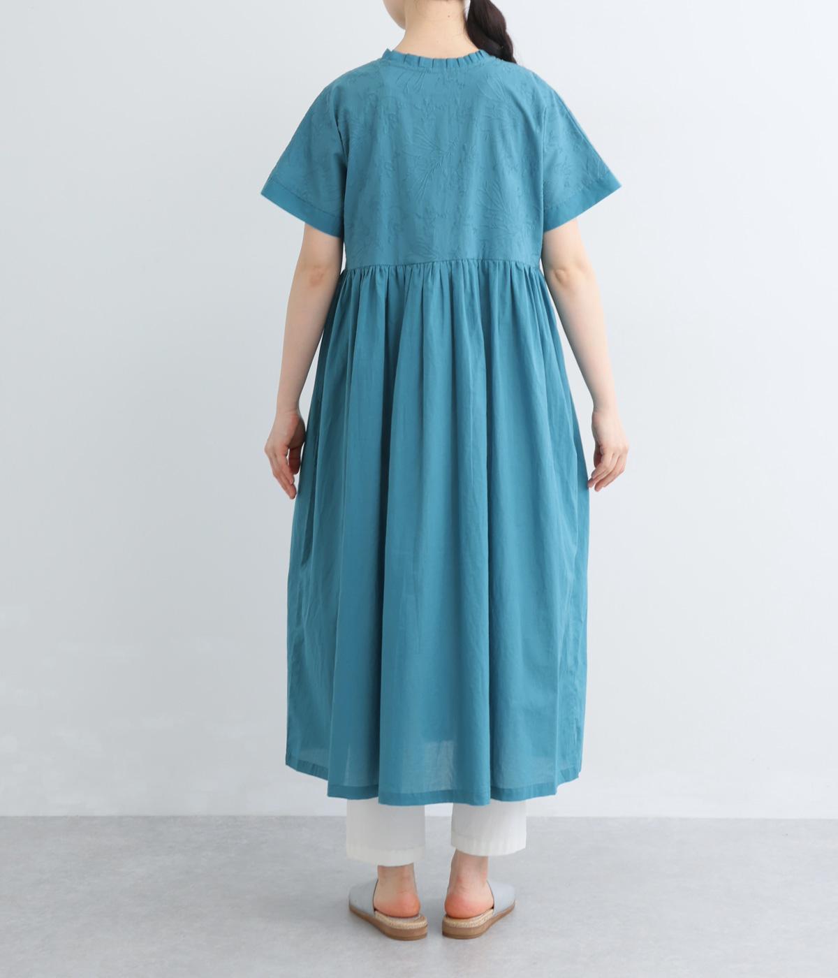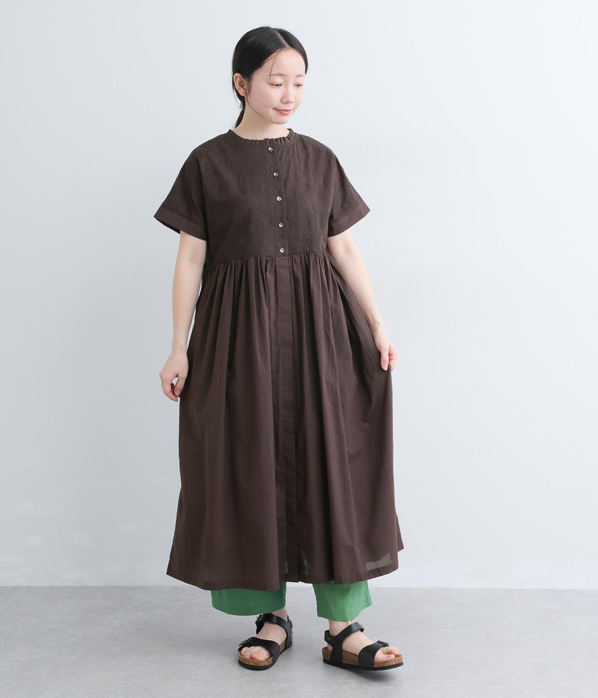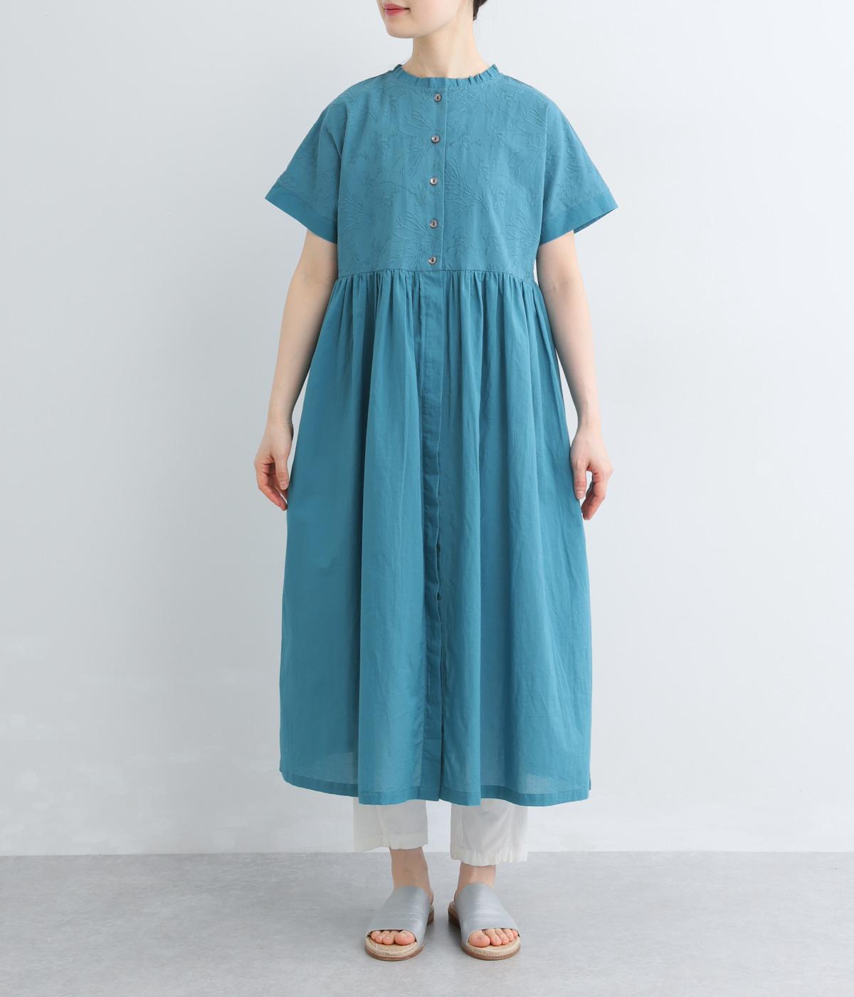前後2wayで着用でき、羽織りとしても活躍するワンピースです。落ち着いた色合いが繊細な刺しゅうを引き立て、大人のワードローブになじみます。手仕事の造形美をまとう、凛としてさわやかな佇まいの一枚です。