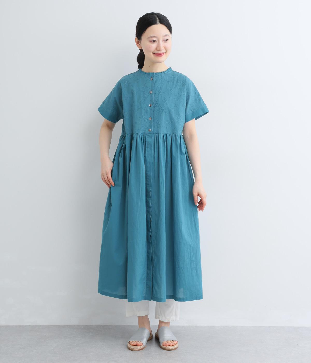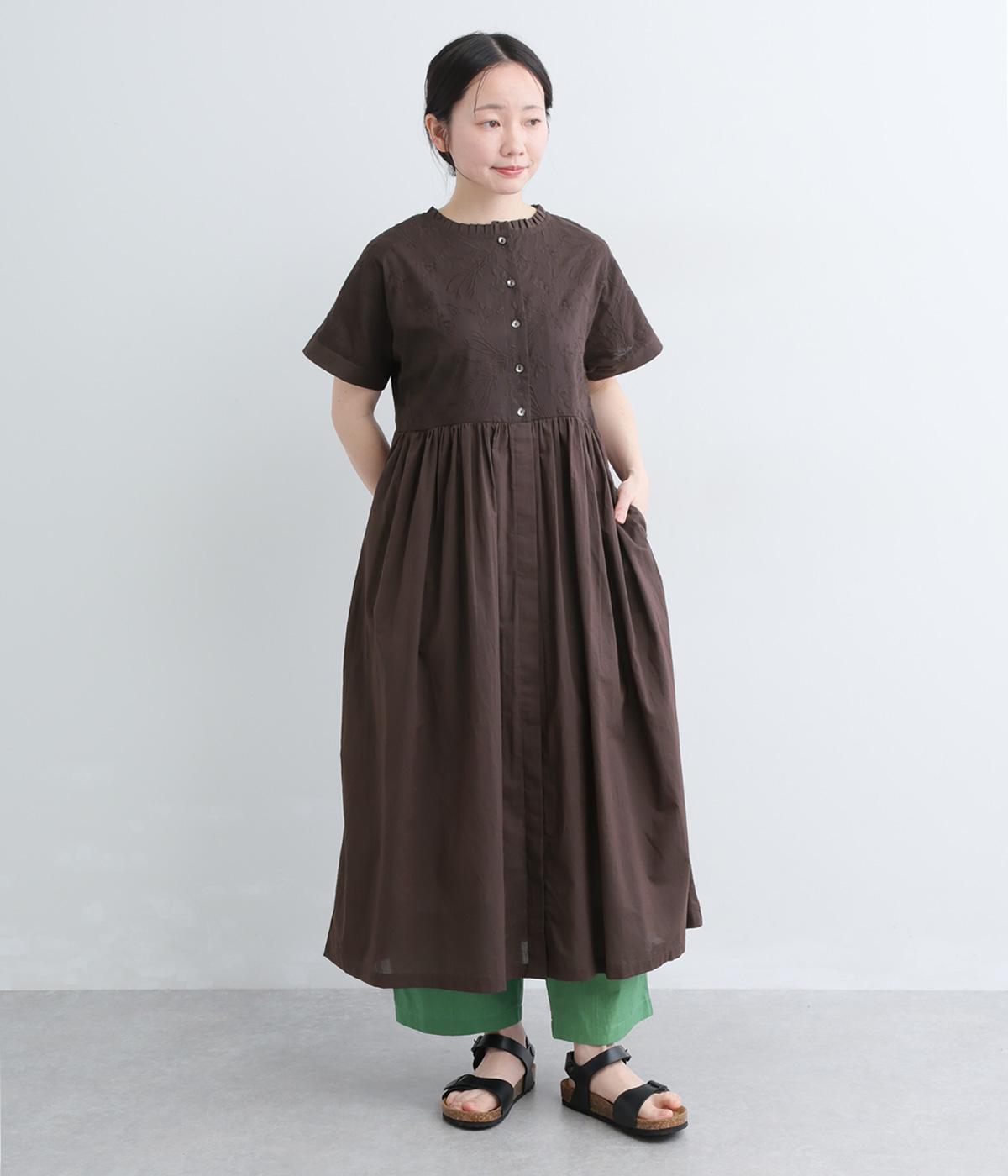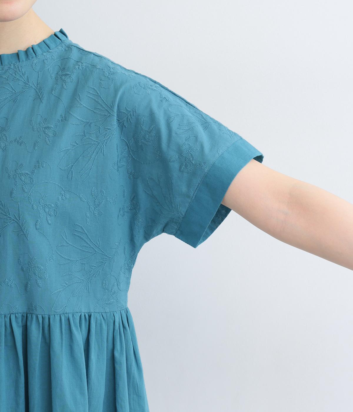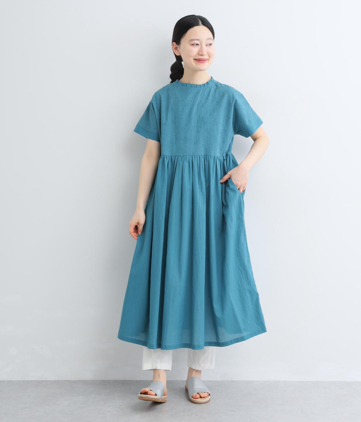 前後2wayで着用でき、羽織りとしても活躍するワンピースです。落ち着いた色合いが繊細な刺しゅうを引き立て、大人のワードローブになじみます。手仕事の造形美をまとう、凛としてさわやかな佇まいの一枚です。