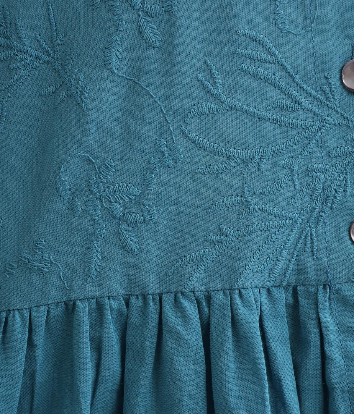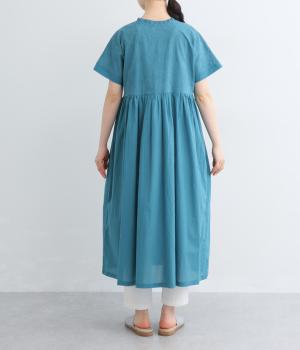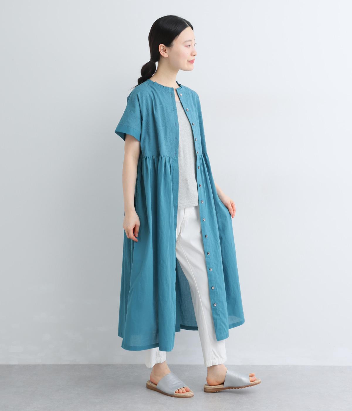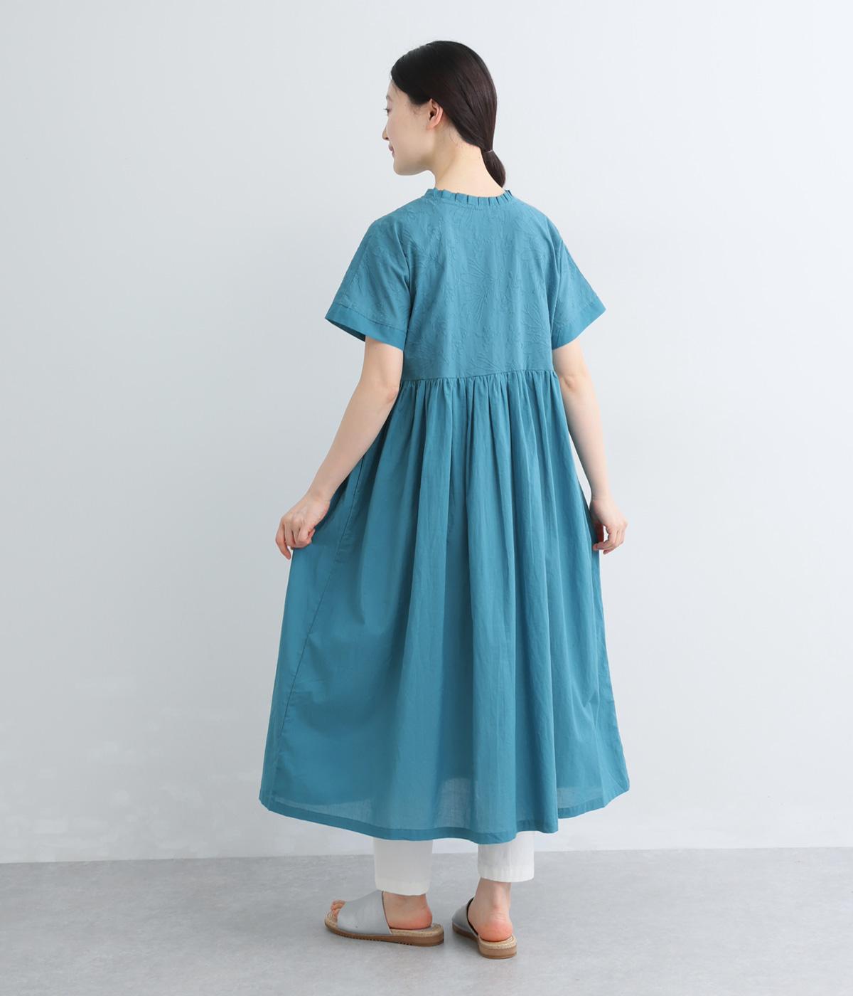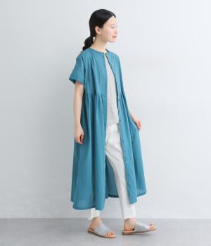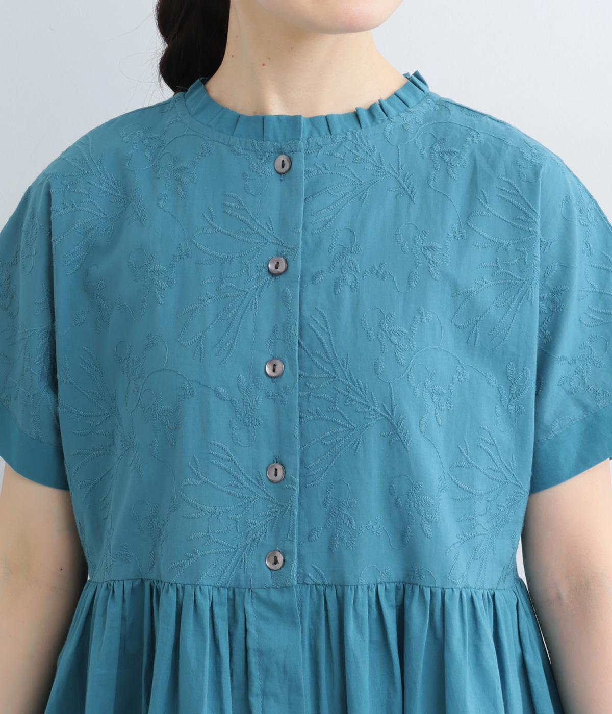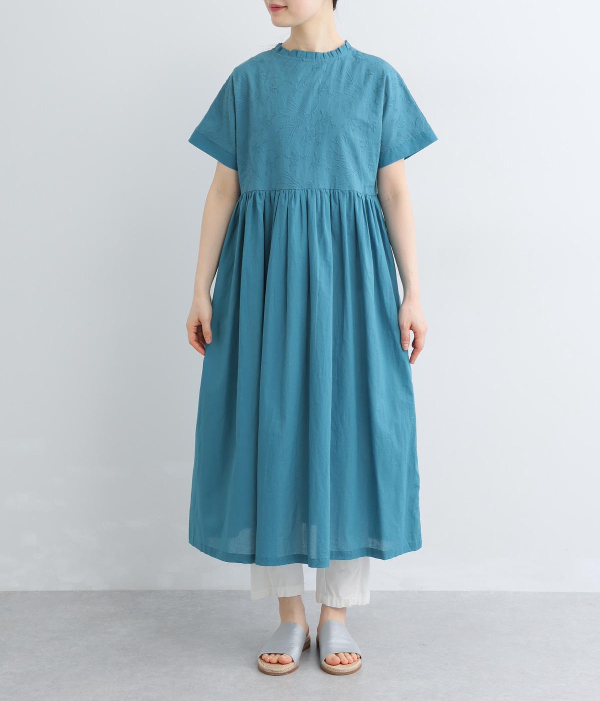 前後2wayで着用でき、羽織りとしても活躍するワンピースです。落ち着いた色合いが繊細な刺しゅうを引き立て、大人のワードローブになじみます。手仕事の造形美をまとう、凛としてさわやかな佇まいの一枚です。