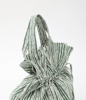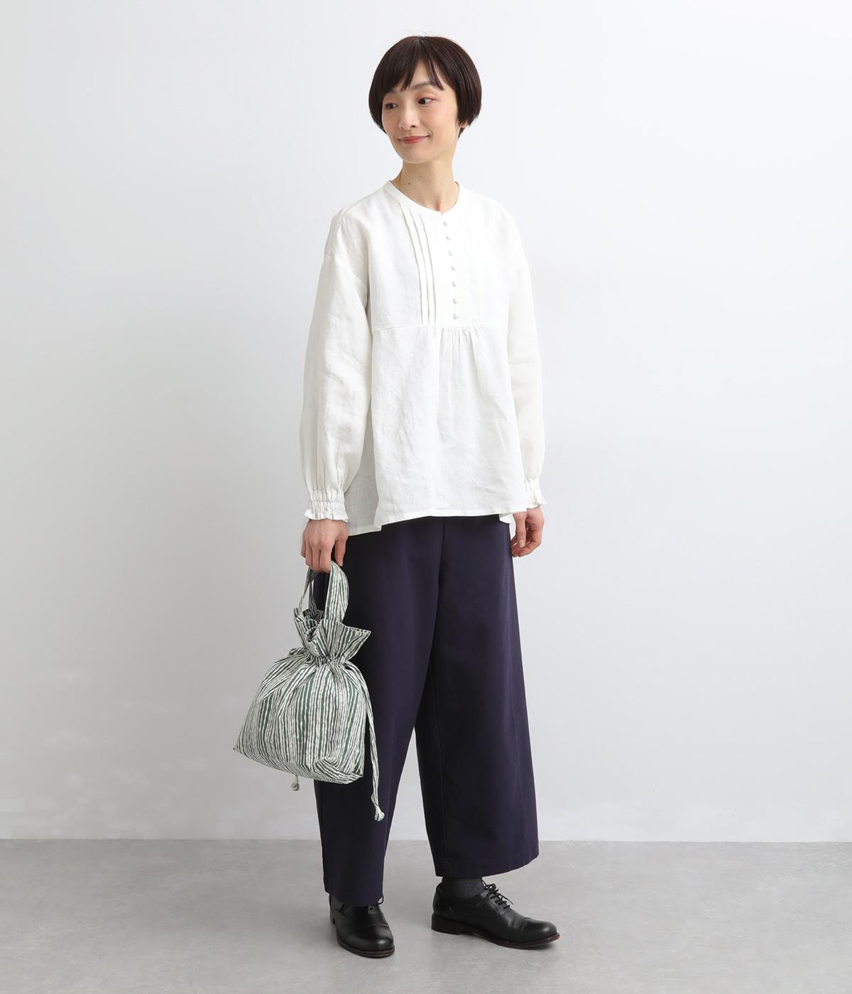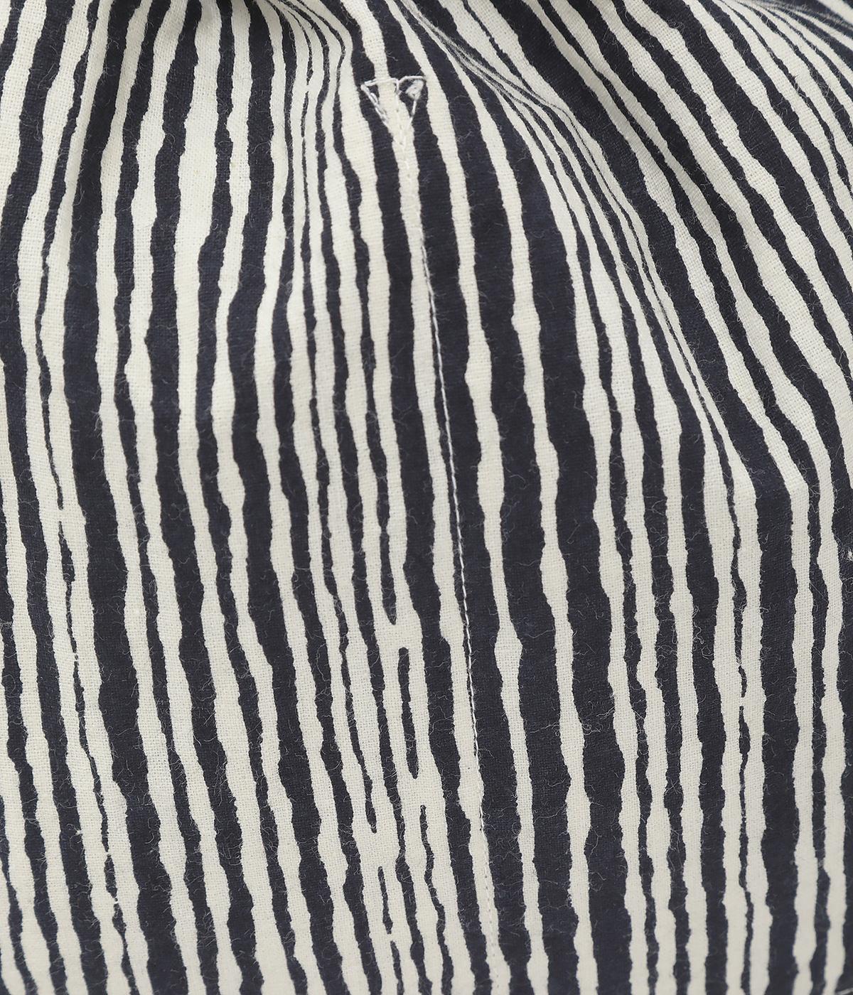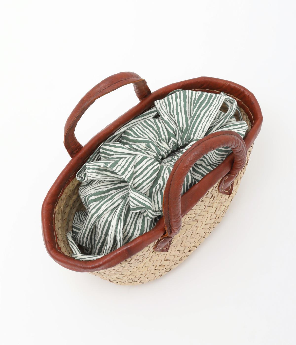 さわやかなストライプ柄にころんとした巾着フォルムがコーディネートのワンポイントに。口を開いてシンプルなトートバッグにしたり、かごバッグなどのインナーにしたりマルチに活躍。ポケットも豊富で小ぶりながら使い勝手抜群。