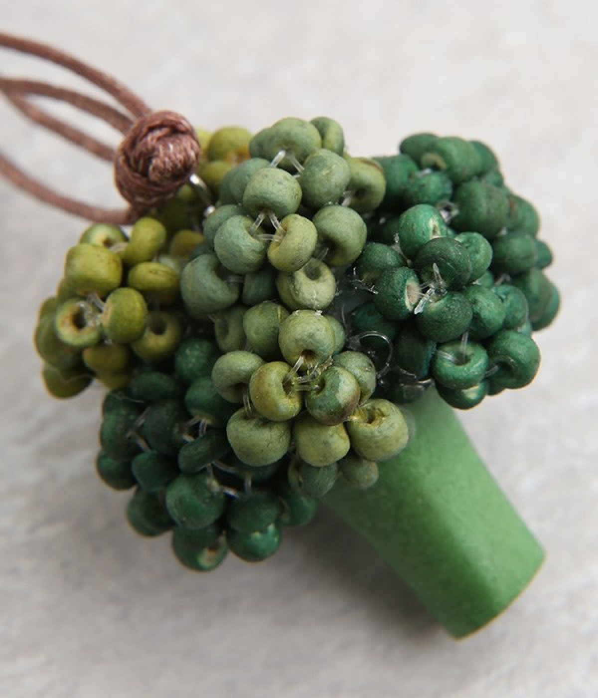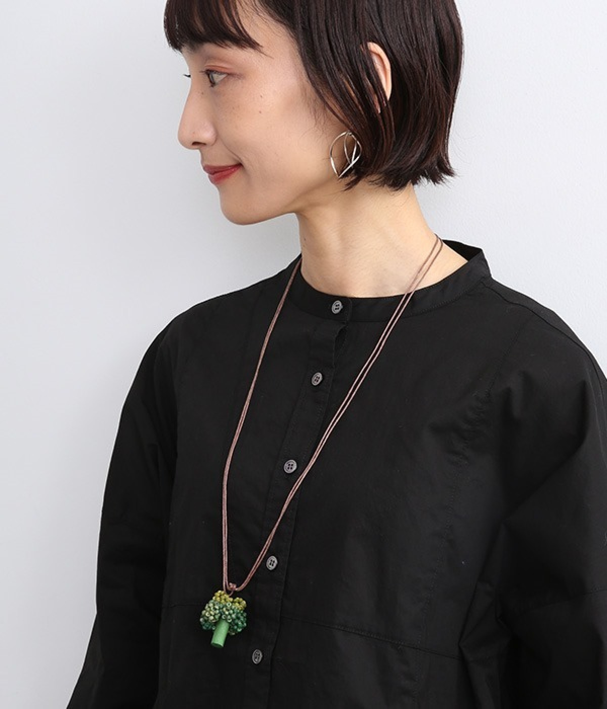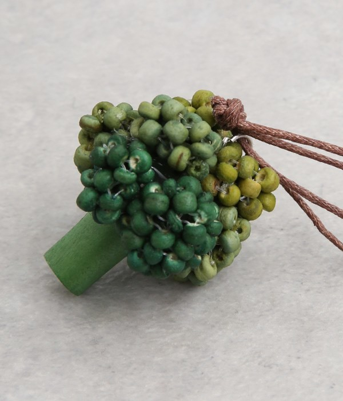 ブロッコリーのつぶつぶをウッドビーズで表現したユニークなネックレスです。ウッド製ならではの素朴な風合いは普段使いにマッチ。グラデーションになるように色付けし、リアルな質感に近づける工夫が光ります。コードの結び目を動かすことでお好みの長さにアレンジできる仕様も◎。いつもの着こなしに物足りなさを感じたとき、ちょっと遊び心を足したいときにどうぞ。
