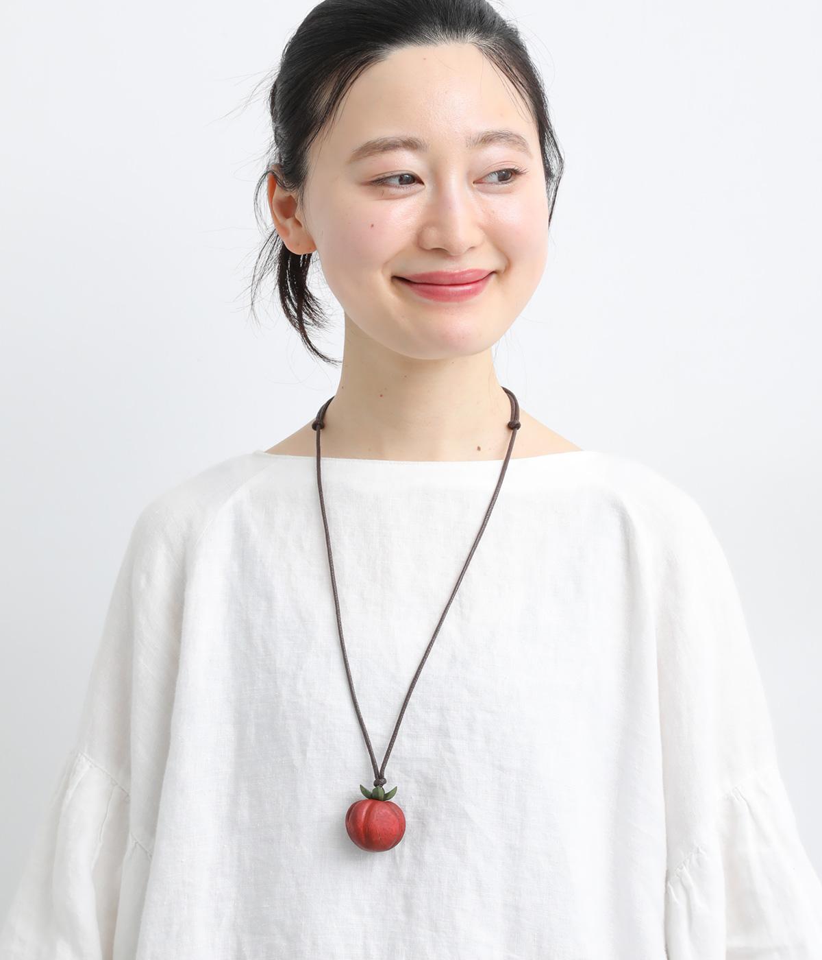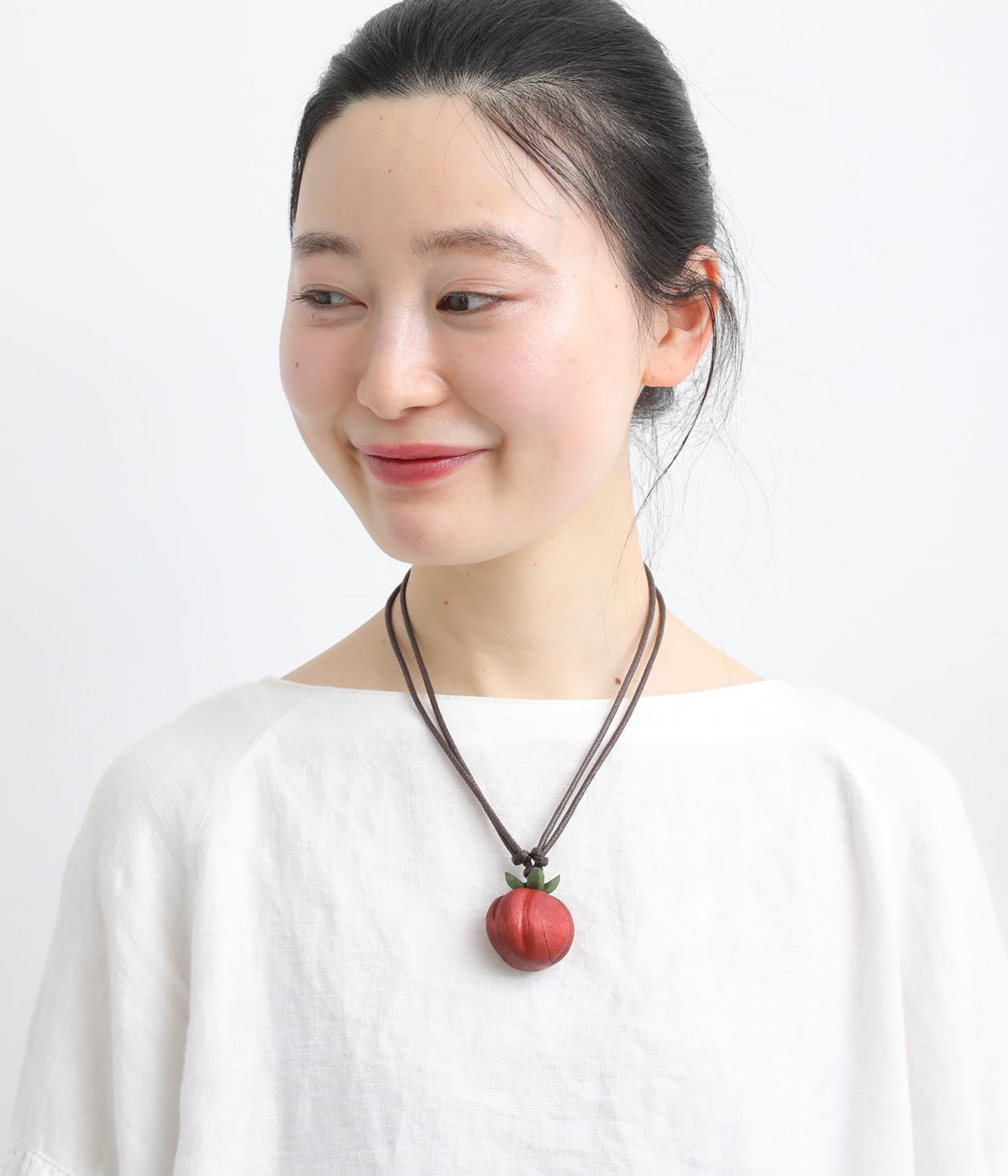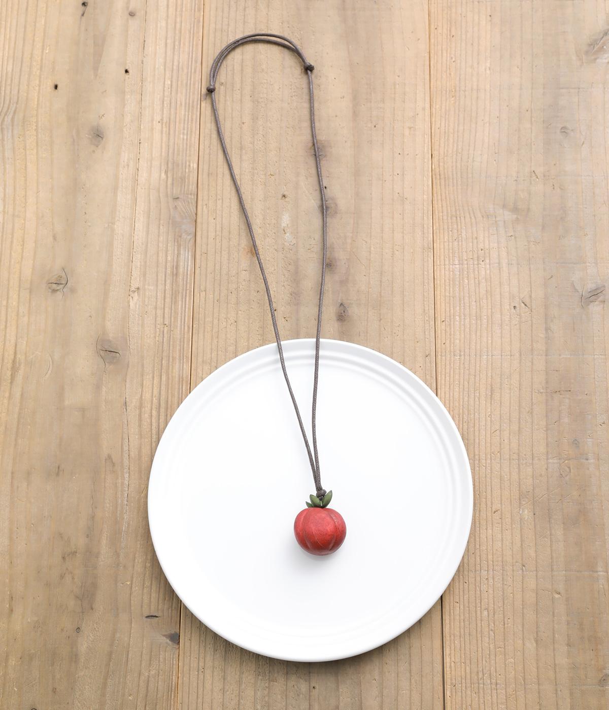 遊び心とナチュラル感を兼ね備えた野菜モチーフのネックレス。ころんと立体的なつくりで存在感があり、歪な形や木製ならではの色ムラが自然界で育ったトマトをリアルに表現。結び目をスライドさせるだけの長さ調整イージーなつくりです。