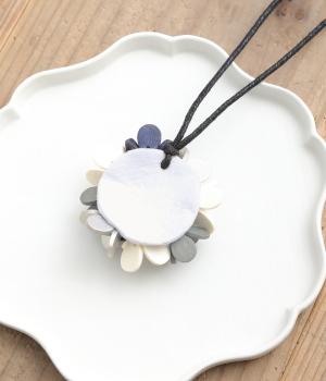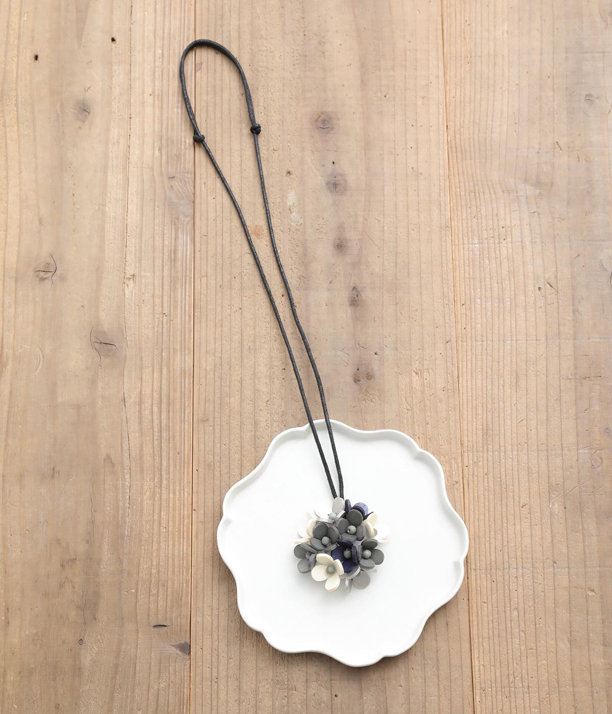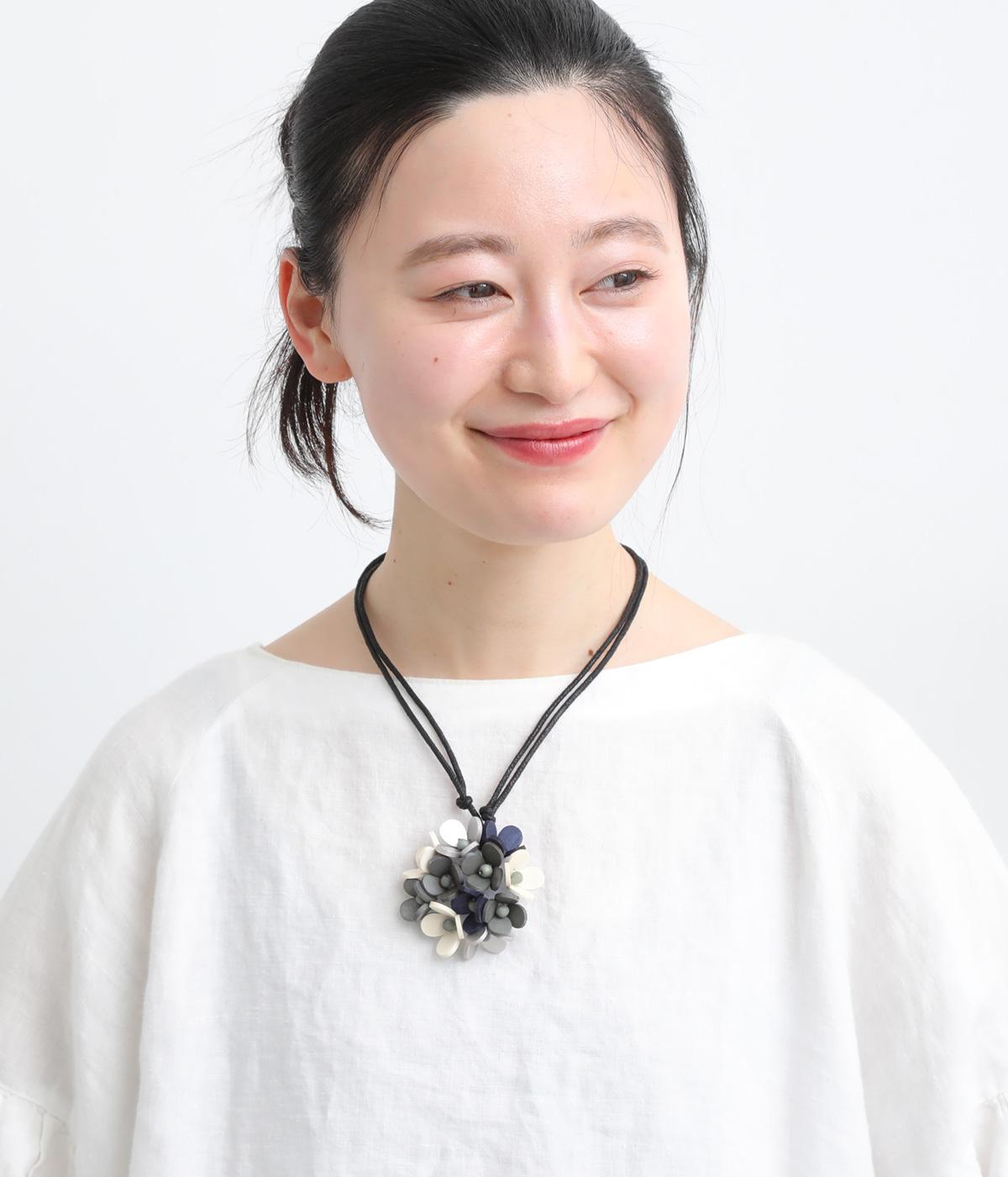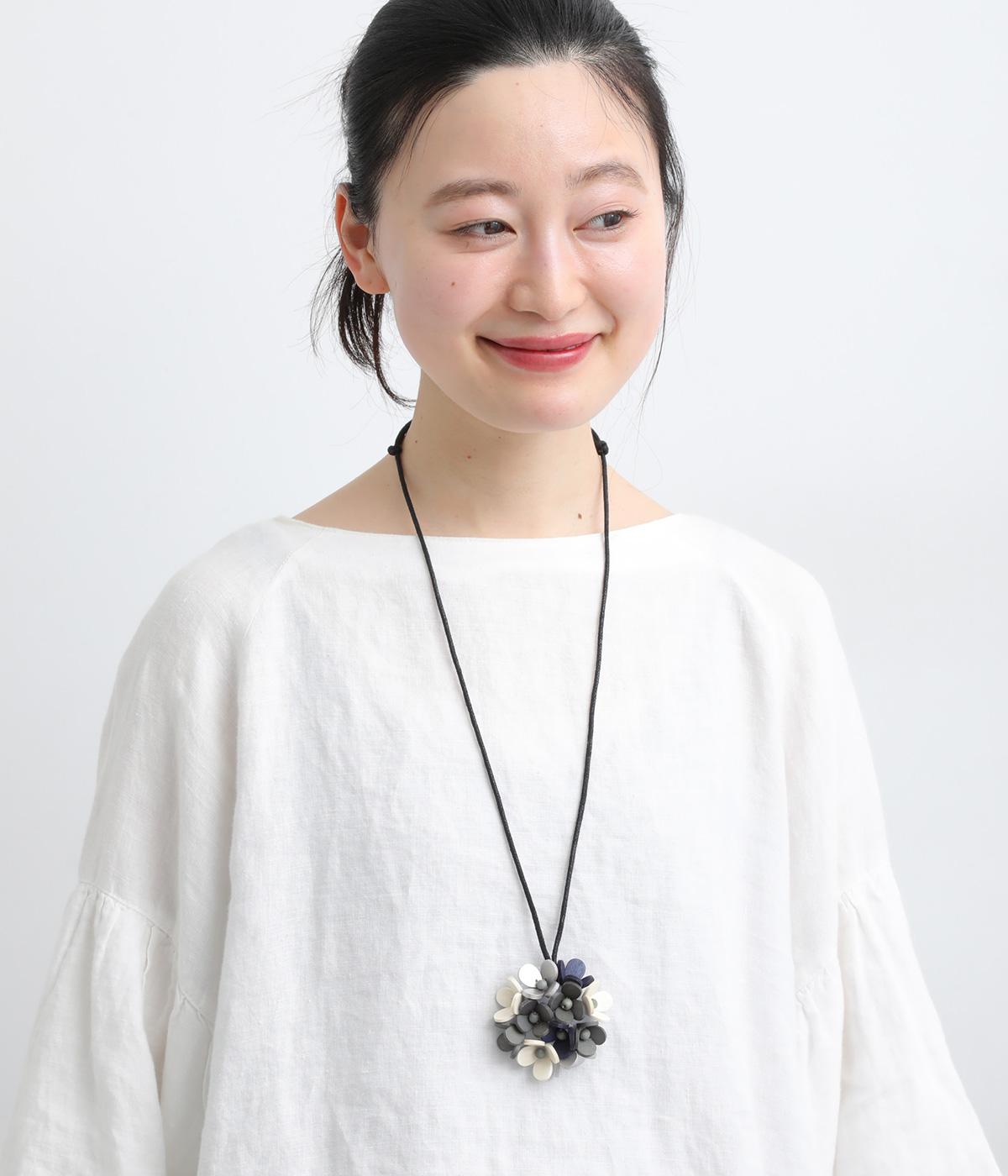 立体的なモチーフを連ねた、花束のような可憐なネックレス。適度なボリュームで存在感があり、ウッド素材とシックな色みで手持ちアイテムにすんなりなじみます。コーディネートバランスもとりやすい長さ調整自在なつくりも◎。