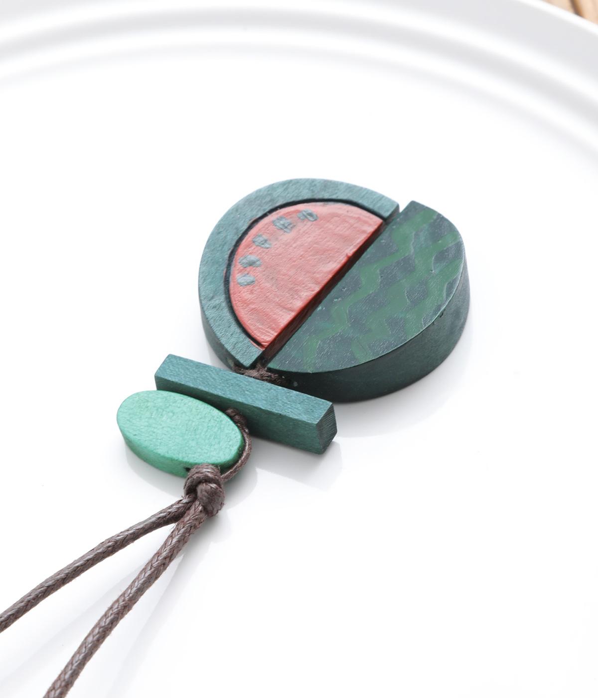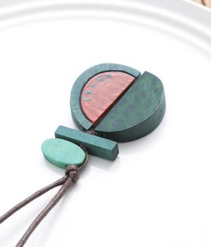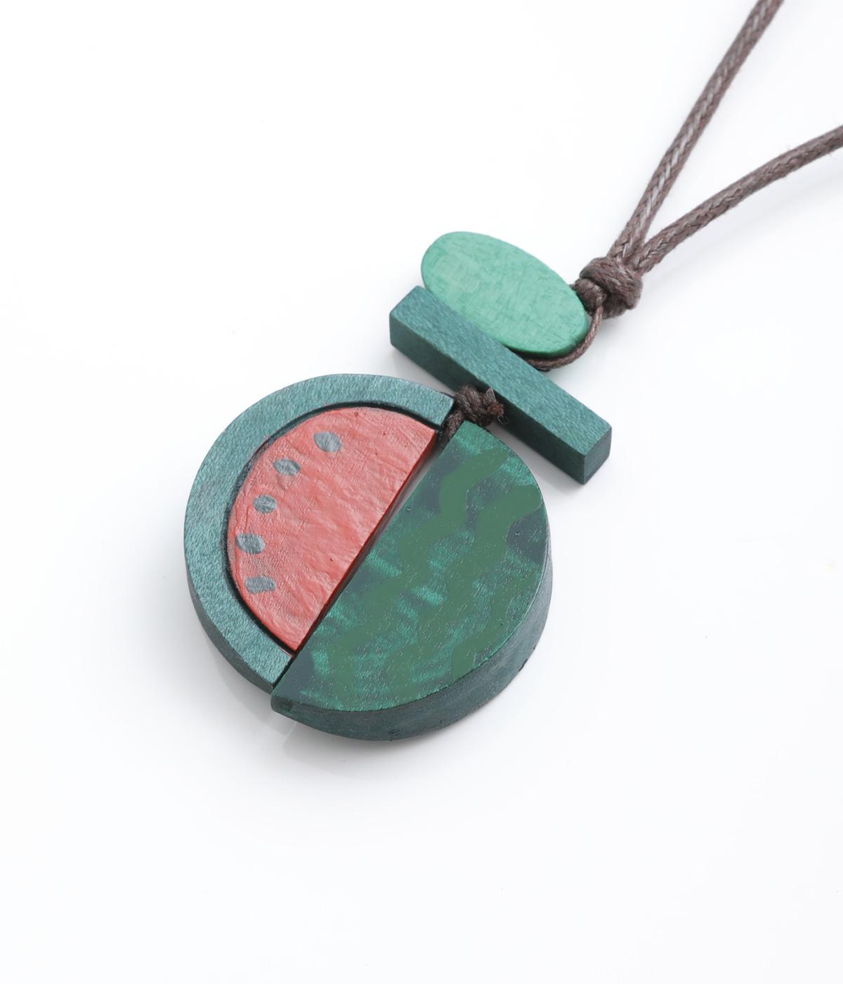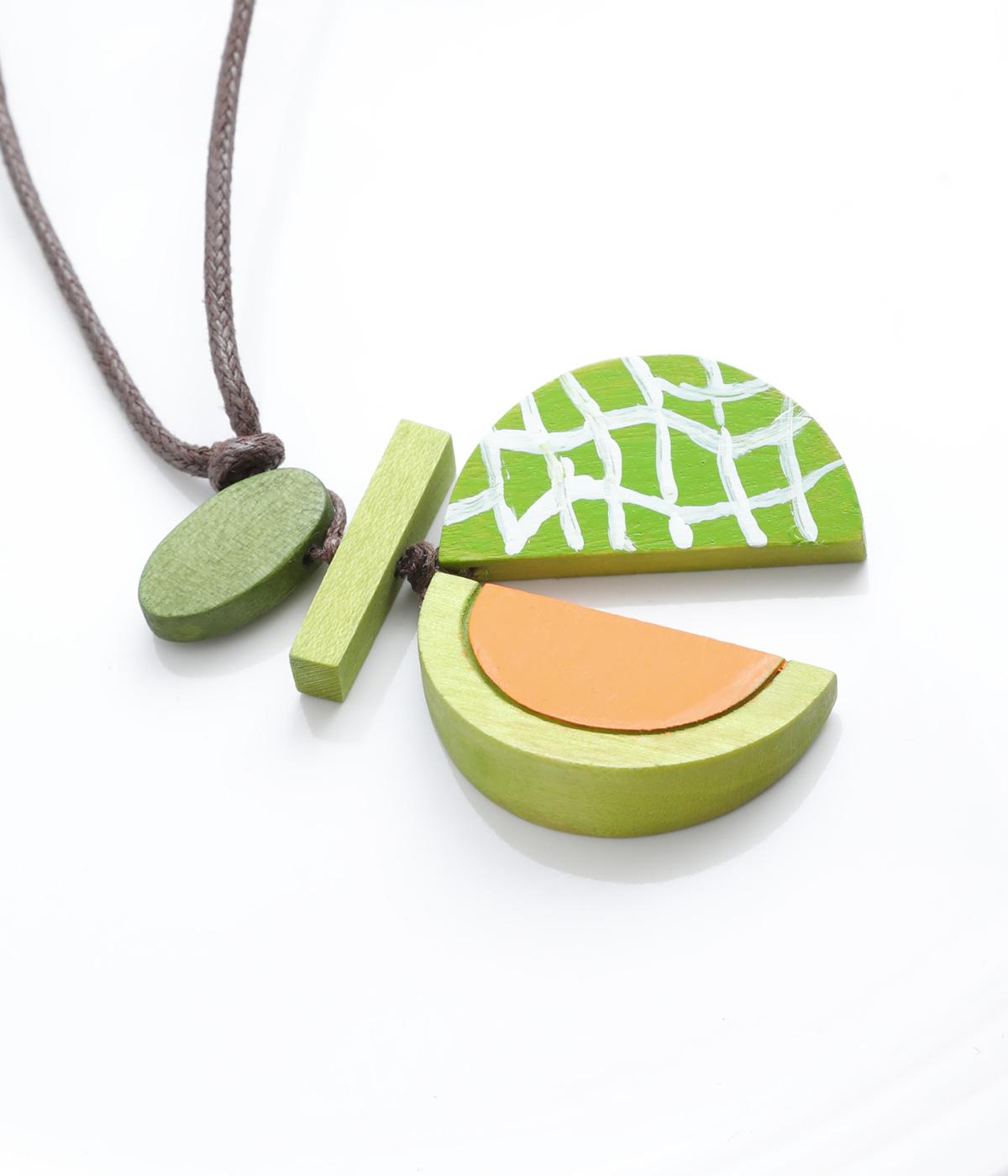 果物を象徴する皮のデザインとカット面、どちらも表現したユニークなモチーフ。ポップなカラーリングとウッドのナチュラル感が調和し、コーディネートに華やかなワンポイントを添えます。長さも自在に調整可能。