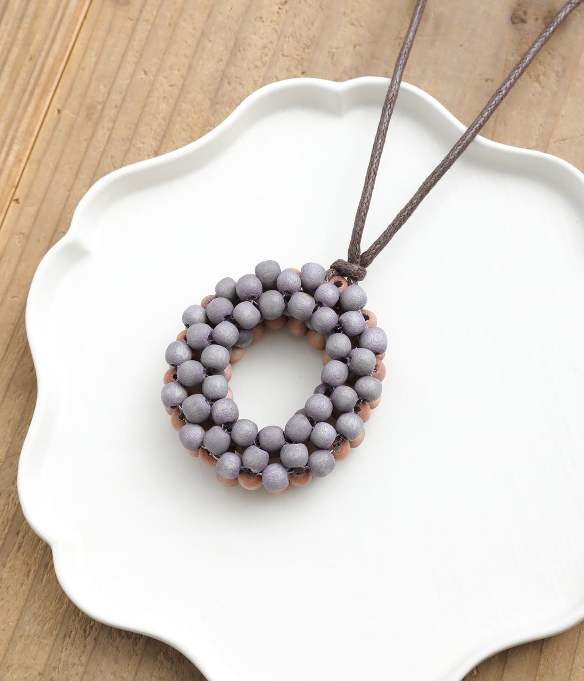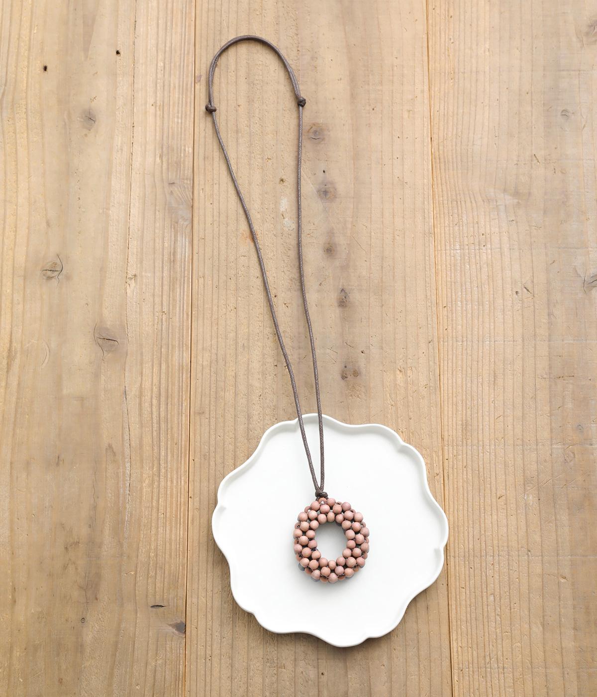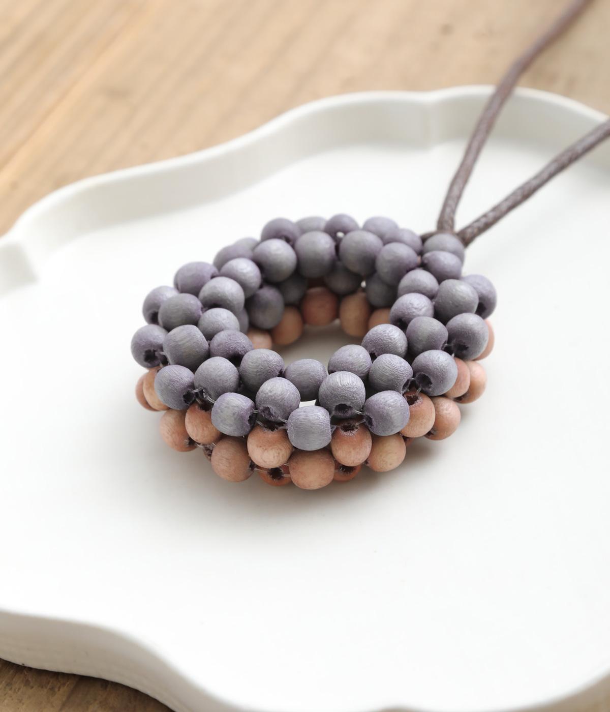 つぶつぶしたウッドビーズをリング状にあしらい、印象的なドーナツモチーフに。立体的なフォルムにバイカラーが着こなしのワンポイントになり、裏表どちらもたのしめる2wayで、その日の気分やスタイリングに合わせてアレンジ可能。
