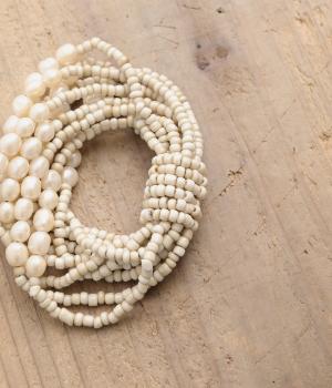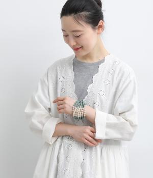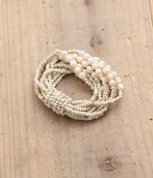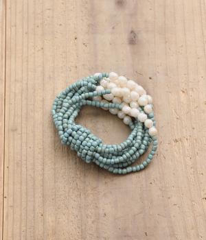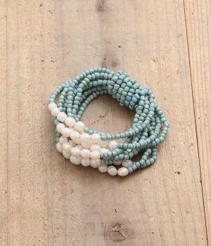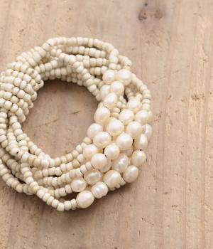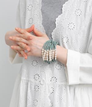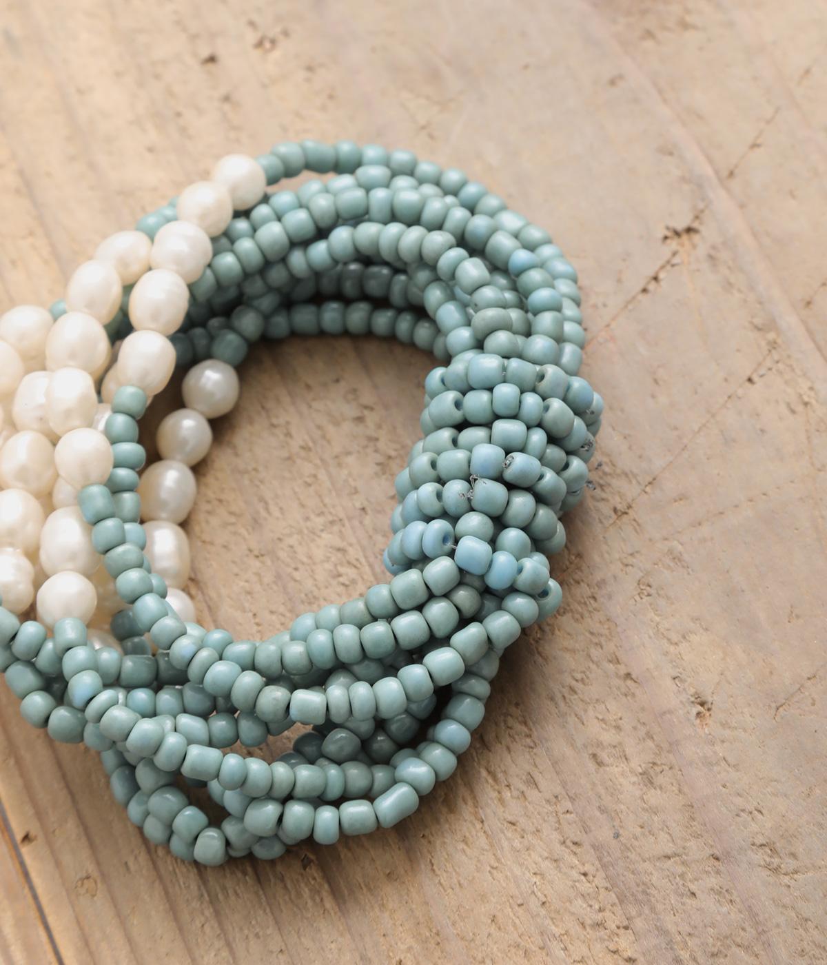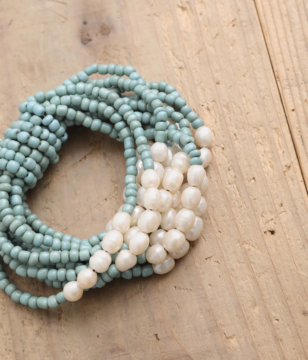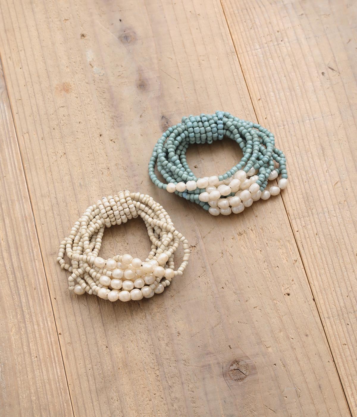やわらかなツヤ感が品のいいパールとビーズを組み合わせた、ゴム仕様の着脱スムーズなブレスレット。ハンドメイドならではの個体差も魅力のひとつ。