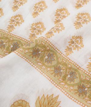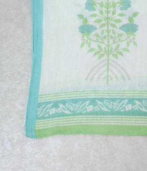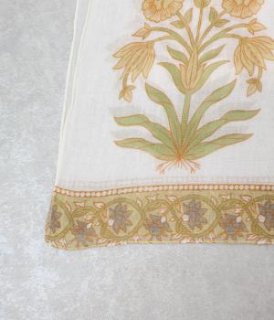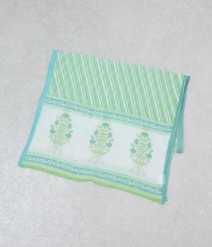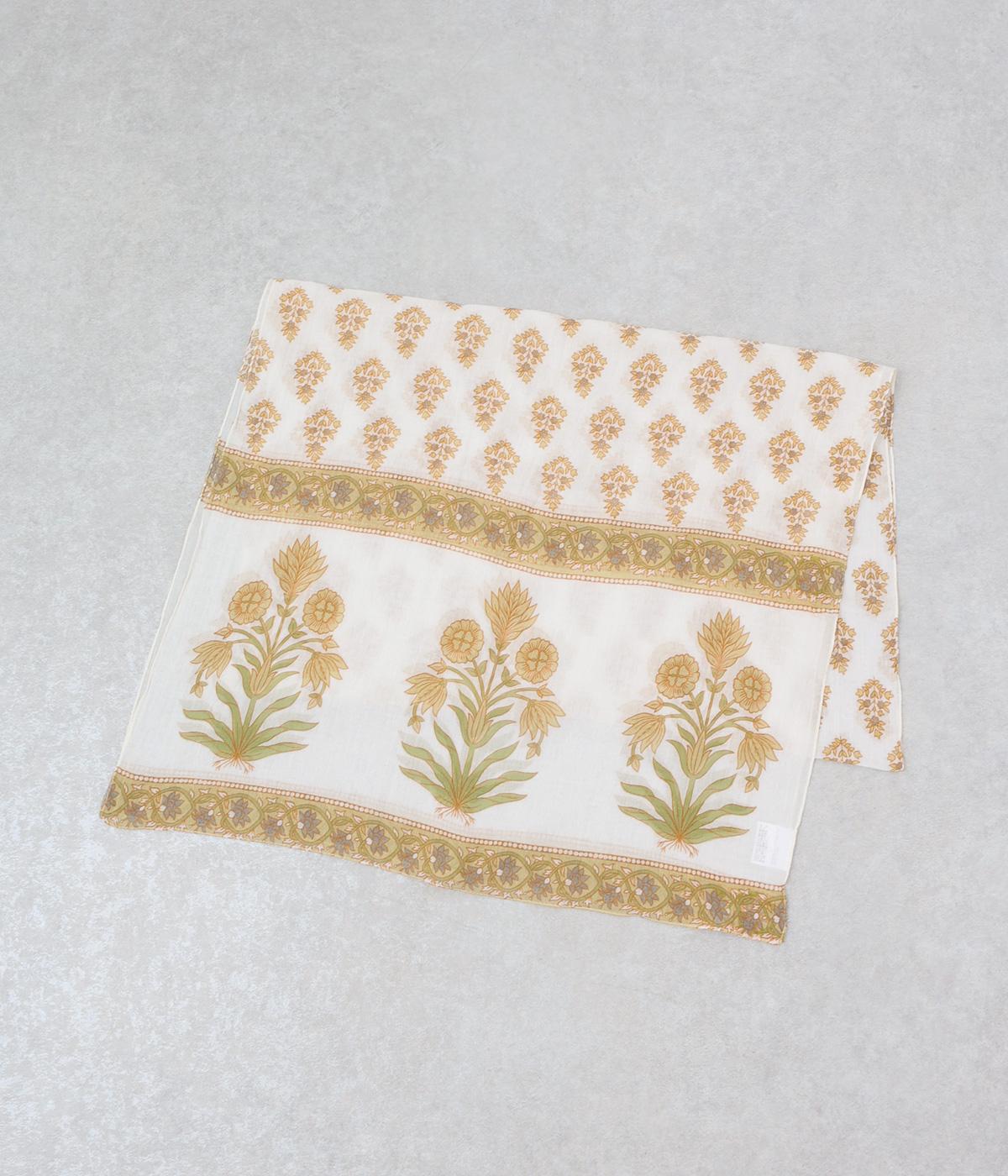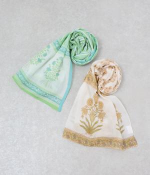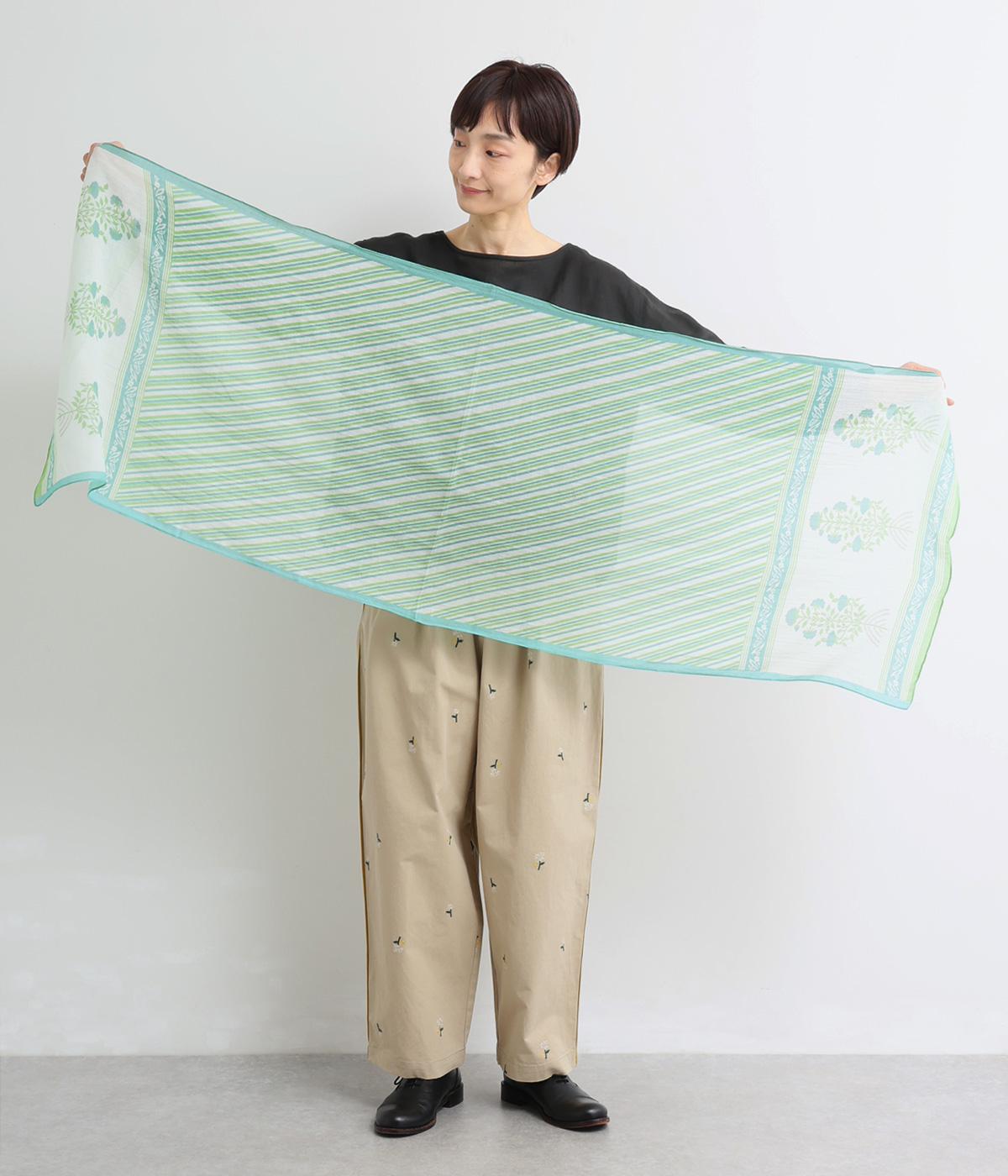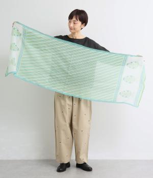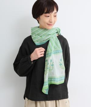 擦れたようなニュアンスがやさしい雰囲気を引き立てるリーフプリント。大判サイズながら薄手で扱いやすく、さらりと巻けるように仕立てました。肩掛けや羽織りとしてもアレンジでき、冷房対策にも重宝します。