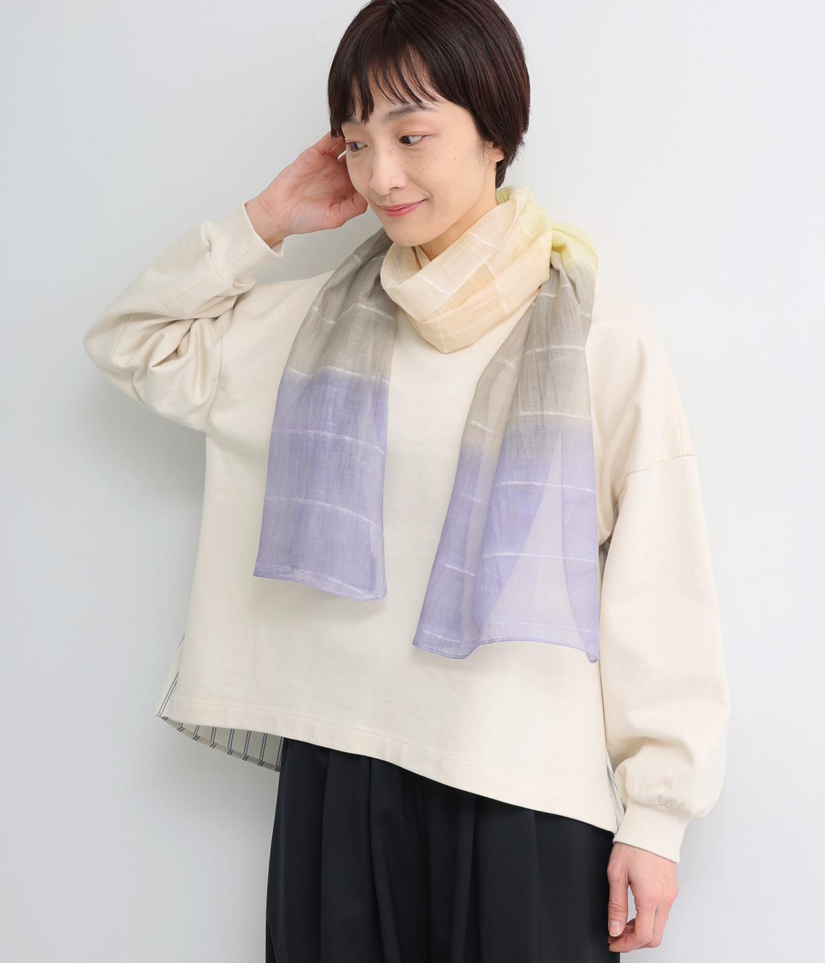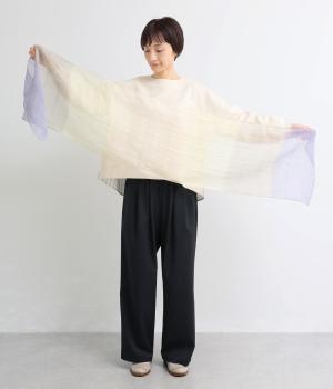 上品なニュアンスを運ぶ淡いグラデーションが空気をはらんでふわりと揺れ、顔まわりを明るく見せてくれます。巻き方次第でさまざまな表情が楽しめるのも魅力です。使いやすいサイズ感で、冷房対策や日除け用として持ち運びにも便利です。