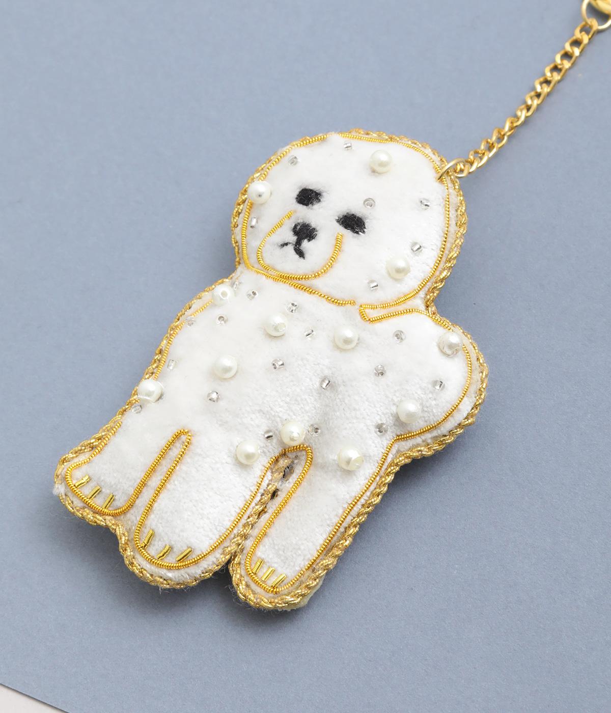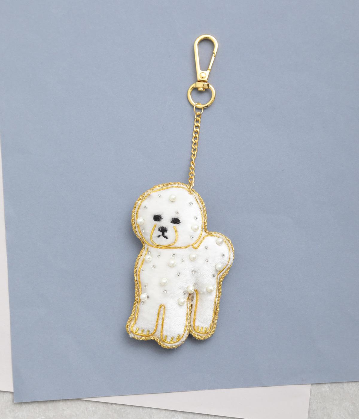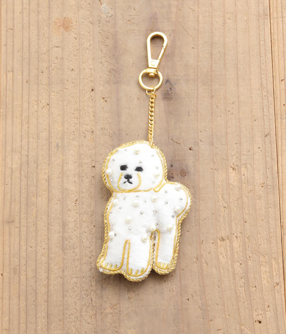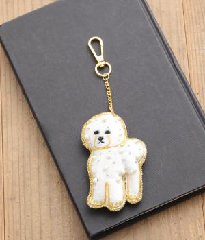 ビション・フリーゼの綿あめのようなふわふわした巻き毛を起毛感ある素材でリッチに表現。ゴールドステッチにパールやビーズで愛らしい表情も丁寧に描き、犬好きにたまらないキーホルダーに。バッグチャームにするのもおすすめ。