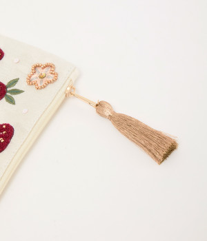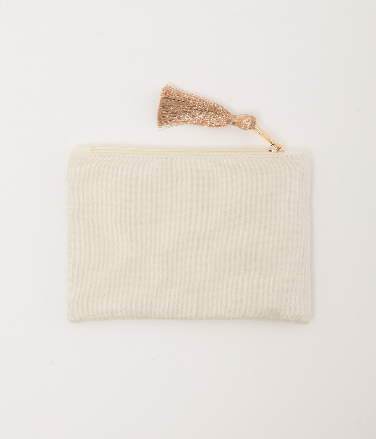 いちごをモチーフにした甘酸っぱさただようデザインを、クラフト感たっぷりに仕上げました。ポーチそのものがアクセサリーのように可愛らしく、バッグから出した時も気分が上がります。ファスナーにはボリューミーなタッセルをつけてポイントに。