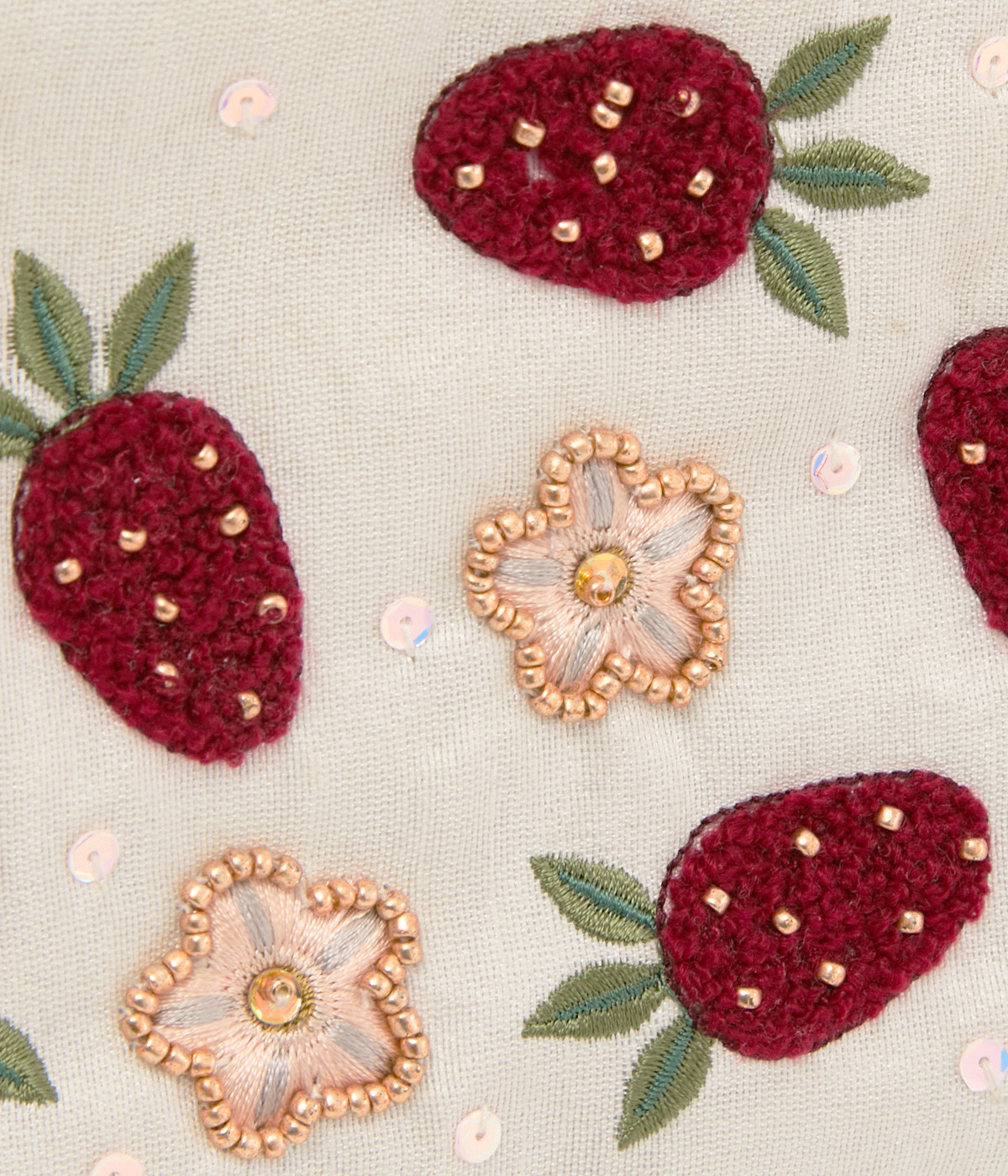 インド特有の色鮮やかなビーズ刺しゅうがほどこされ、可愛らしいインパクトを放ちます。 刺しゅうは全て職人の手作業によるもの。ビーズ刺しゅうだけではなく、サガラ刺しゅうやスパンコールなどを合わせて楽し気に仕上げています。