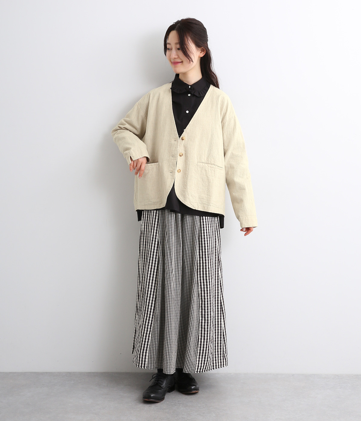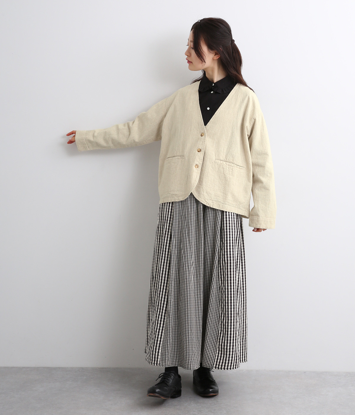 顔まわりをシャープに見せる、すっきりとあいたネックライン