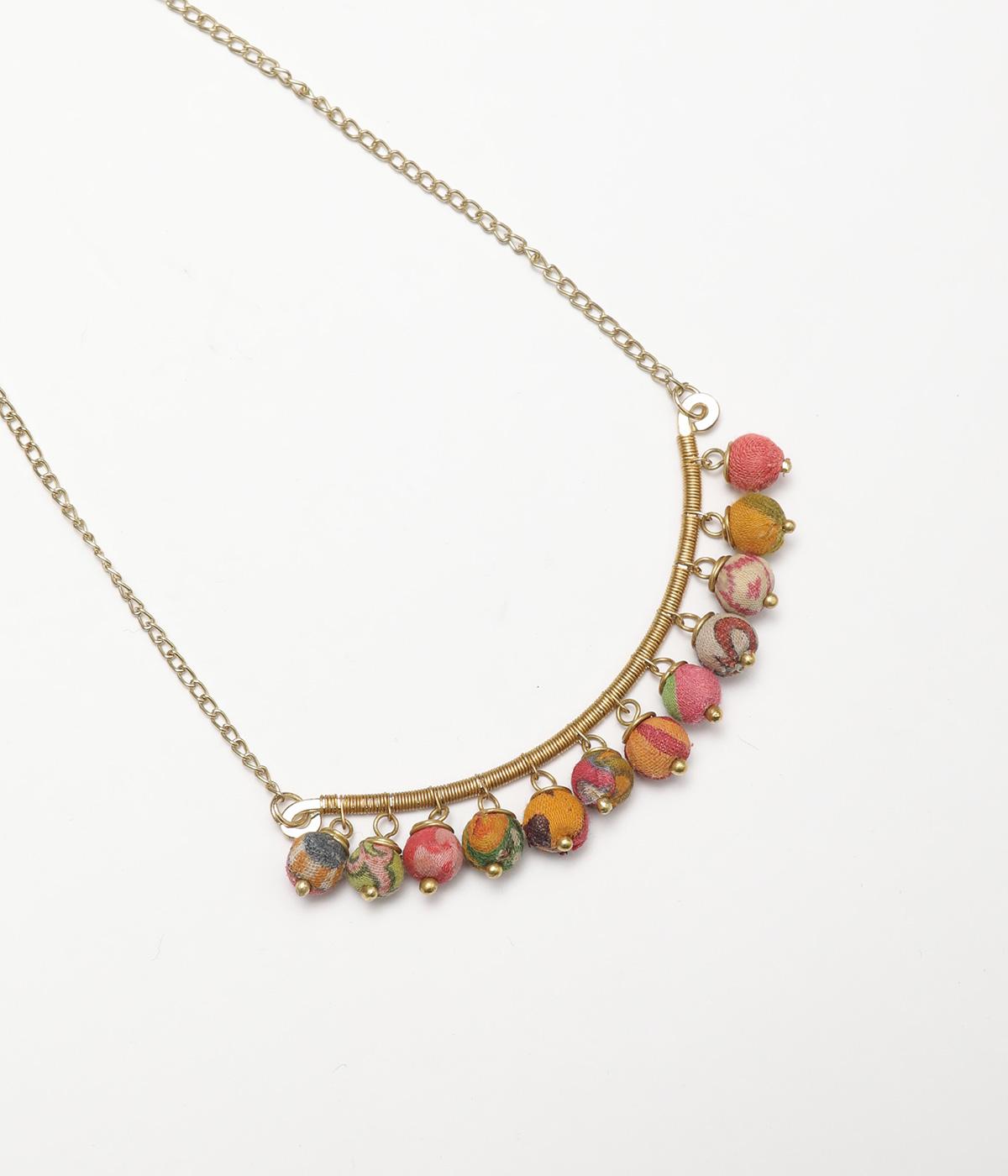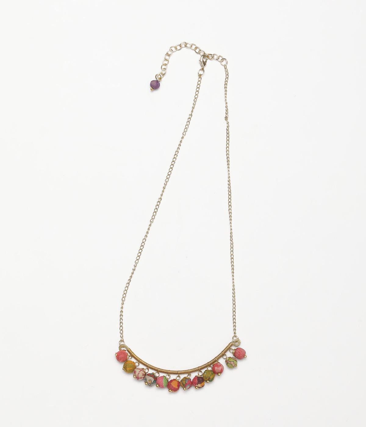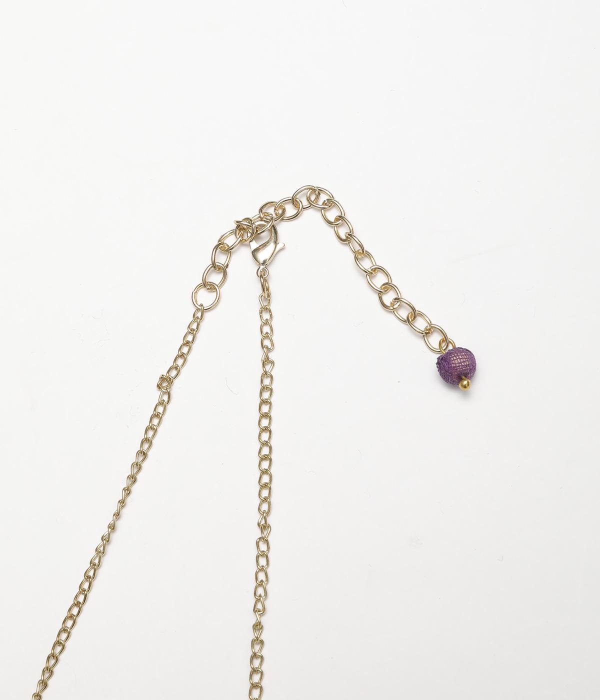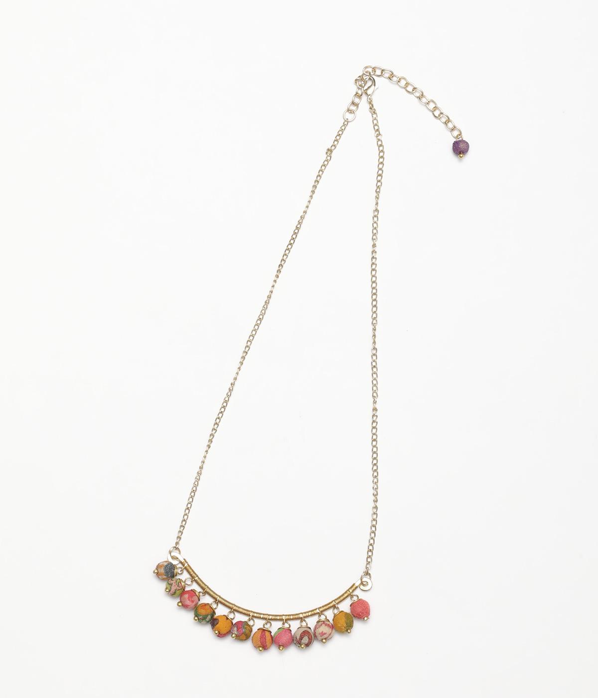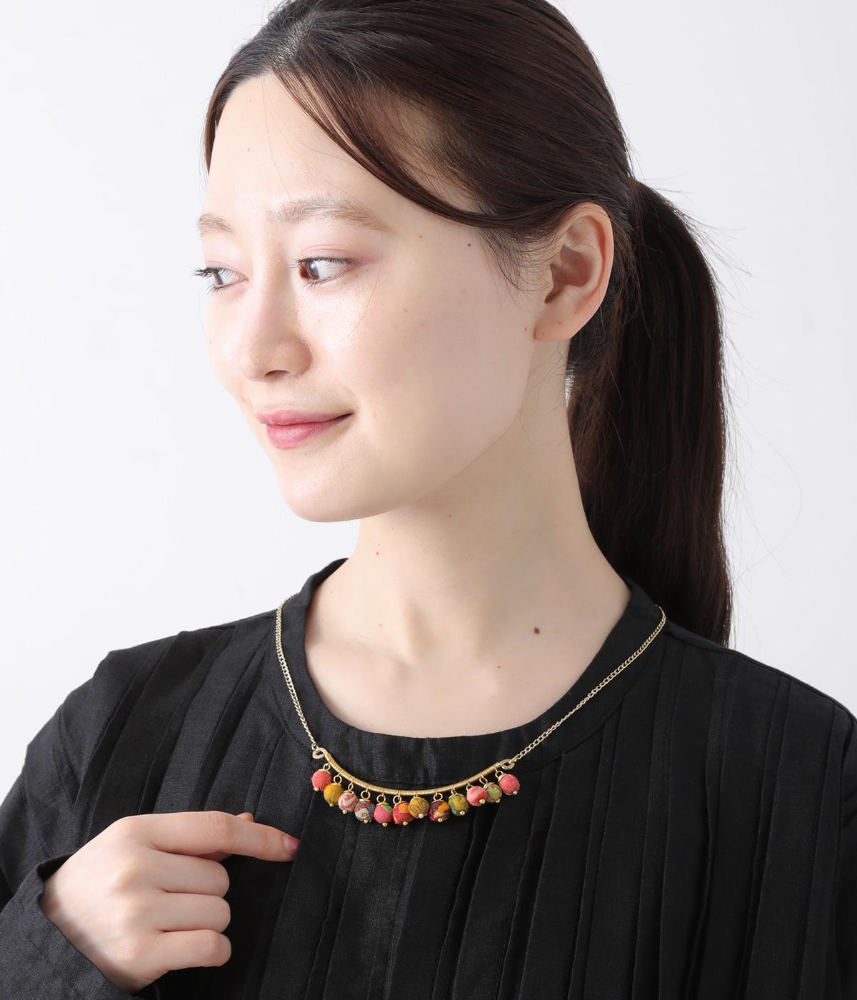 ワイヤーを巻いたラウンドパーツに色鮮やかなラリーボールを並べた、顔まわりを華やかに彩るネックレス。それぞれのボールが揺れ動いて視線を集めます。後ろ姿のアクセントになる、チェーン先端についたラリーボールにも注目です。
