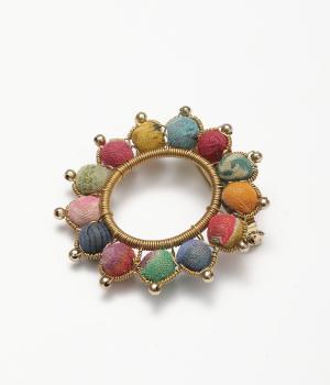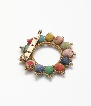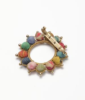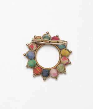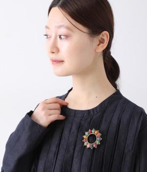 サークルパーツにラリーボールを丁寧に取りつけたこだわりのブローチ。くるくると巻いたワイヤーやゴールドのビーズが、どこかアンティークなムードをただよわせます。針をロックできる回転式のブローチピンを使用しているので、安心して着用できるのも魅力。