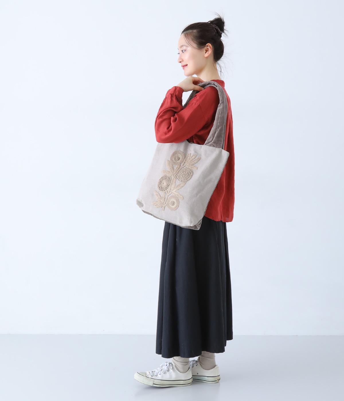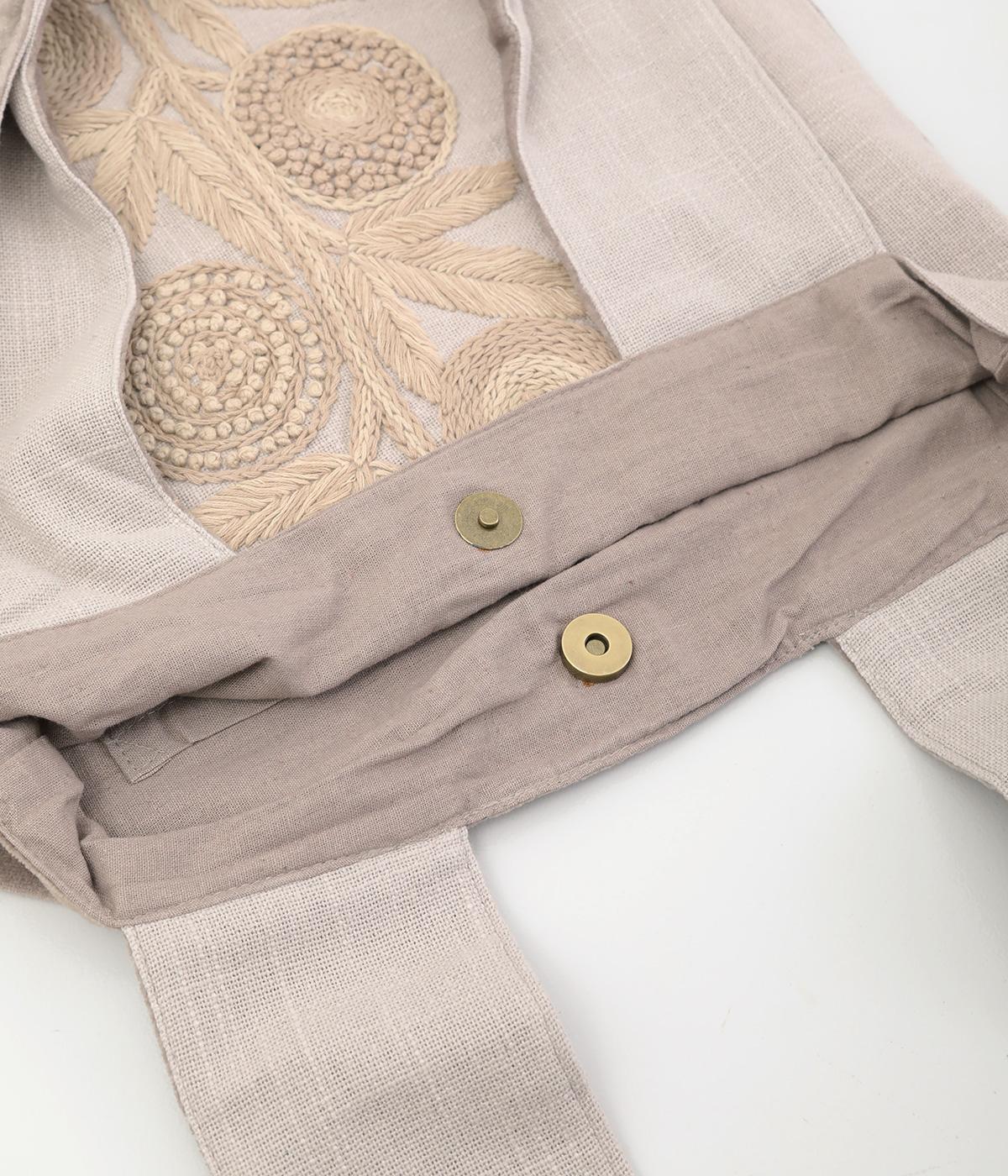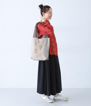 大胆なフラワー刺しゅうが目を引くトートバッグ。全体を同系色でまとめているので、派手にならずコーディネートに合わせやすいのが◎です。ハンドルは長めに設定しており肩掛けも可能。開口部はマグネットボタン仕様で開閉も簡単です。