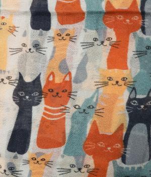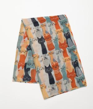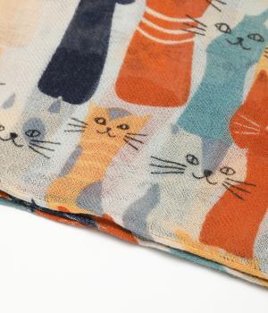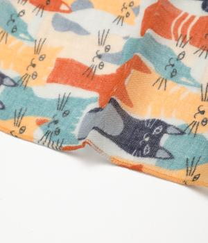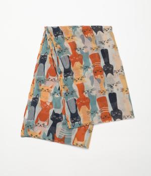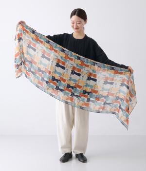 さまざまな種類の猫が並んだ、目に入るたびに癒しをくれそうなストール。絶妙なくすみカラーを使用しているので、大人っぽくつけられるのが魅力です。首元にくるりと巻くだけでサマになる長方形デザインで、ストール初心者の方にもおすすめ。