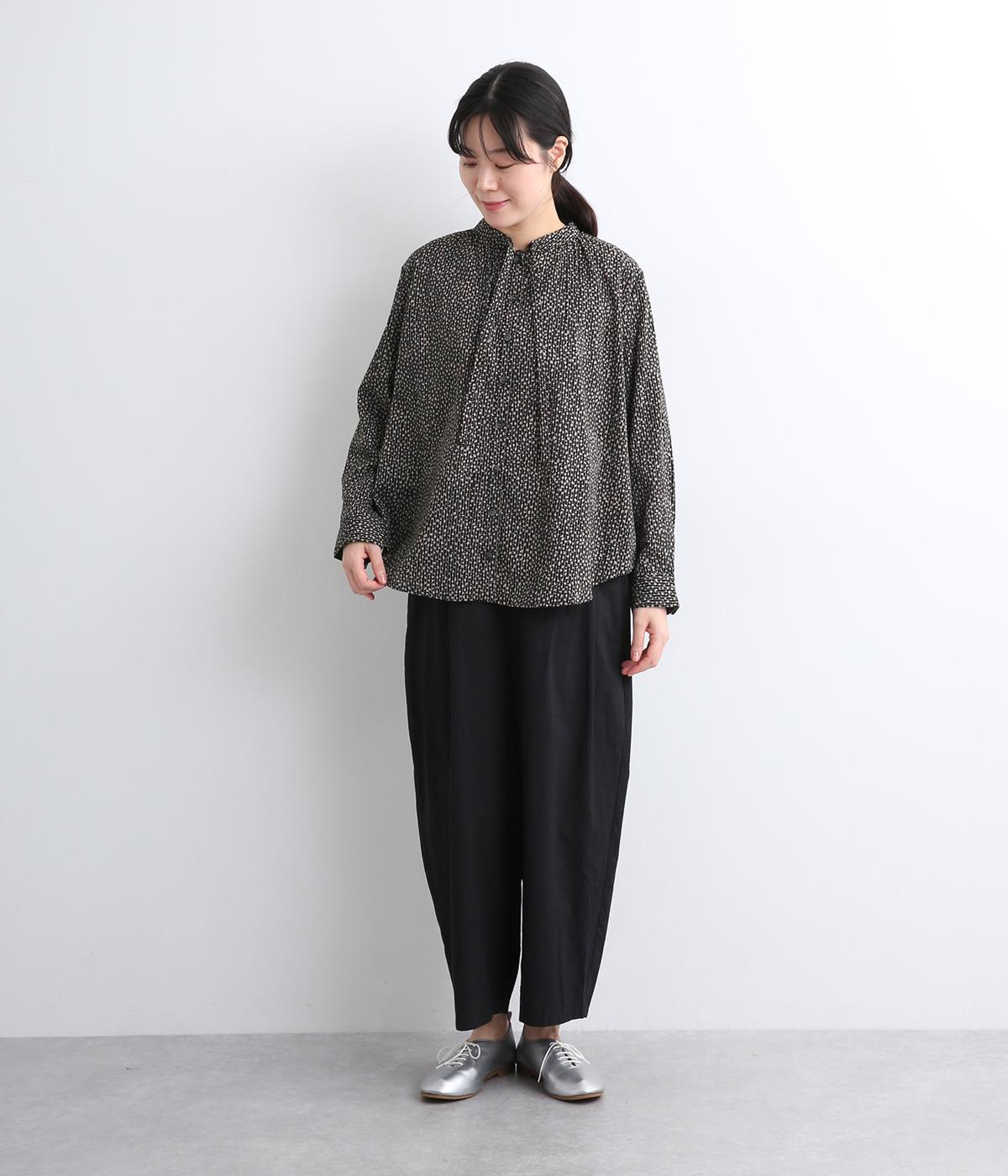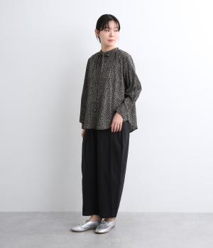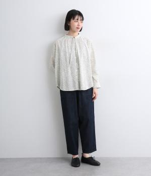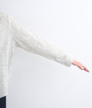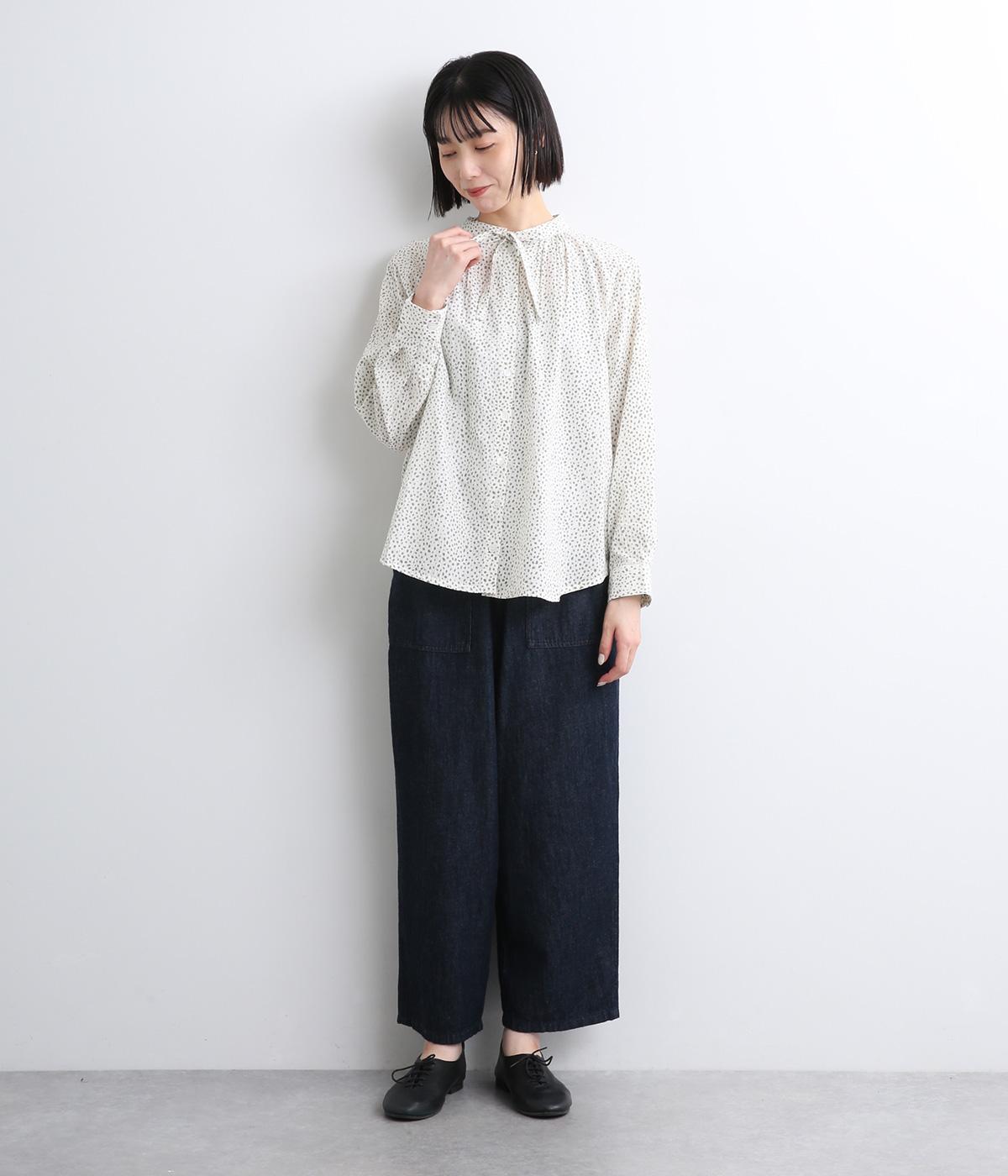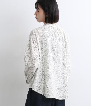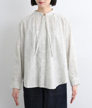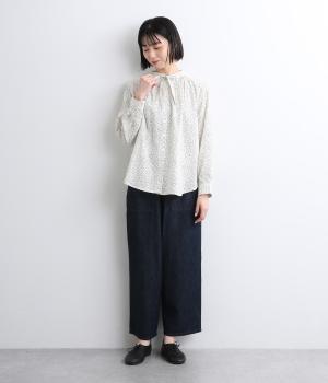 襟元に寄せたギャザーと細身のリボンがポイントのブラウス。リボンはしぼることも可能で顔まわりにニュアンスを出せます。一枚着からニット合わせまで汎用性も高く、羽織り使いも◎。袖口はボタンを2つつけ、サイズや着心地で寸法を調節できる仕様に。