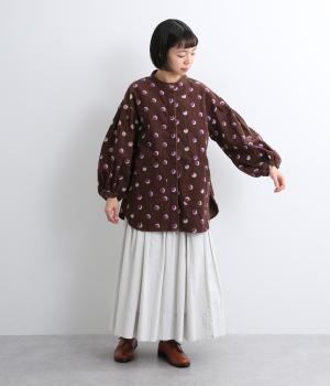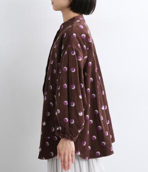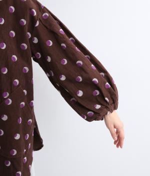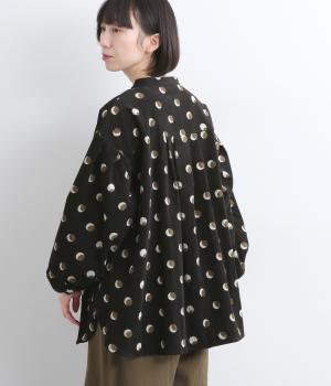 手仕事感のあるドットプリントに、ふっくらとしたランタンスリーブを合わせたブラウスです。ゆったりシルエットで重ね着がしやすく、軽めのアウター使いにもおすすめです。袖口はゴム仕様なので、着こなしに表情がつけやすいのもうれしいポイント。丸みのあるポケットがやわらかい印象を添えてくれます。