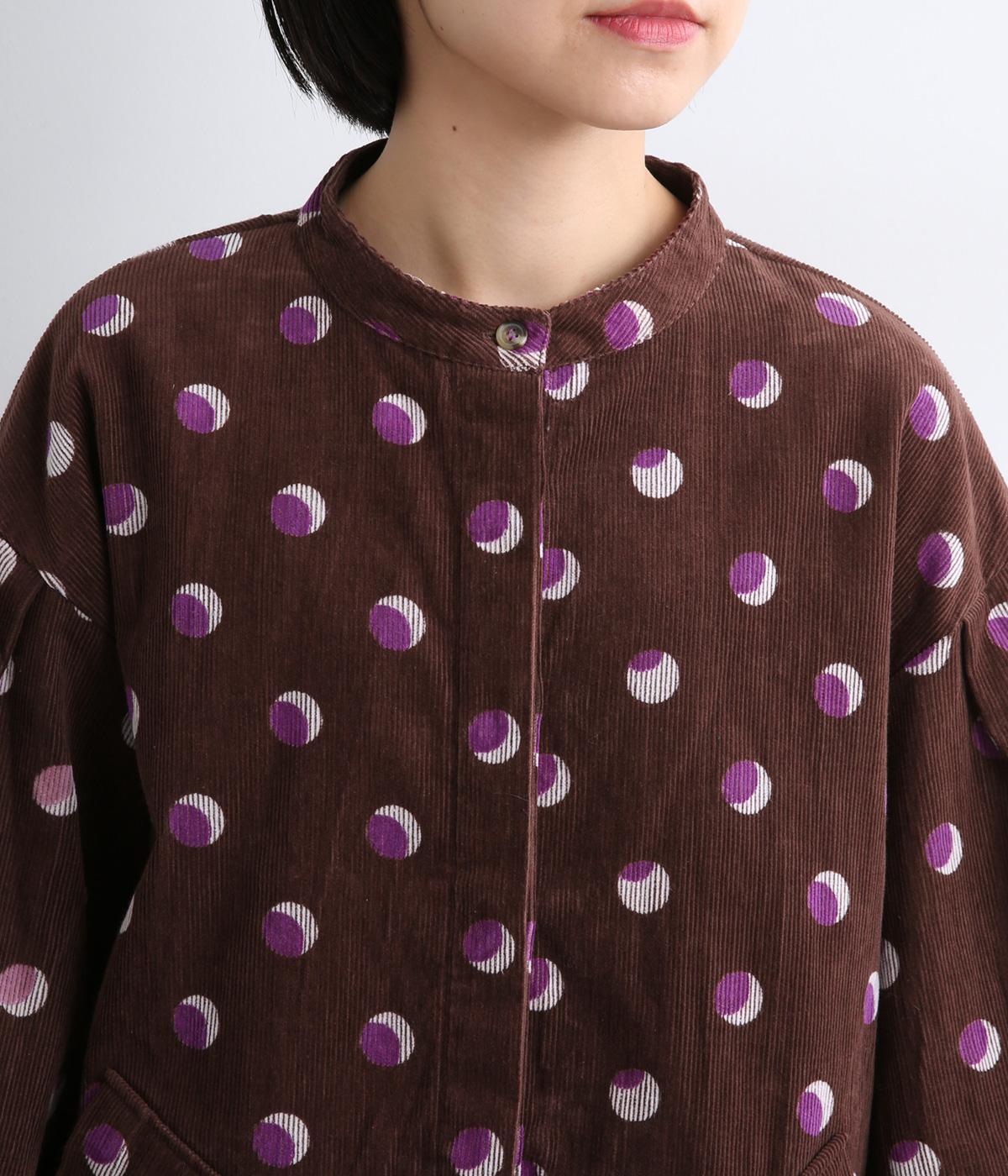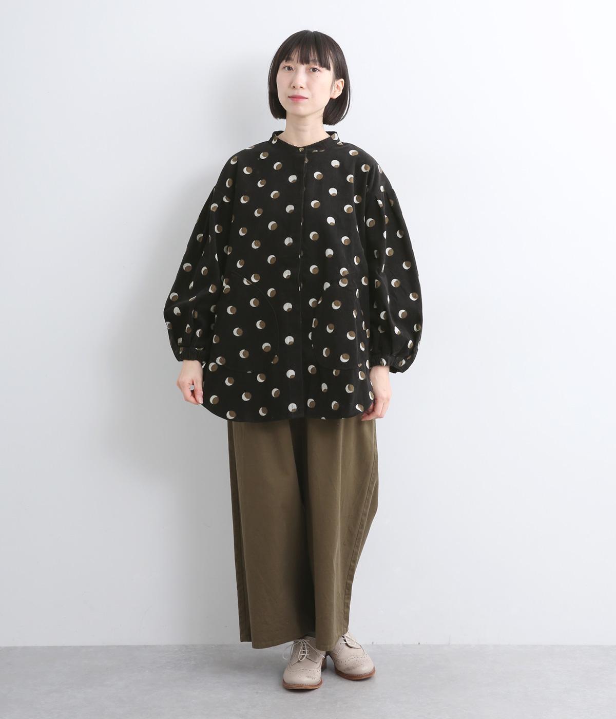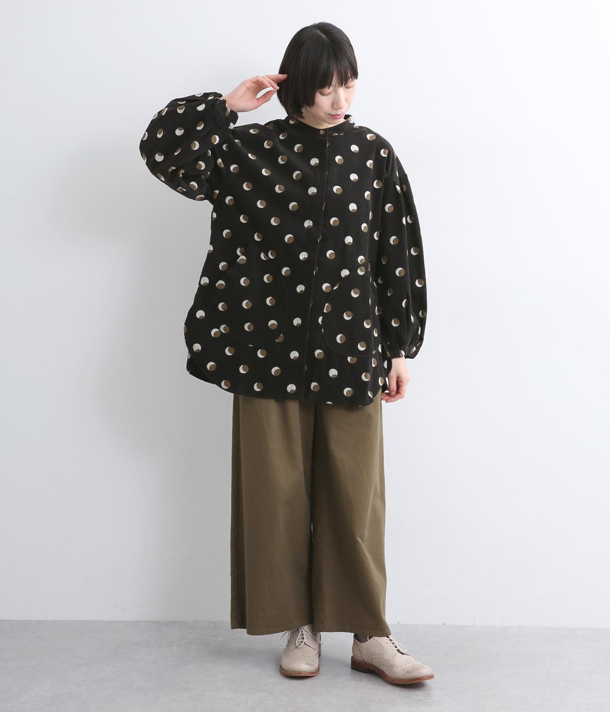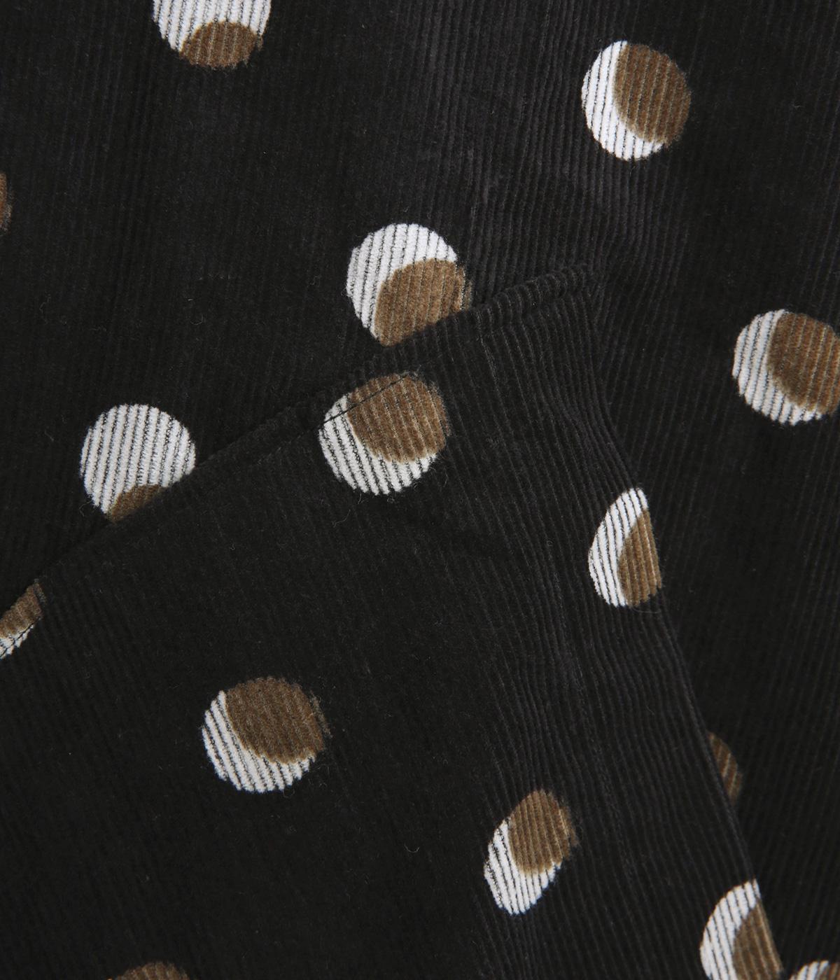 中畝のコットンコーデュロイに、ハンドスクリーンで水玉をのせた、あたたかみのある素材です。適度な厚みとやわらかな風合いが魅力で、ほどよいハリ感がきれいなシルエットをキープします。