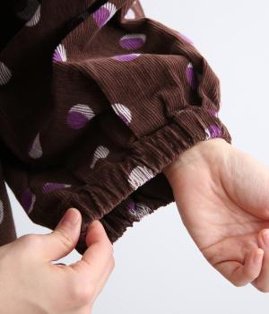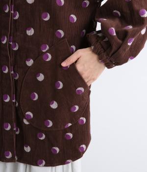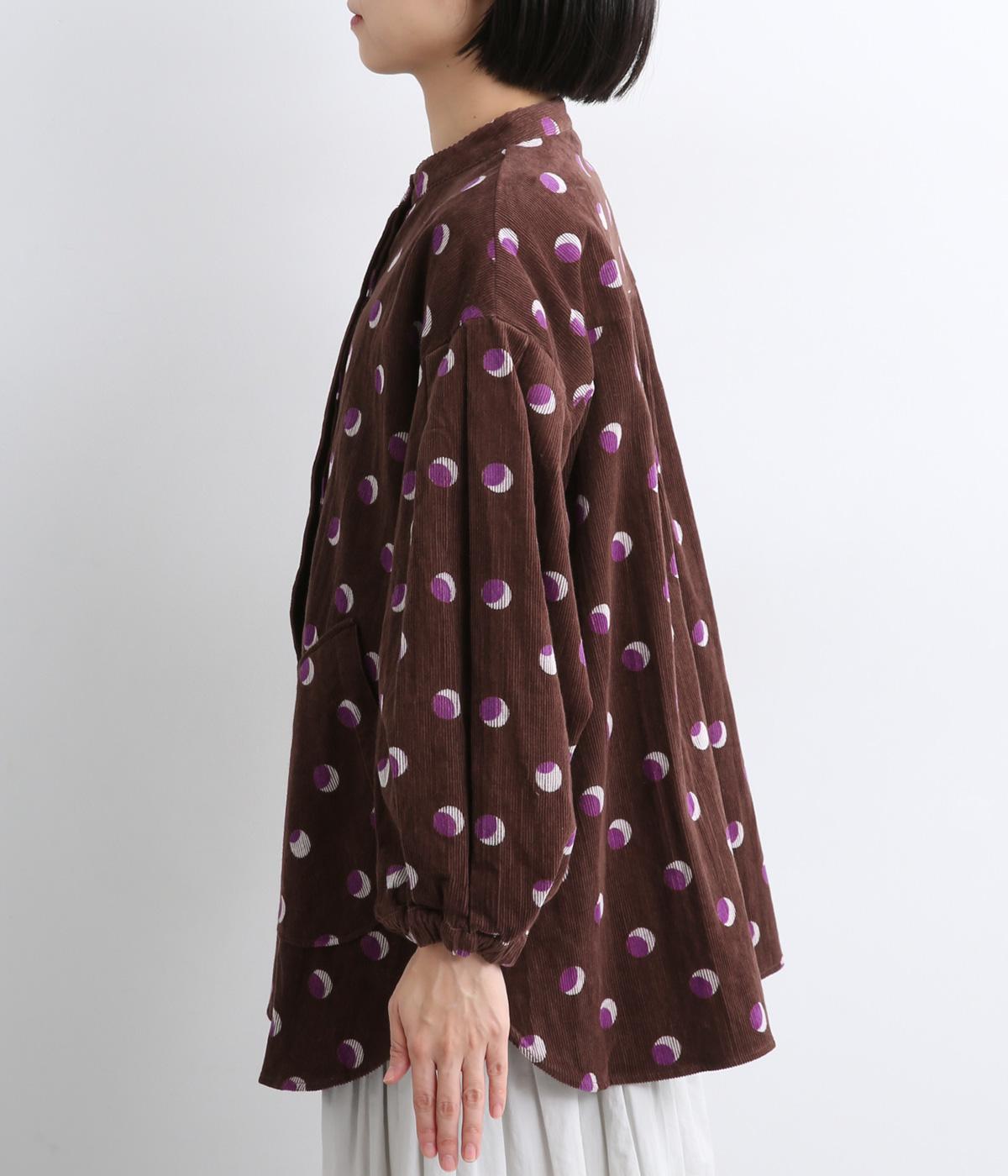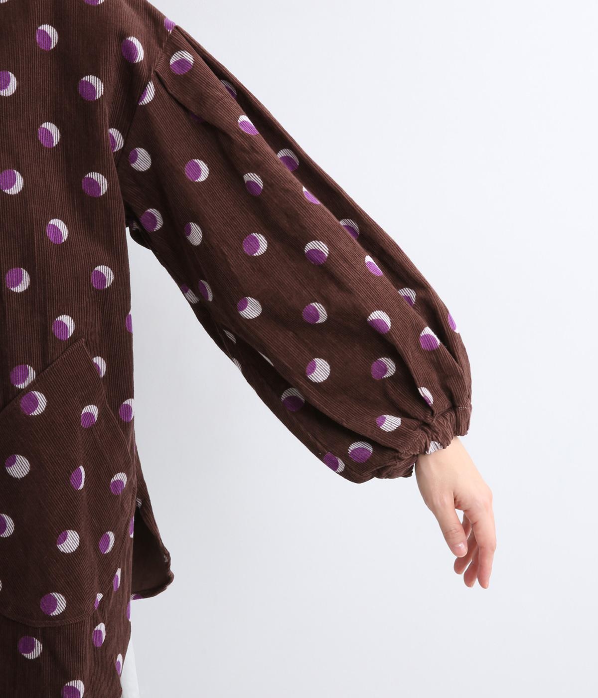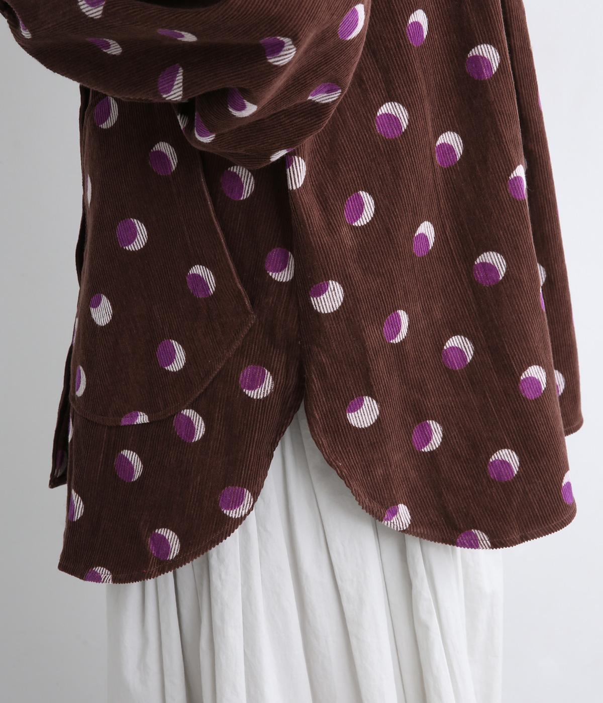 中畝のコットンコーデュロイに、ハンドスクリーンで水玉をのせた、あたたかみのある素材です。適度な厚みとやわらかな風合いが魅力で、ほどよいハリ感がきれいなシルエットをキープします。