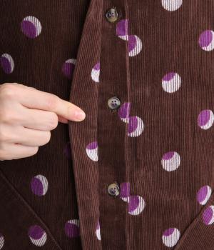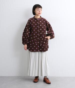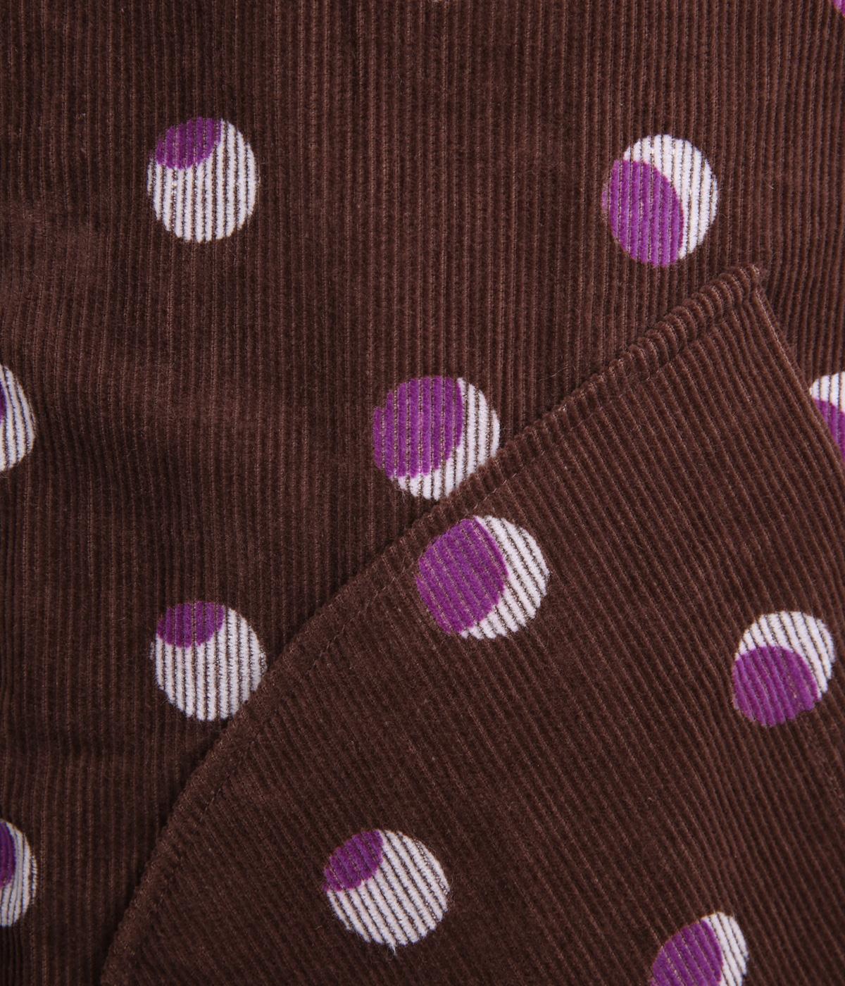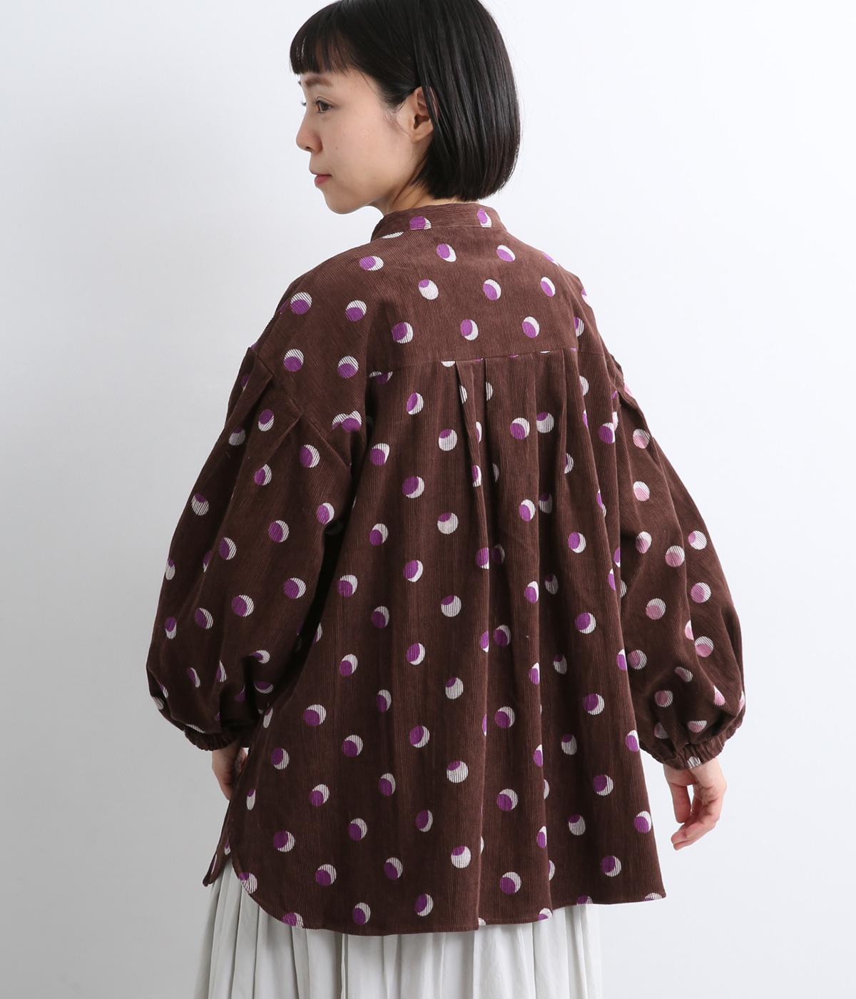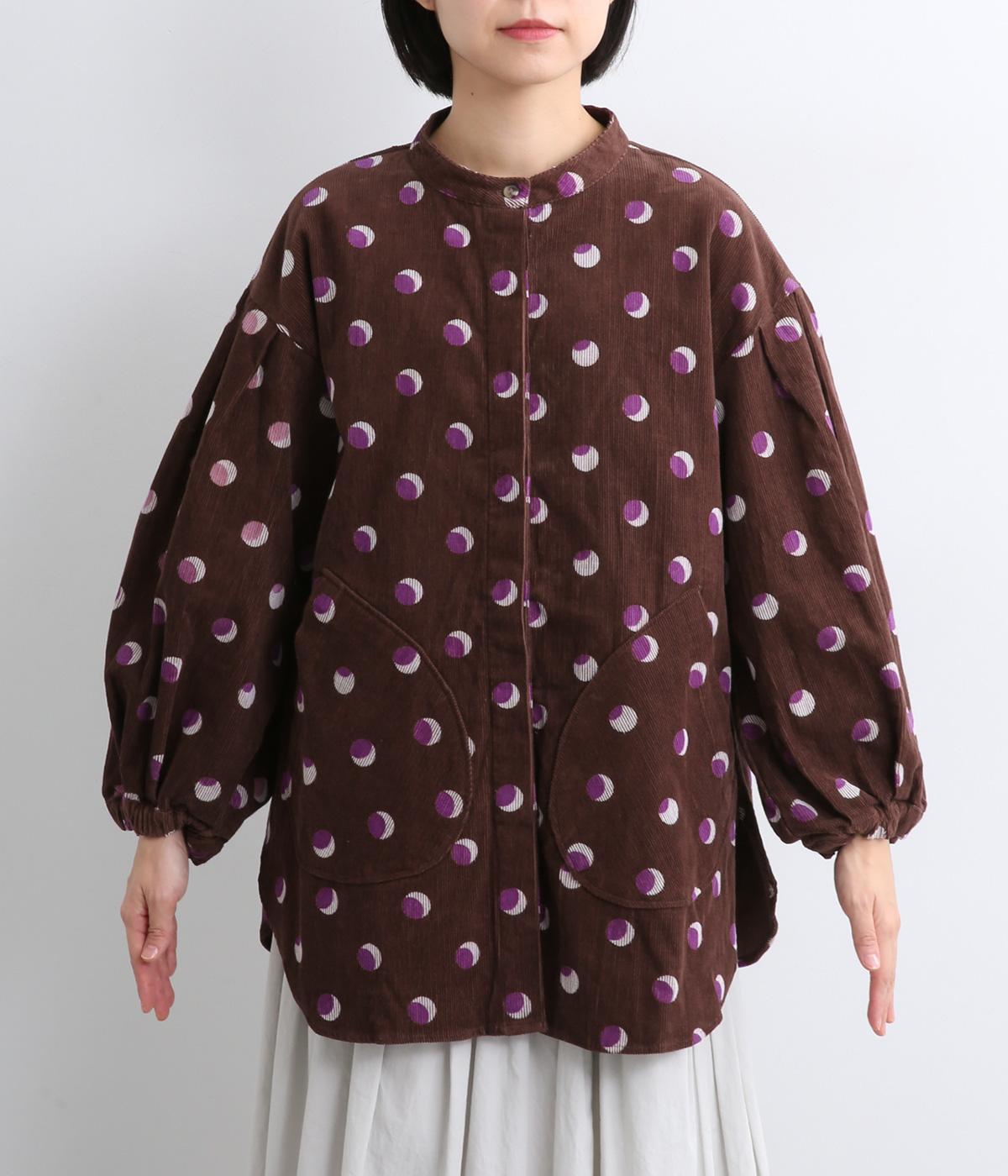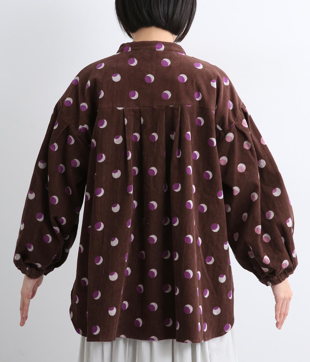 中畝のコットンコーデュロイに、ハンドスクリーンで水玉をのせた、あたたかみのある素材です。適度な厚みとやわらかな風合いが魅力で、ほどよいハリ感がきれいなシルエットをキープします。