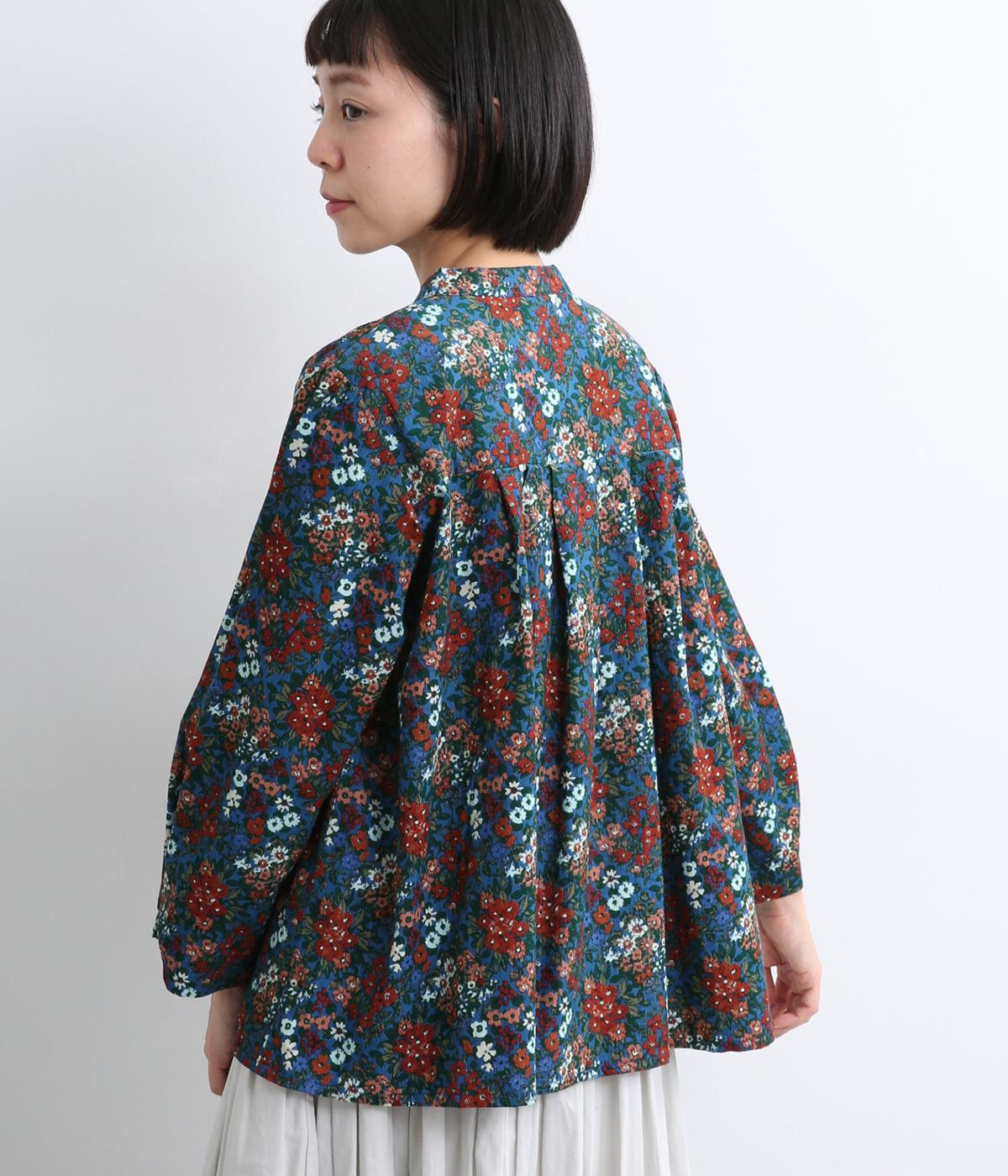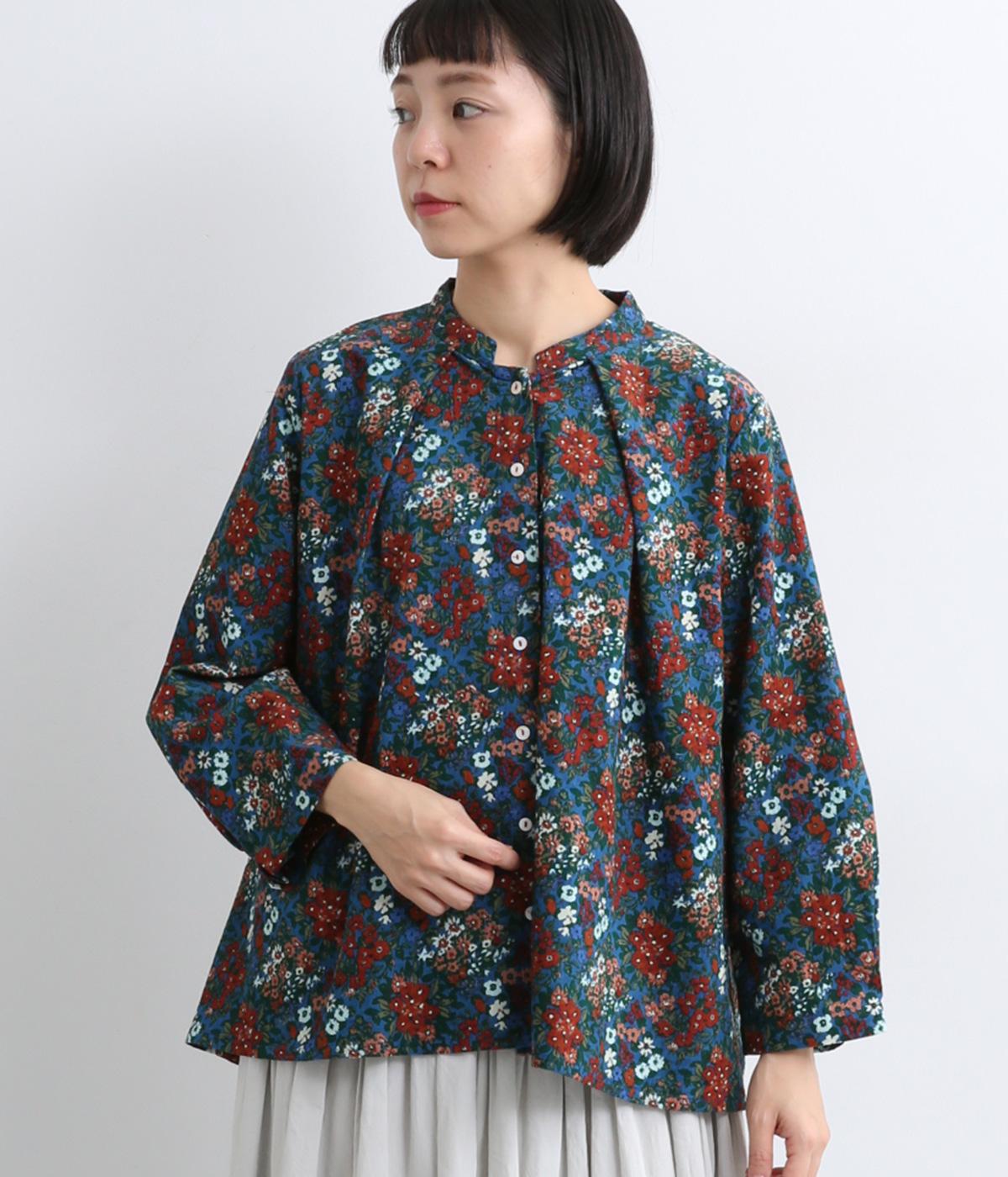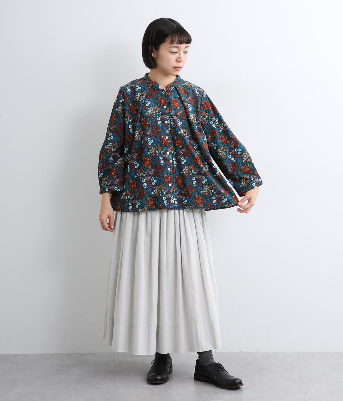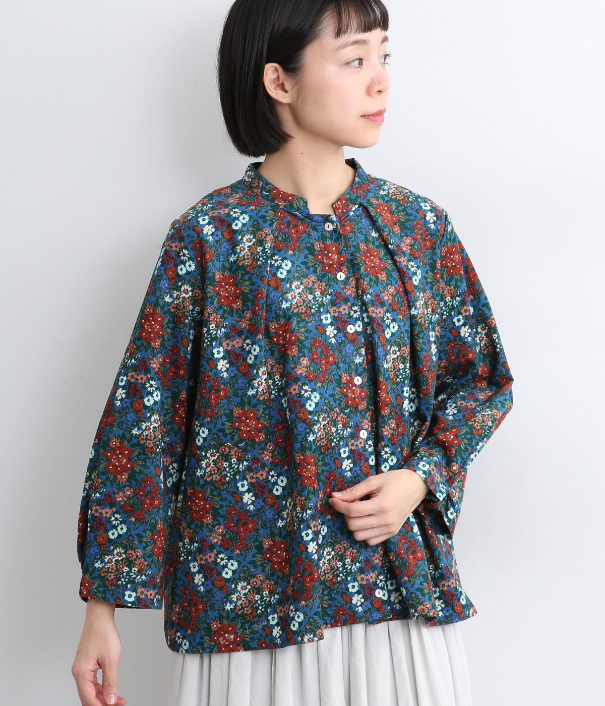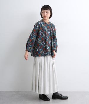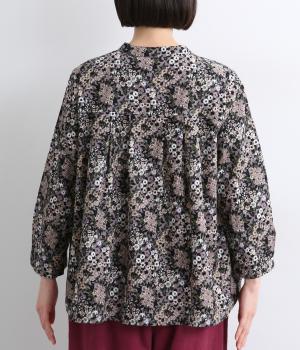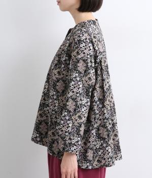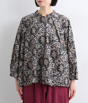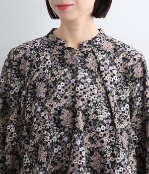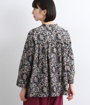 小花のブーケ柄を散りばめた、可憐な雰囲気のブラウスです。首元と袖口に入れたタックがふんわりと丸みをつくり、やさしい立体感を生み出します。ゆったりとしたシルエットで、重ね着しやすいのもうれしいポイント。薄手のタートルネックなどをインすれば、季節感のあるコーディネートが完成します。