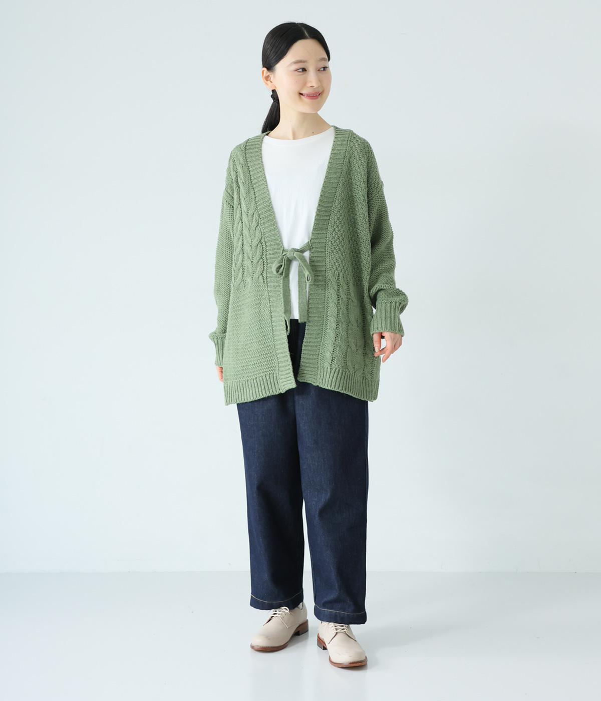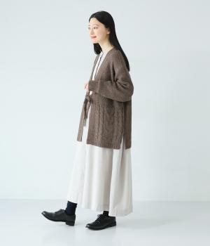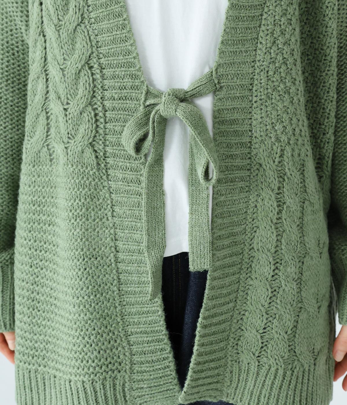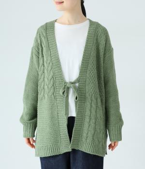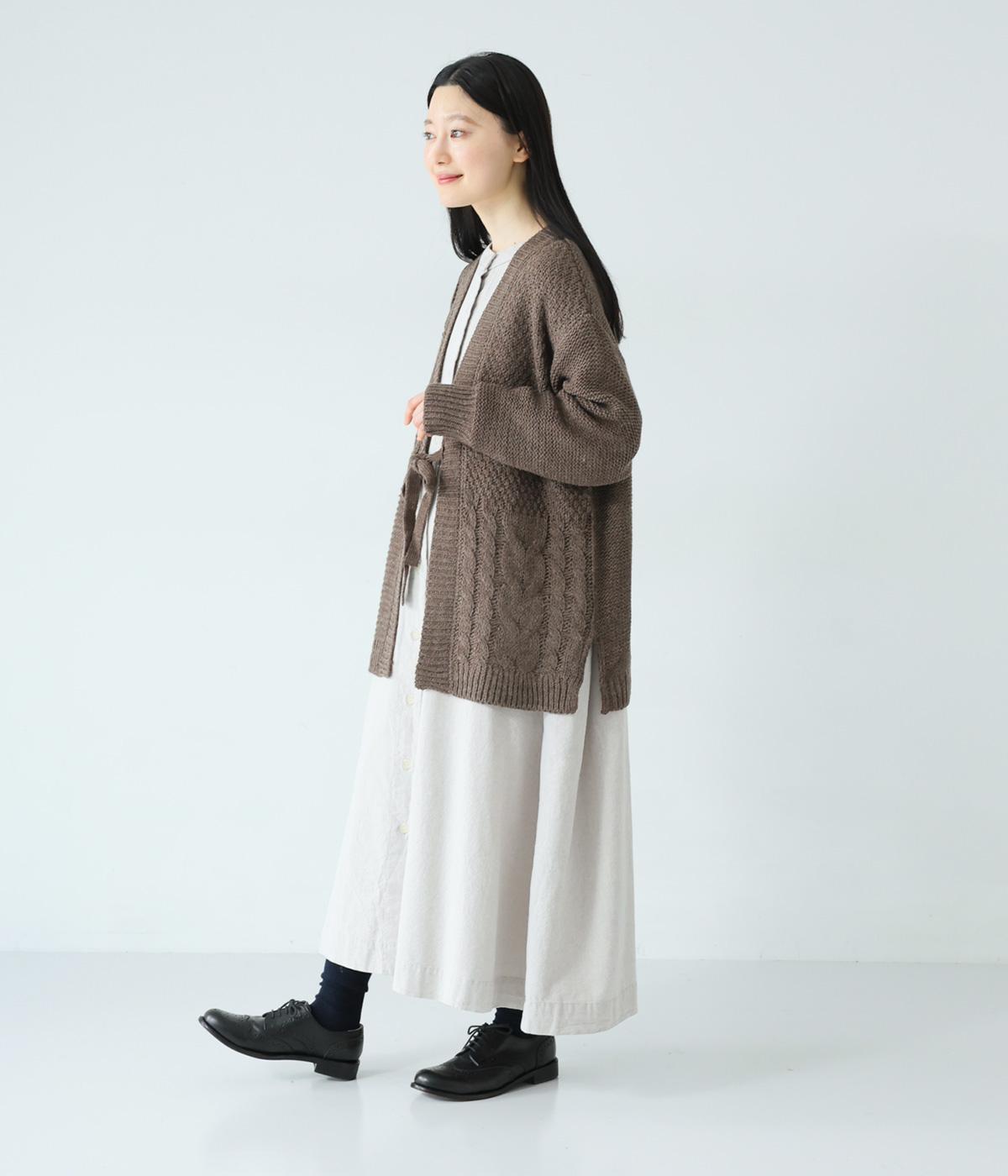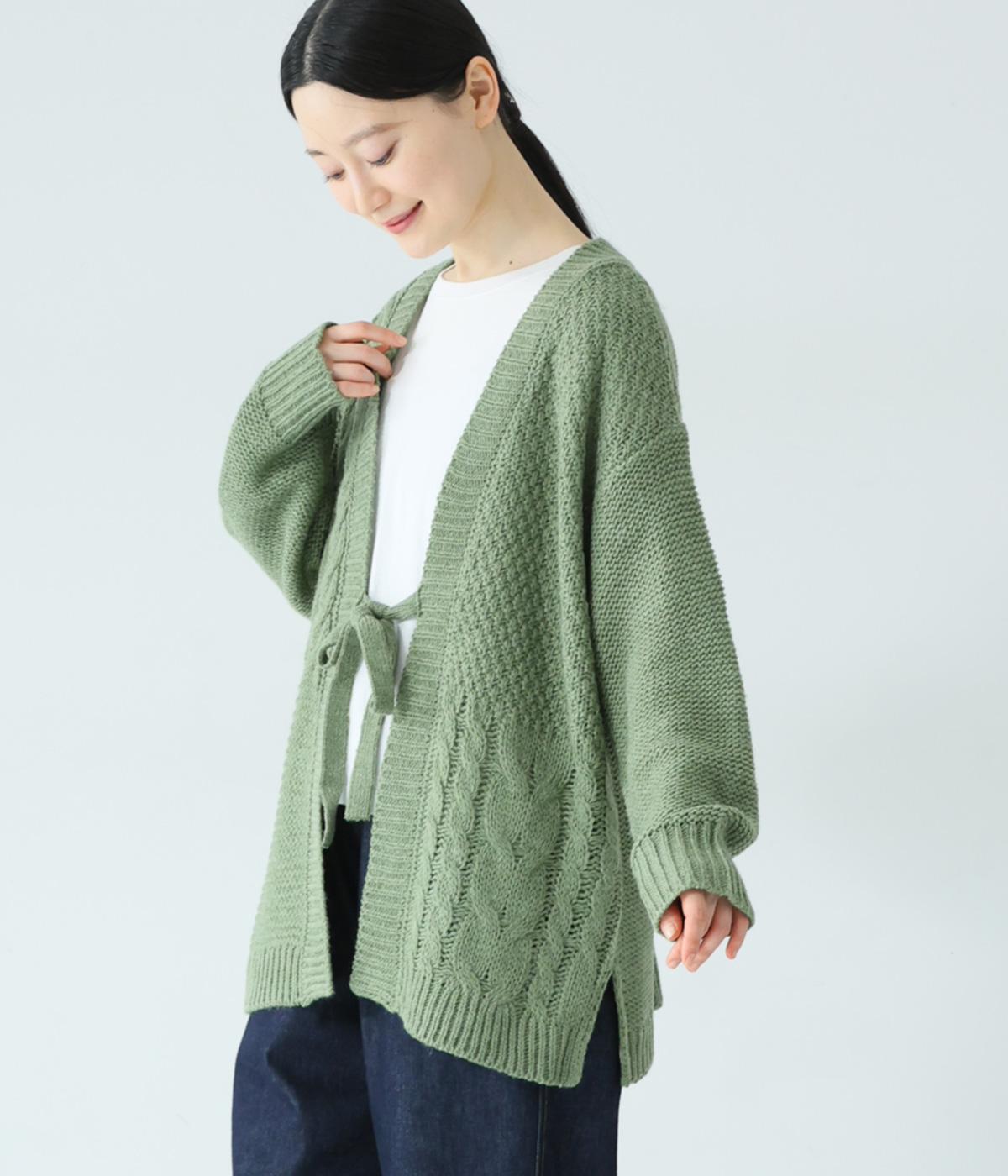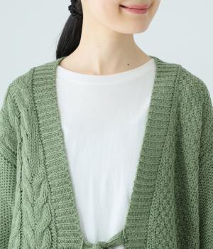 アシンメトリーで立体感のある編み模様が映えるケーブルニットカーディガン。ボタンレスの前立てとゆとりのあるシルエットがリラクシーなムードを運びます。フロントの紐はきゅっとリボン結びして愛らしい印象に。裾両サイドのスリットもポイントです。