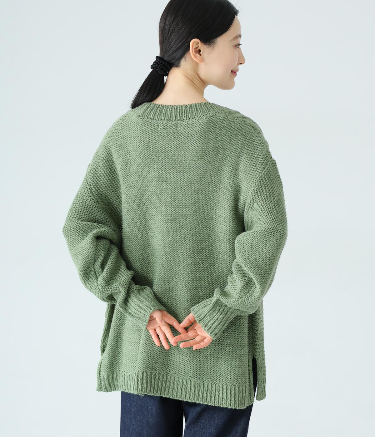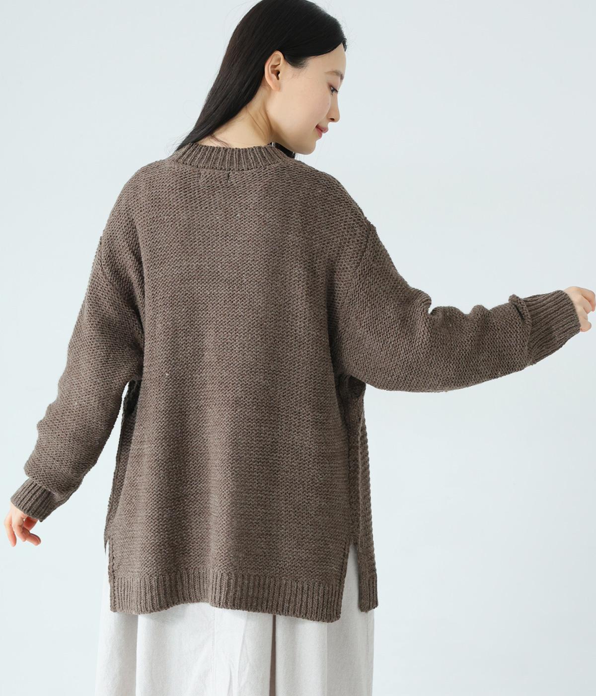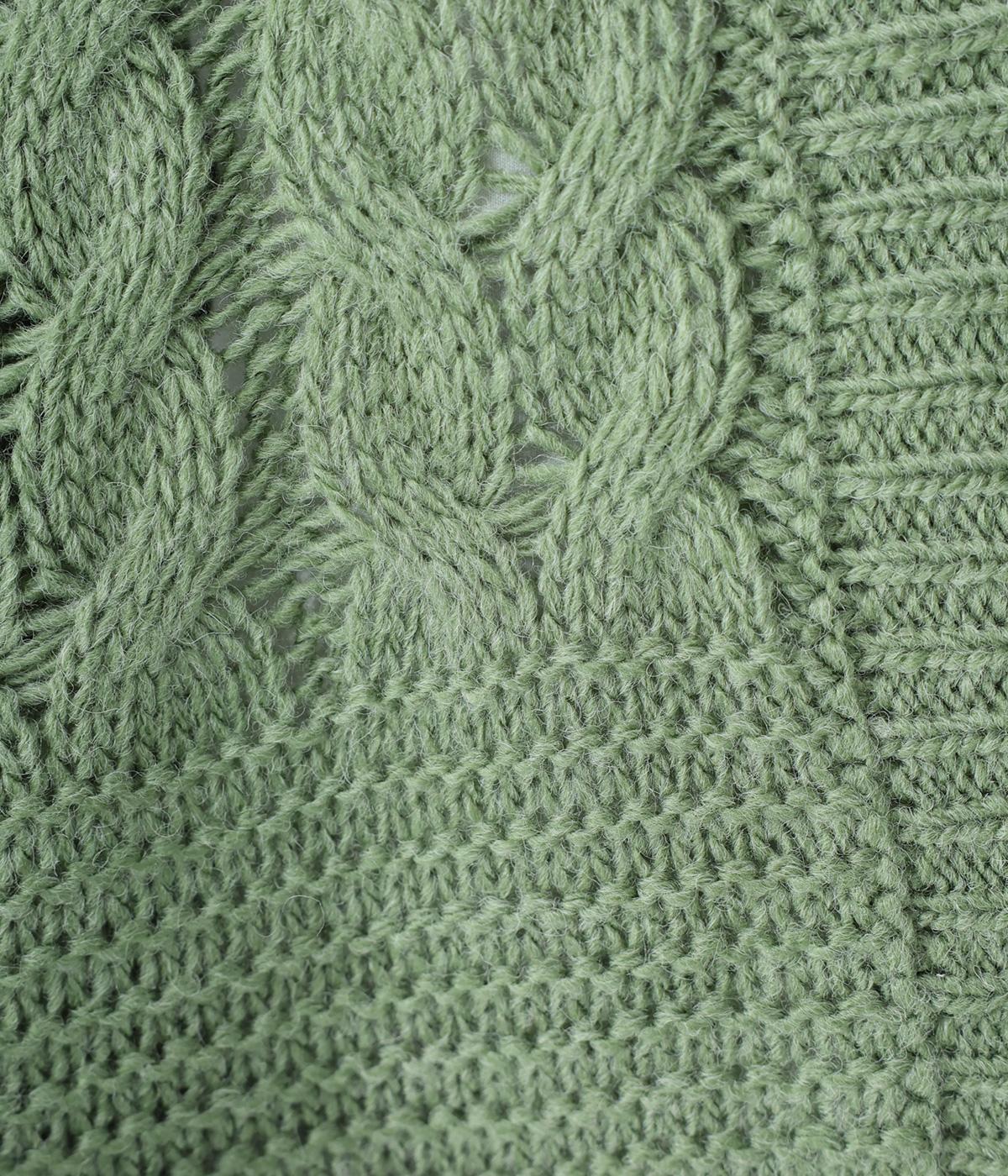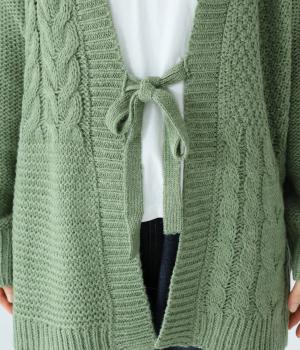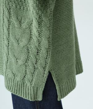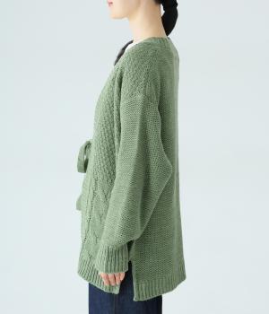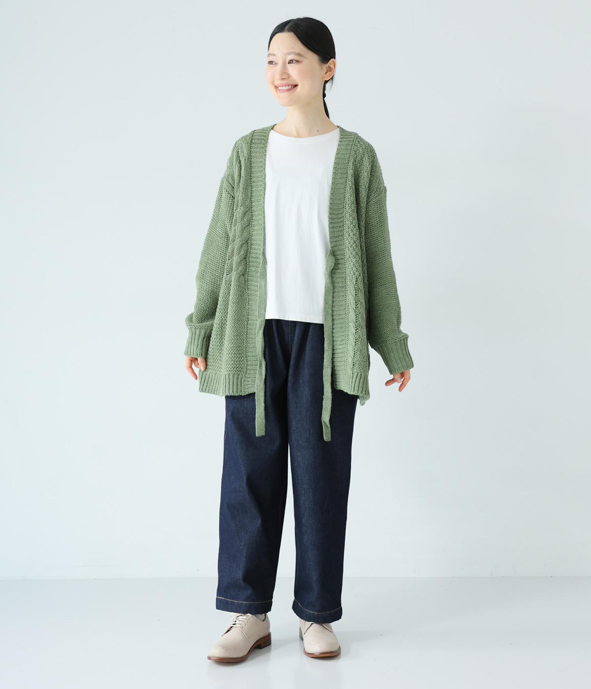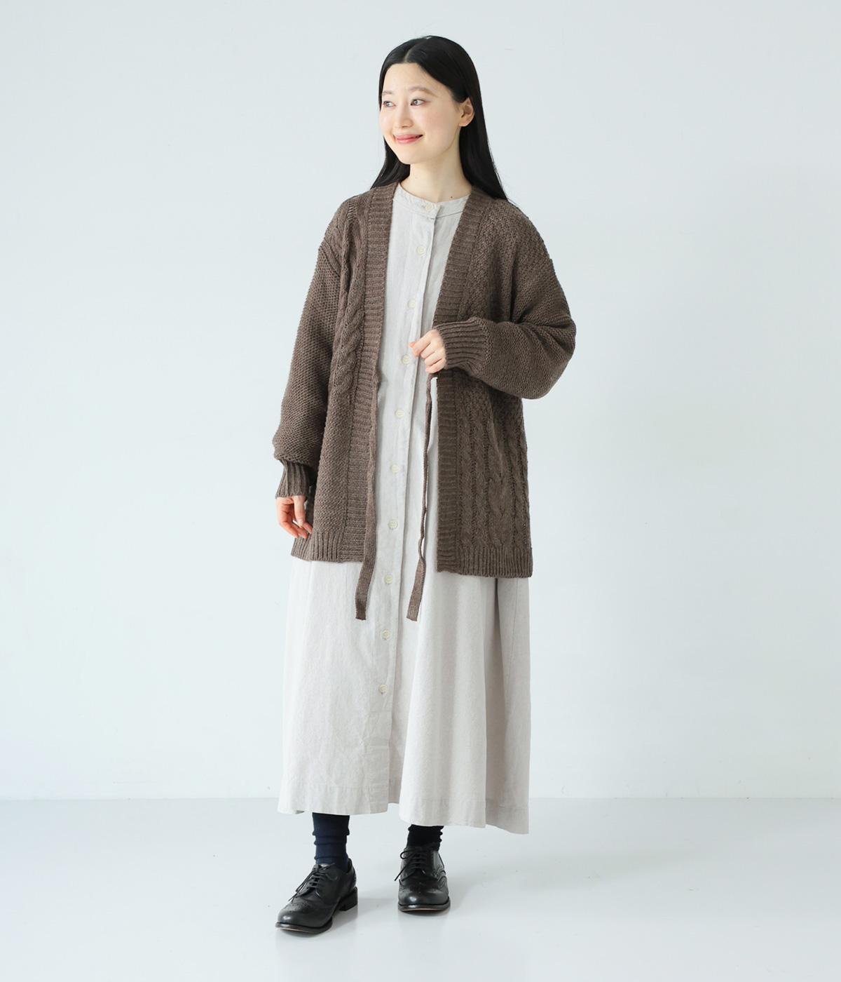 アシンメトリーで立体感のある編み模様が映えるケーブルニットカーディガン。ボタンレスの前立てとゆとりのあるシルエットがリラクシーなムードを運びます。フロントの紐はきゅっとリボン結びして愛らしい印象に。裾両サイドのスリットもポイントです。
