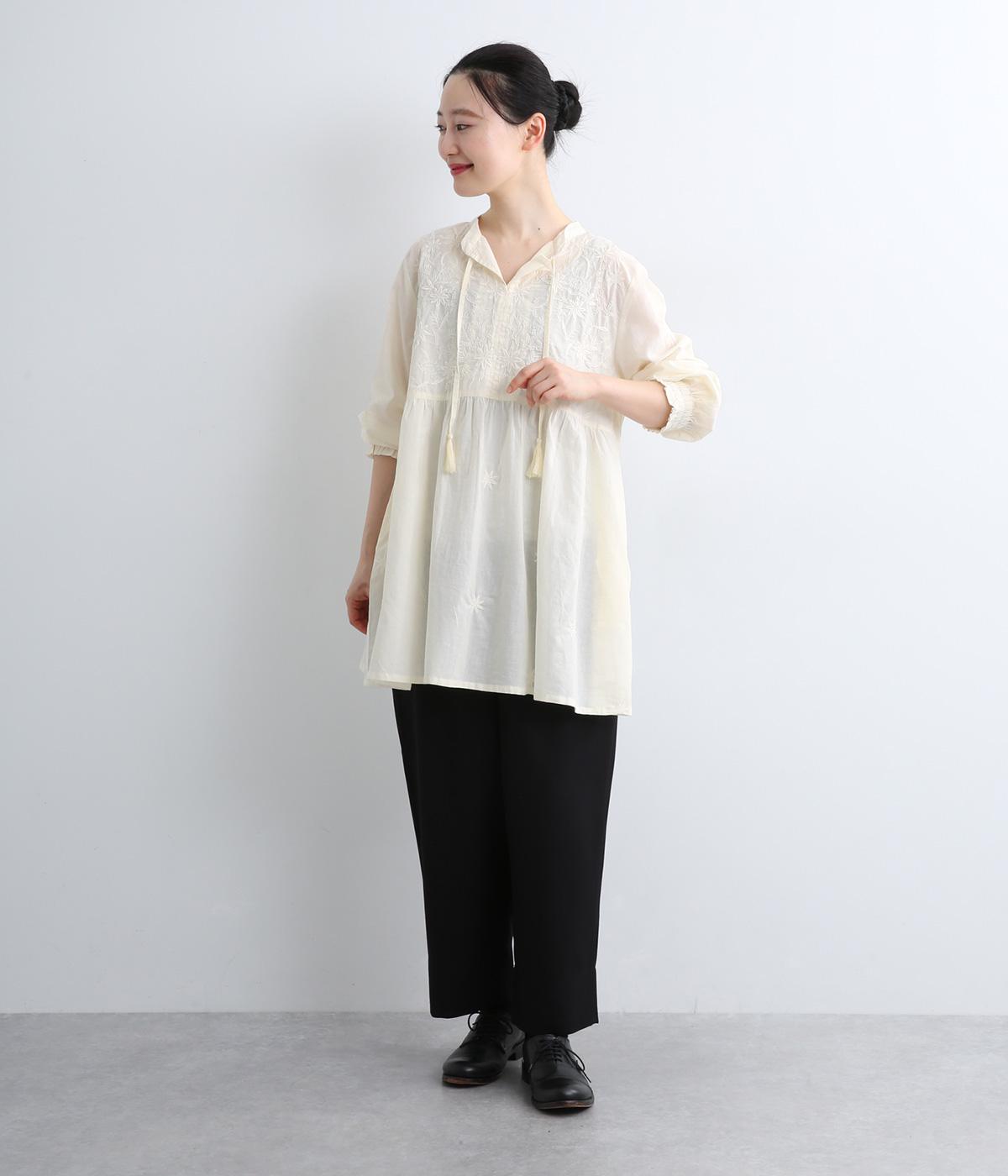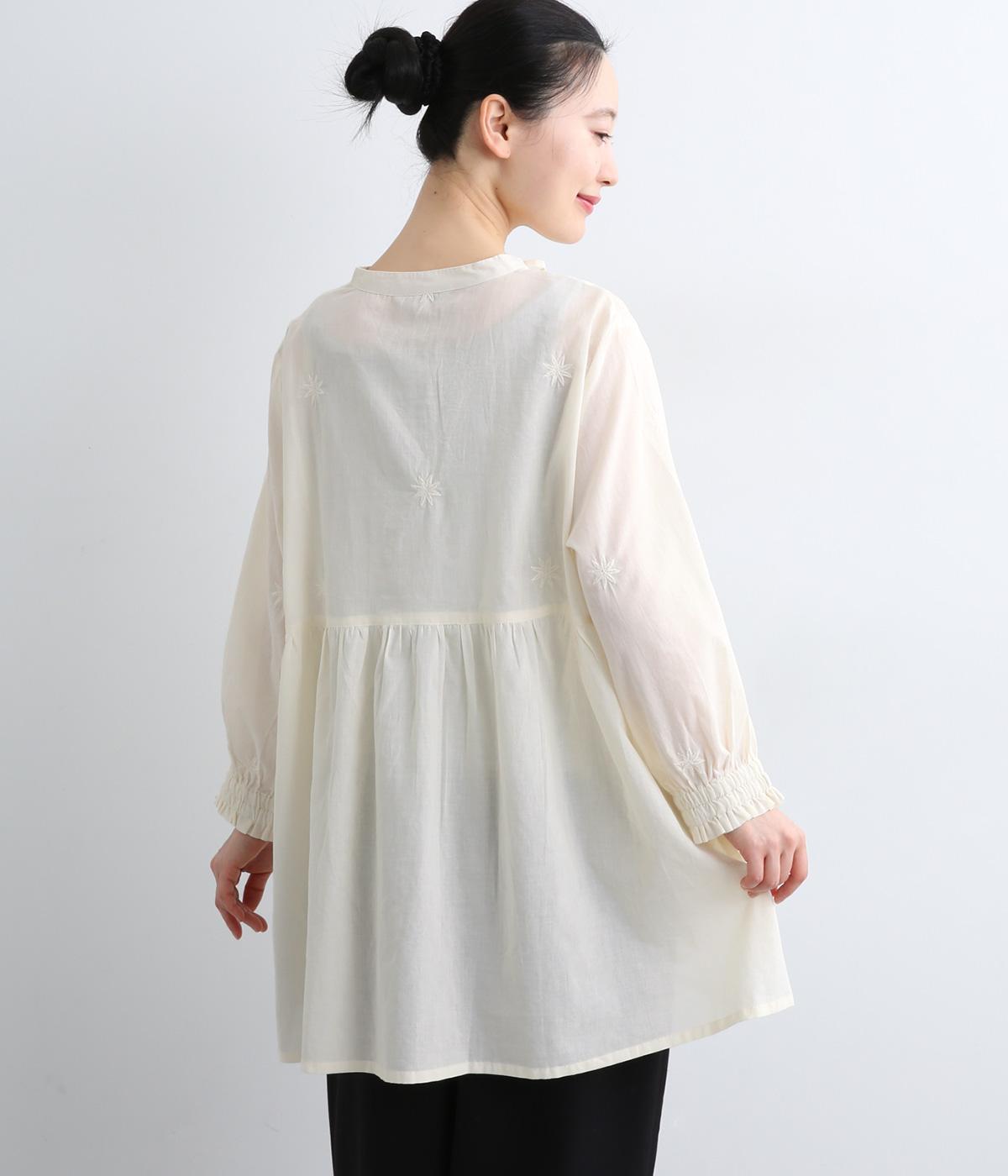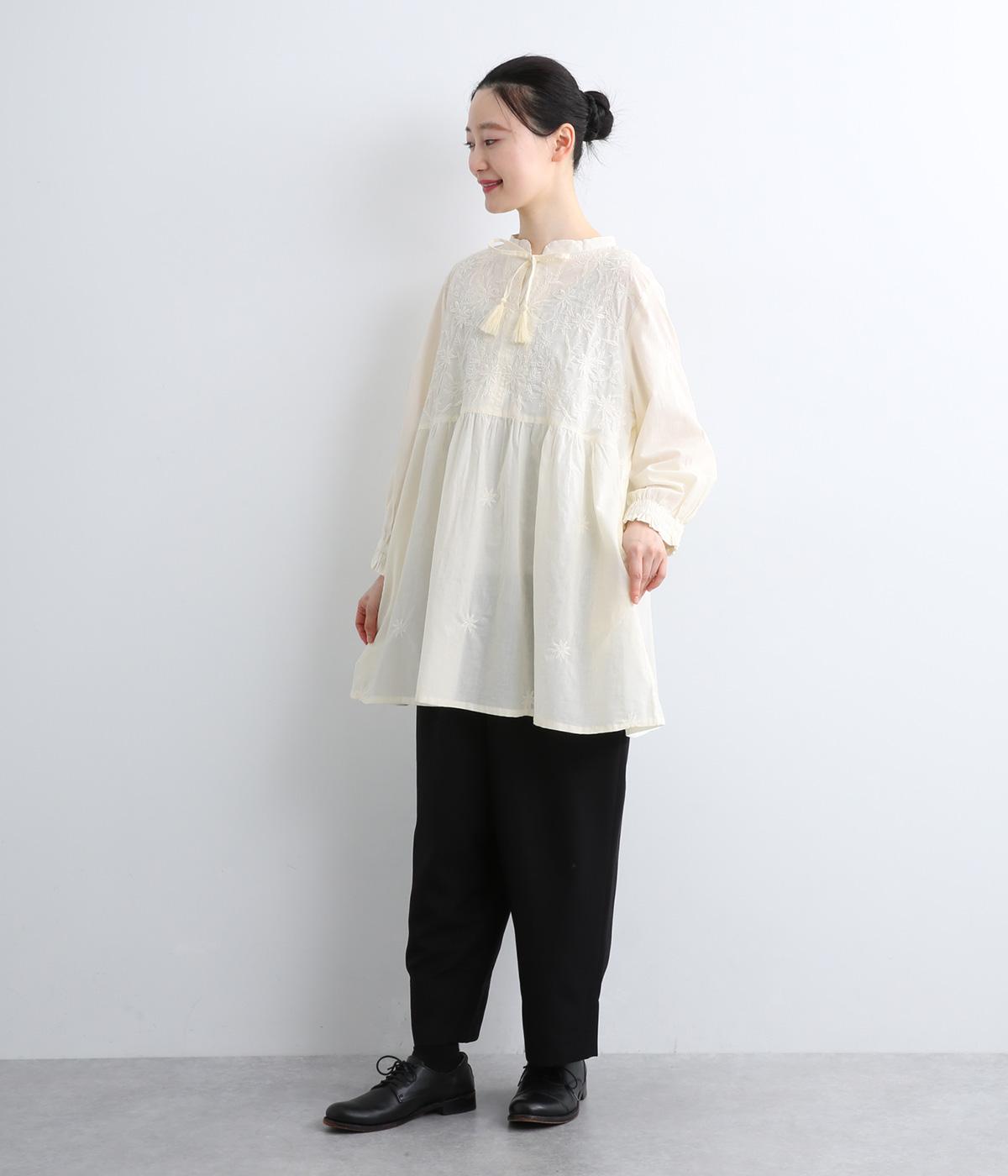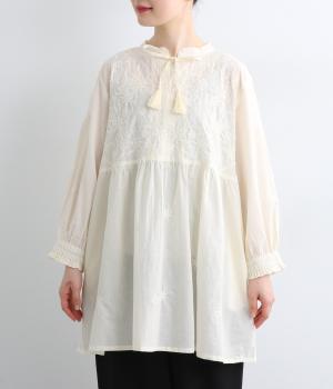 デイリーに着まわしやすいよう、フラワー刺しゅうをベースと同色の糸で仕上げたコットンチュニック。前後ヨーク下の細かなギャザーから広がるふんわりとしたシルエットが素敵です。お尻まですっぽりと隠れる着丈が気になる体のラインをカバーしてくれます。