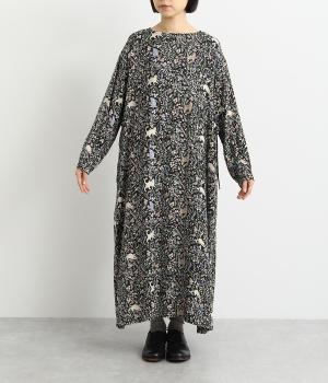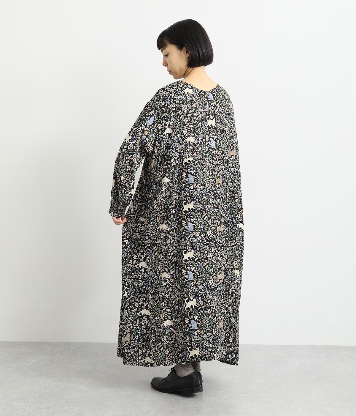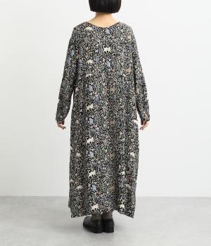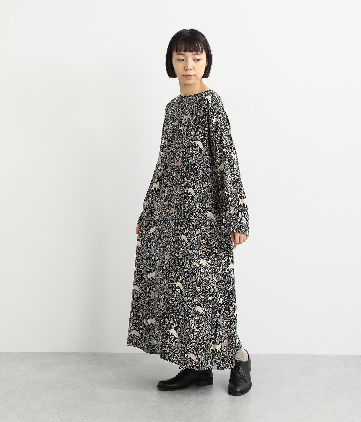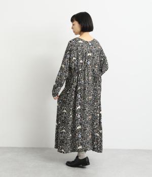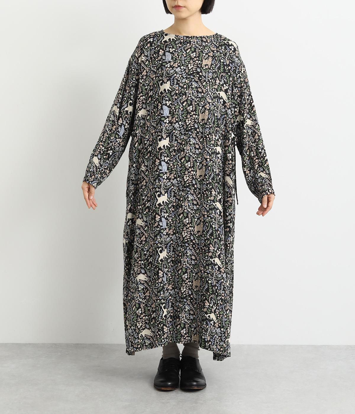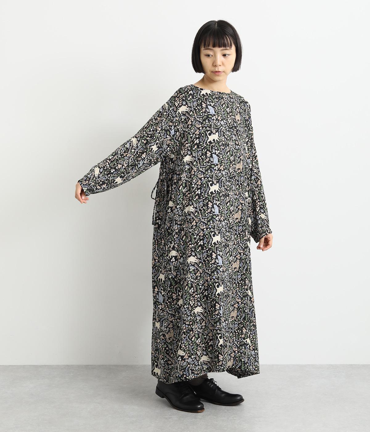 前後どちらでも着られる2wayタイプのワンピースです。ウエスト部分が紐で調整でき、ふんわりしたシルエットもストンとした落ち感も楽しめます。個性的なプリントながらもシックな色味で日常に取り入れやすい一枚です。