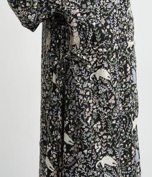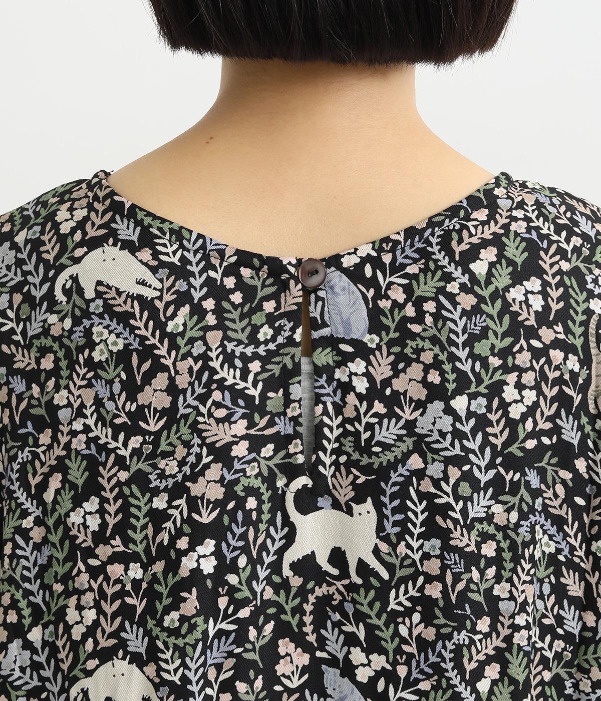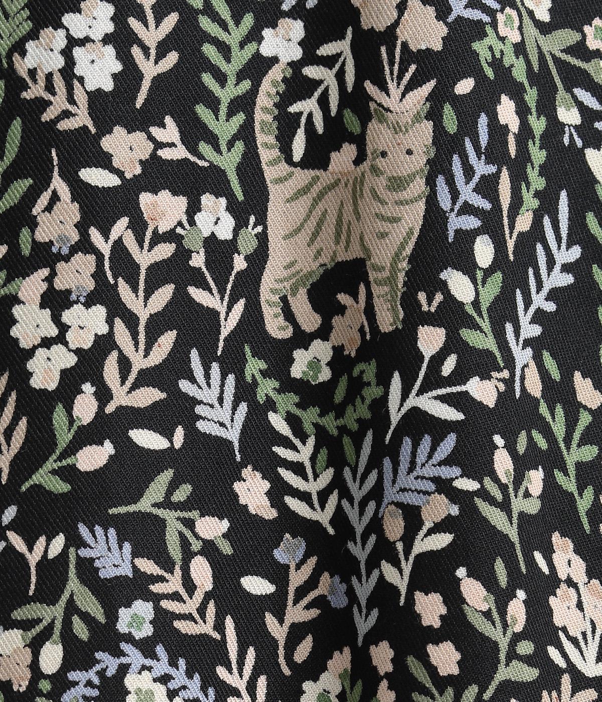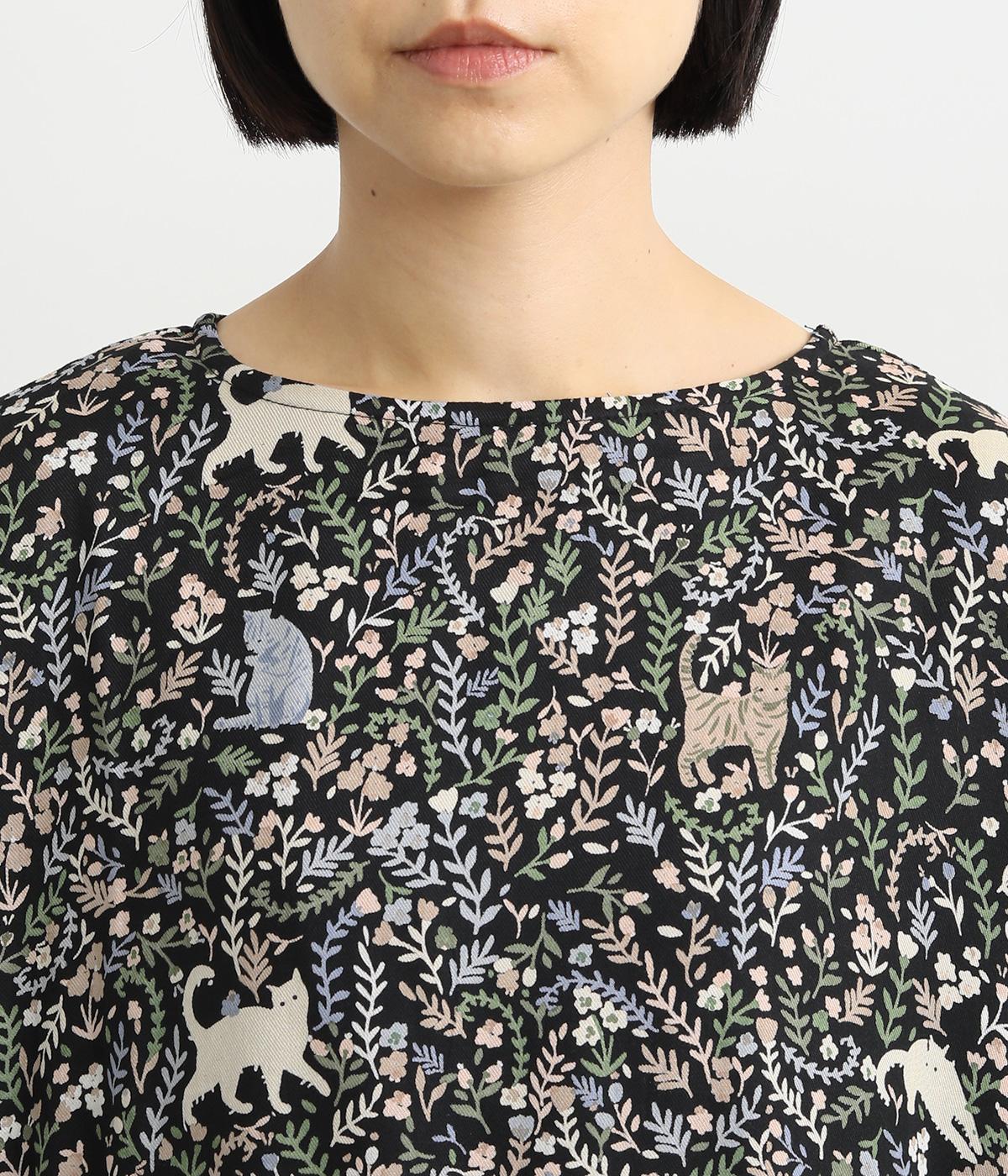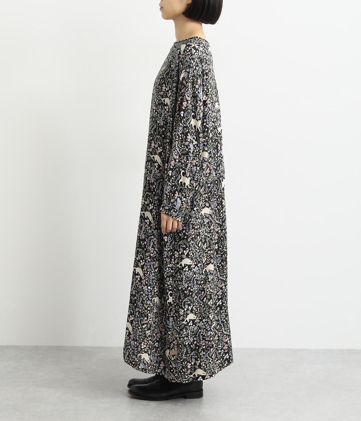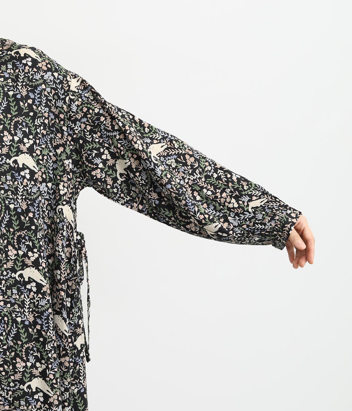 前後どちらでも着られる2wayタイプのワンピースです。ウエスト部分が紐で調整でき、ふんわりしたシルエットもストンとした落ち感も楽しめます。個性的なプリントながらもシックな色味で日常に取り入れやすい一枚です。