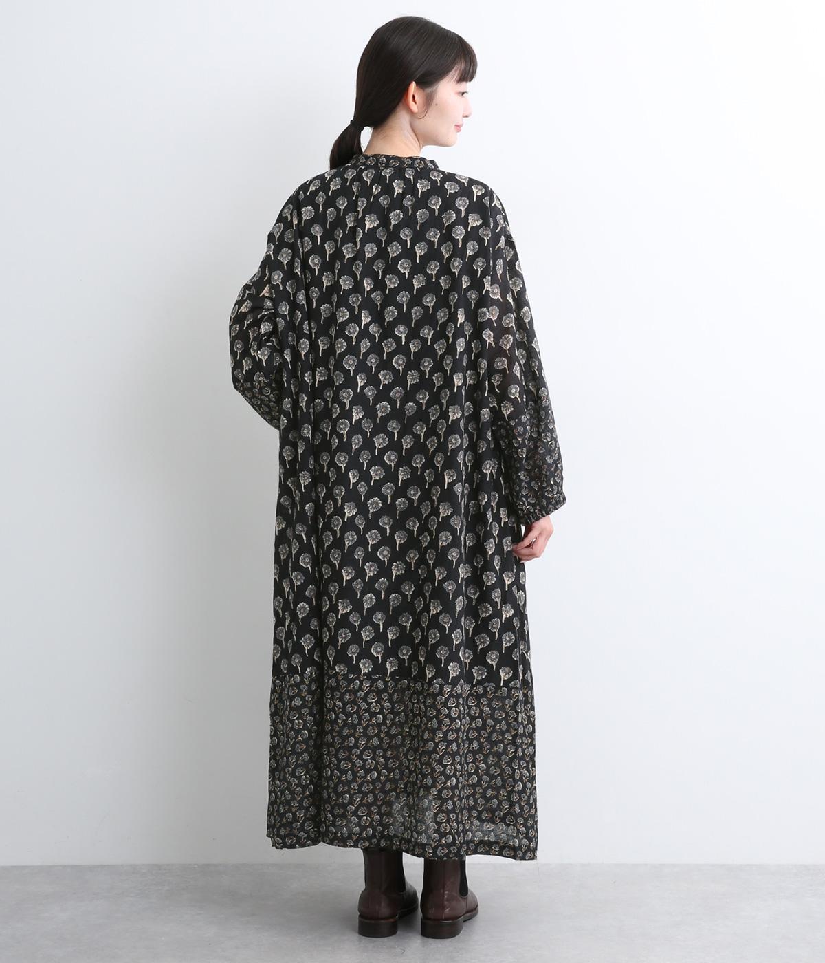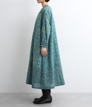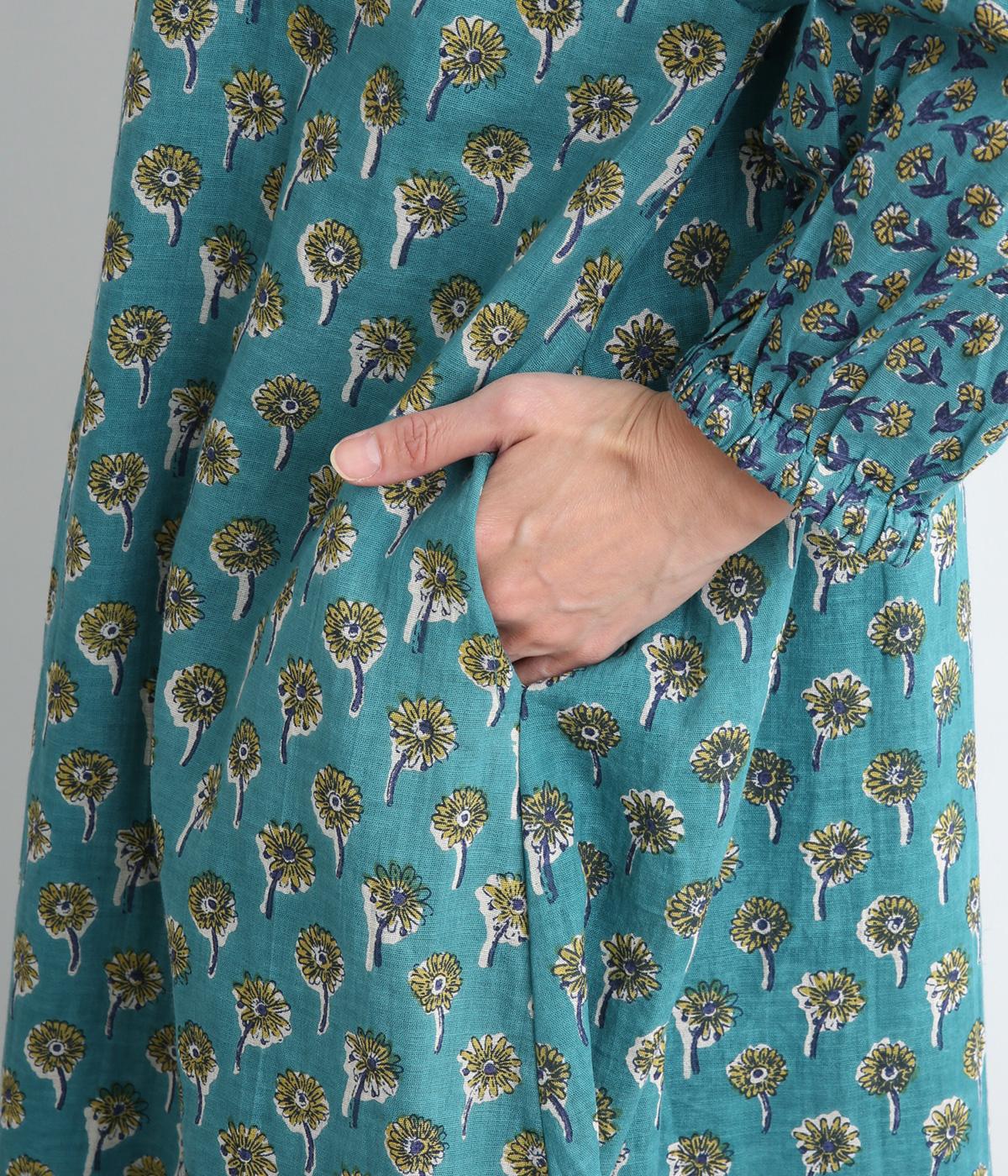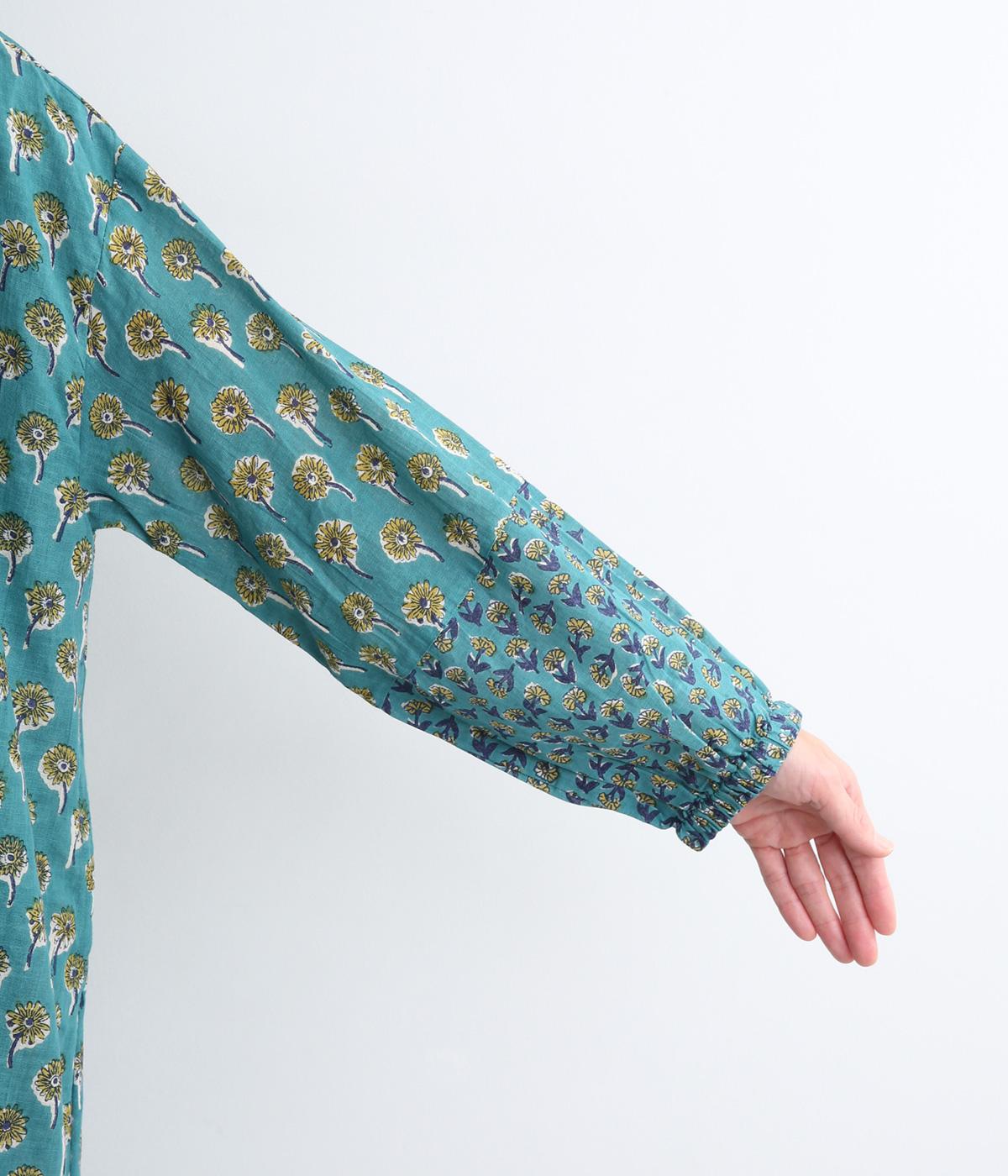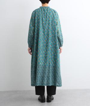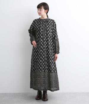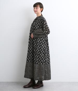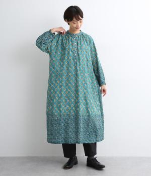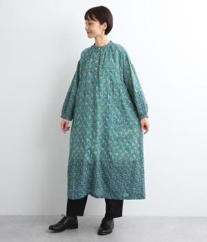 裾と袖先、襟ぐりや前立てを大きさの異なるフラワー生地で切り替え表情豊かに仕上げたワンピース。ふわりと広がるフェミニンなシルエットが気になる体のラインをカバーしてくれます。袖口にはゴムを通しているのでたくし上げも簡単。便利なサイドポケットつきです。