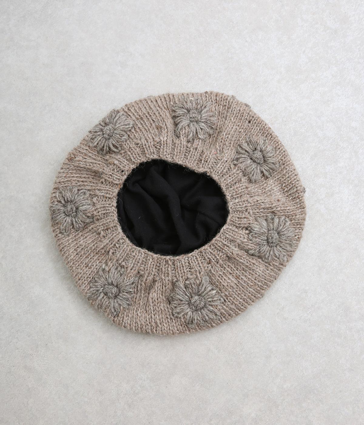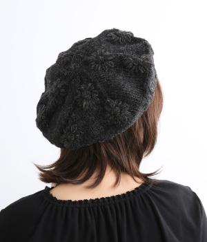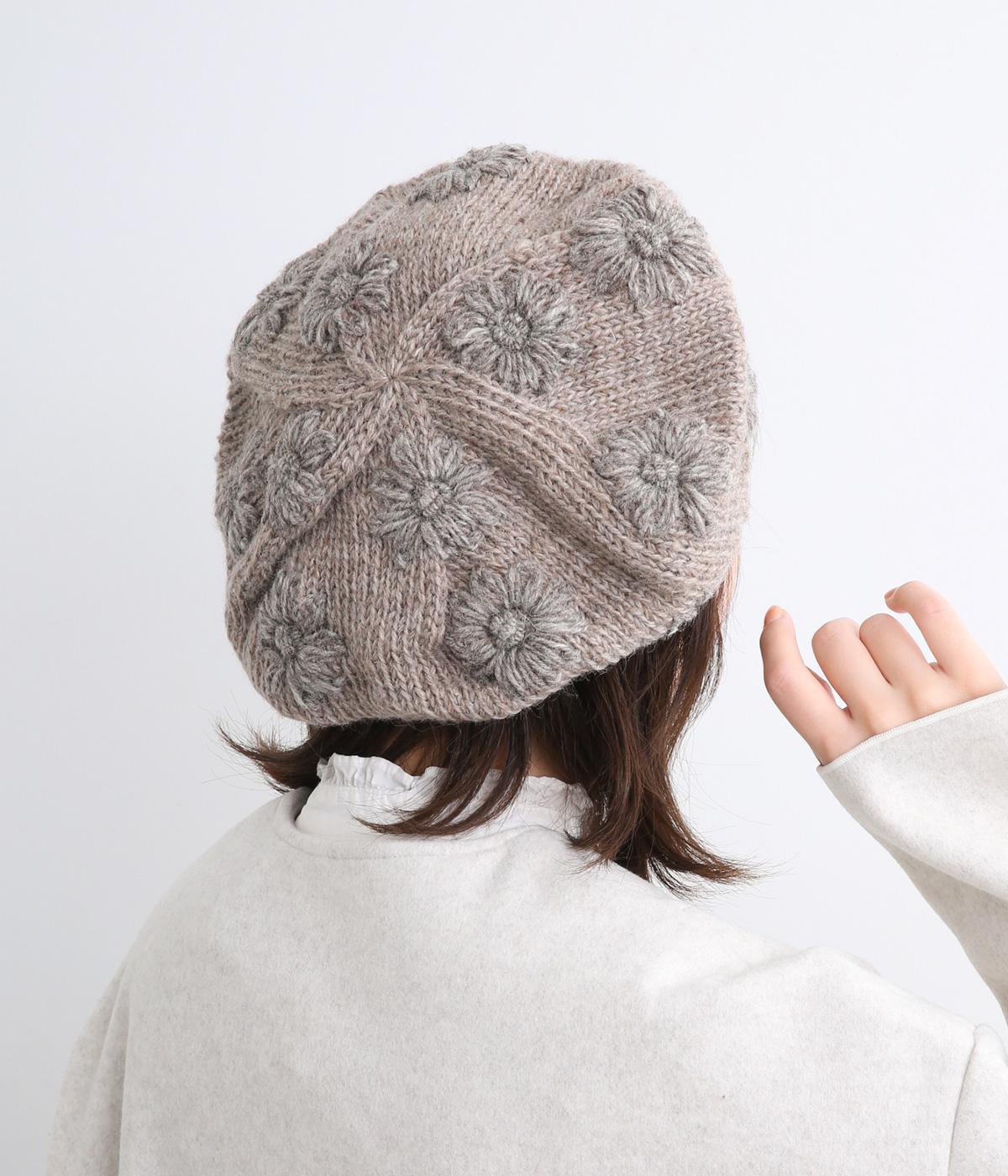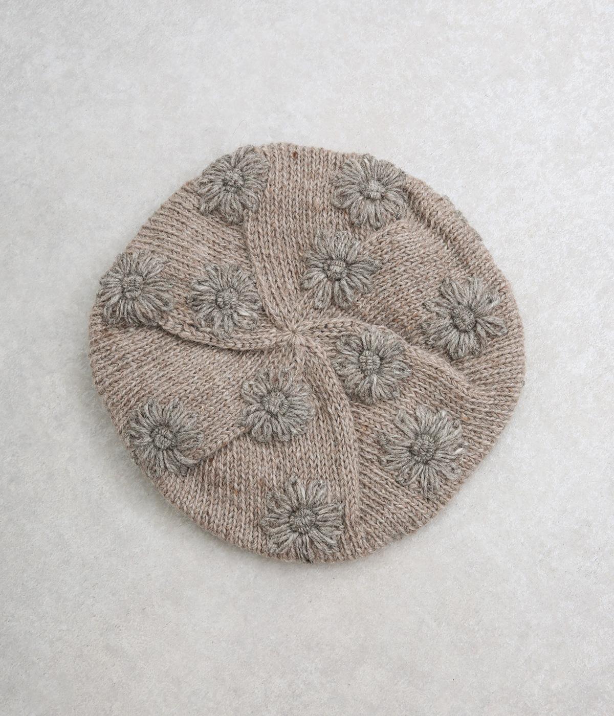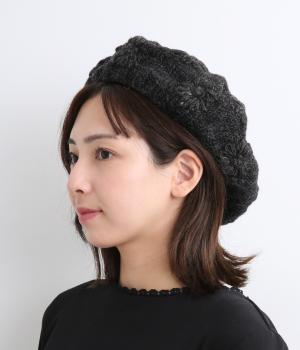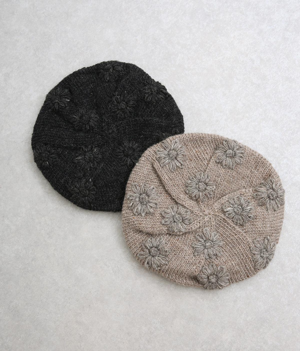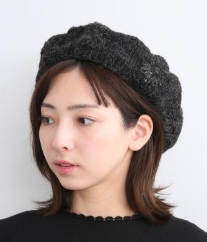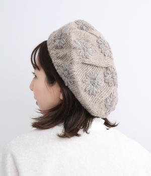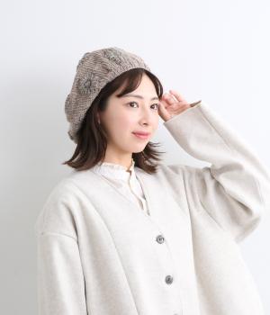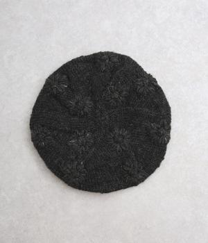 お花のワンポイントのミモザ刺繍を施したシャギーのベレー帽。刺繍は横長の図案を採用し、耳にお花を挿しているようなデザインに仕上げました。素材感が可愛らしく、秋から冬にかけてコーディネートのポイントになるアイテムです。
